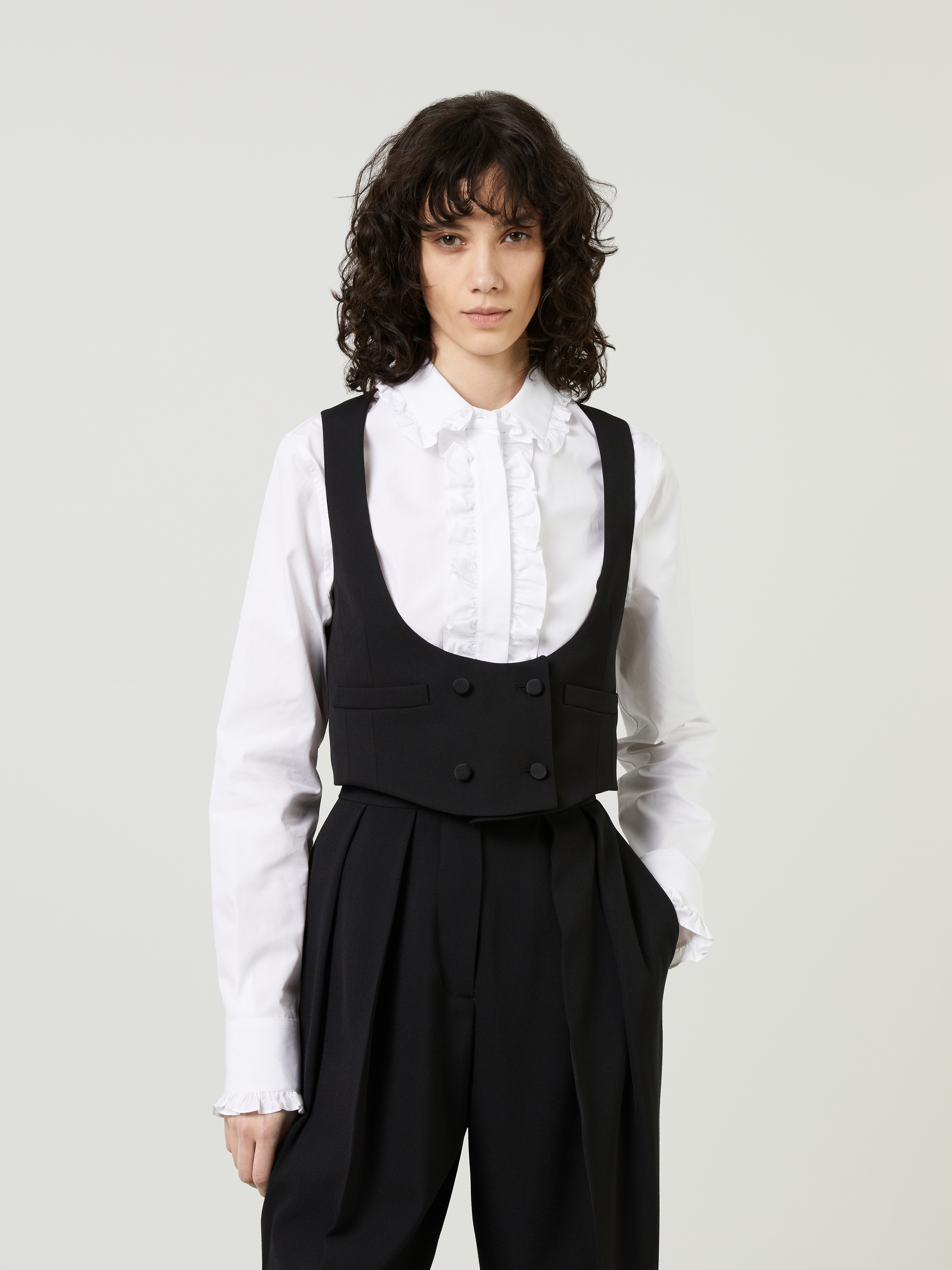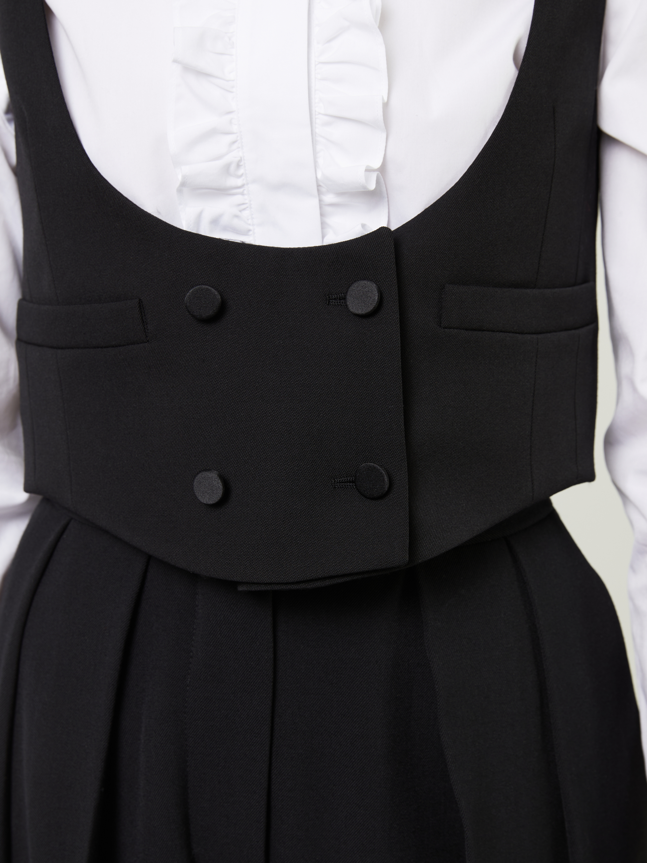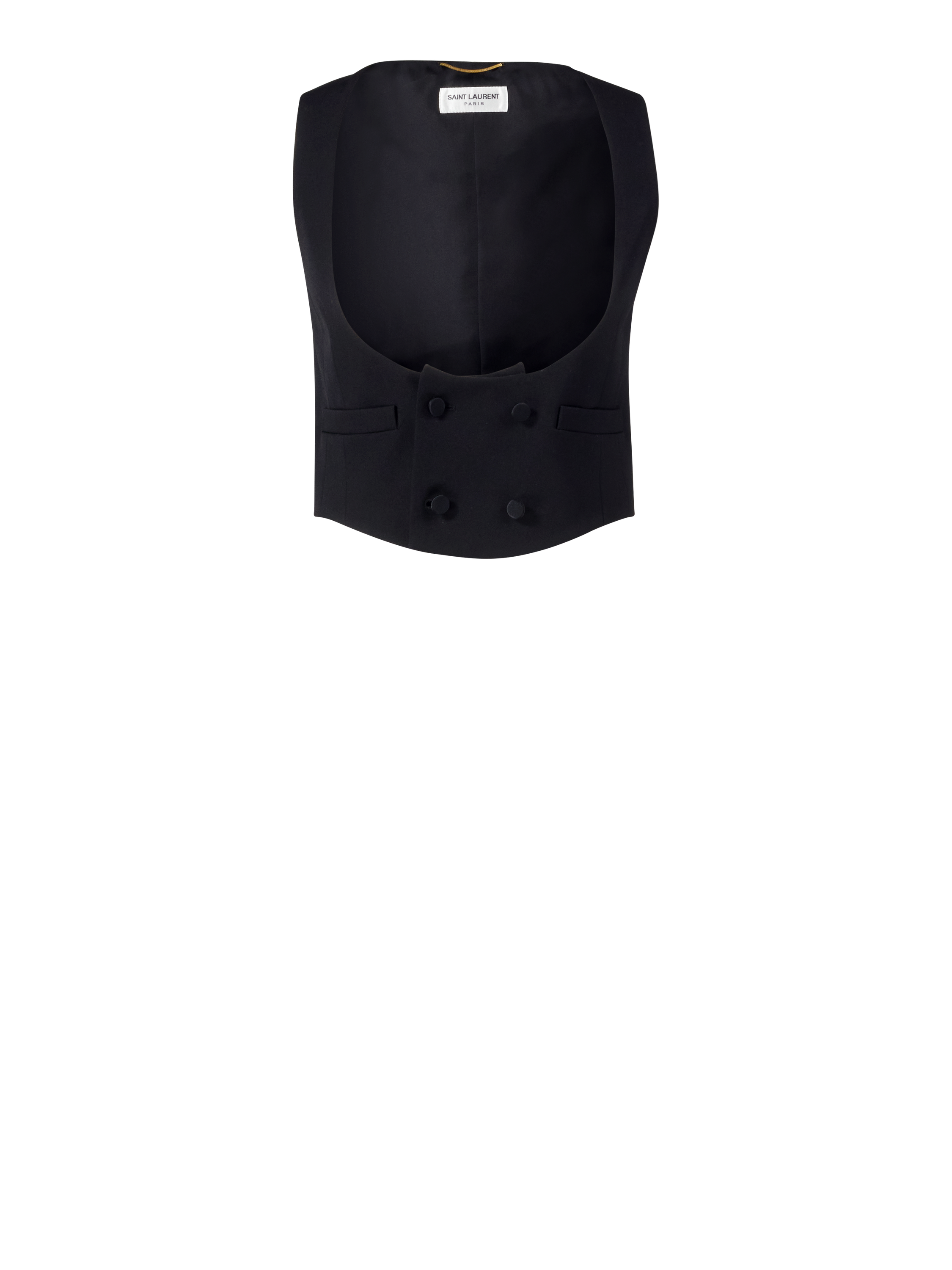 Diese Weste in Schwarz von Saint Laurent wurde aus reiner Wolle gefertigt und besticht durch eine Smokingoptik. Der tiefe Rundhalsausschnitt, die zweireihige Knopfleiste und die Leistentaschen vollenden diesen edlen Klassiker.