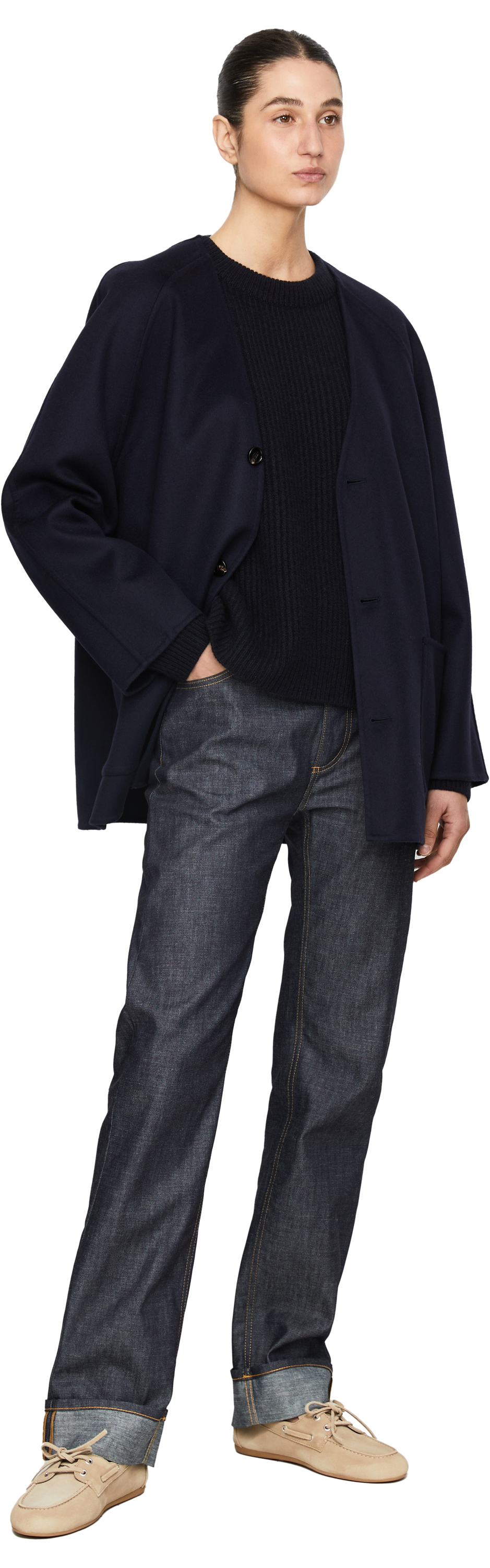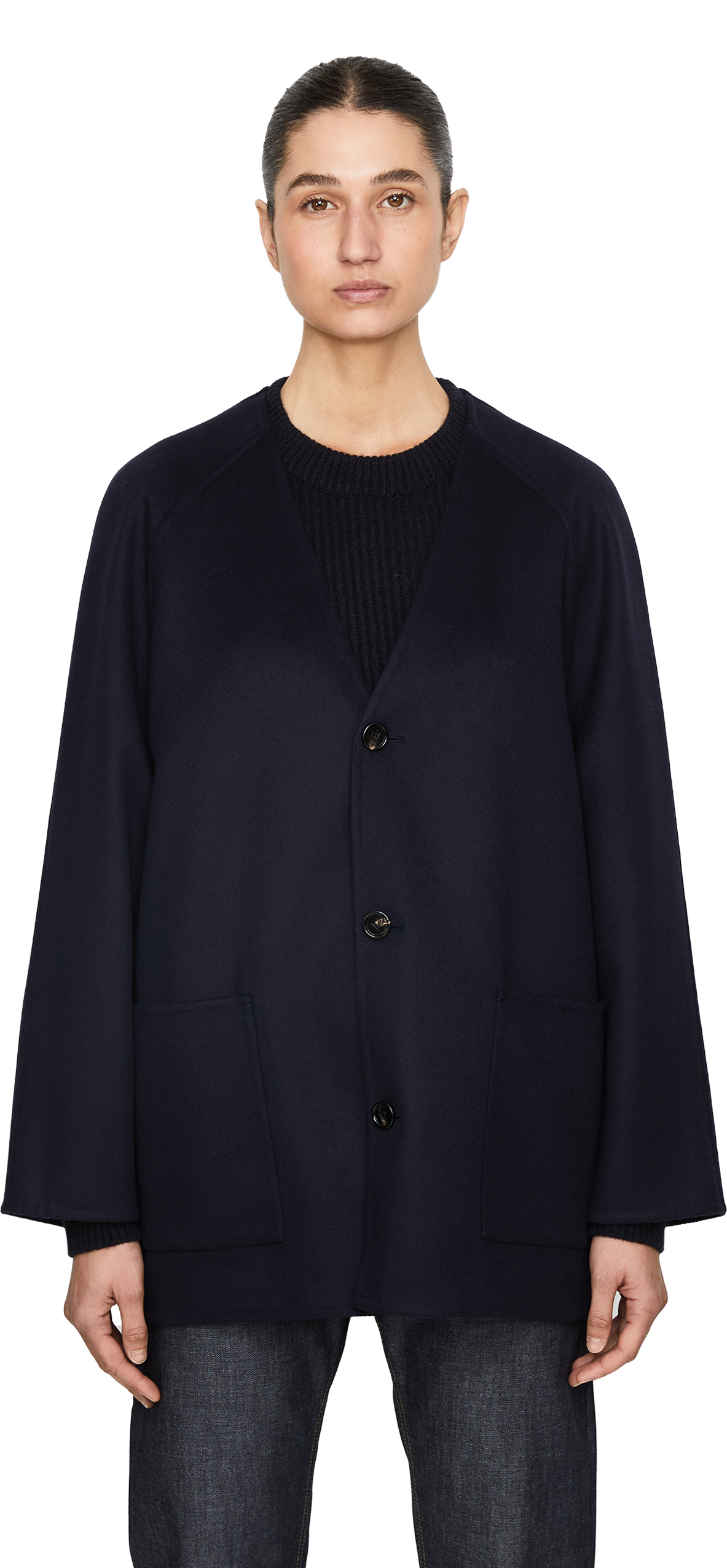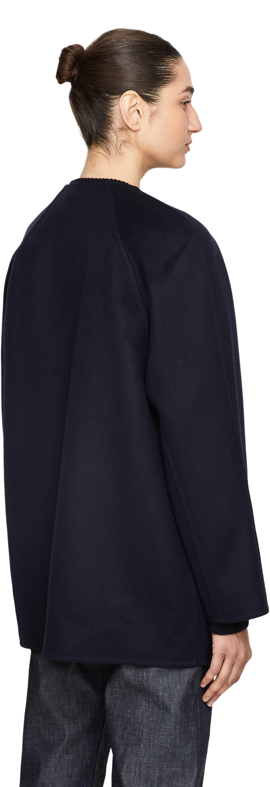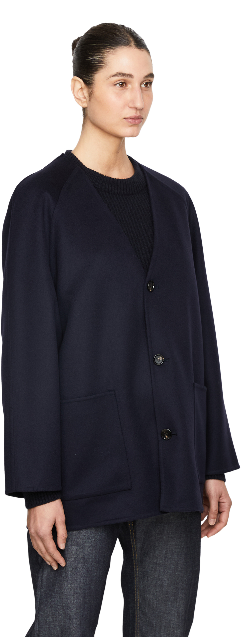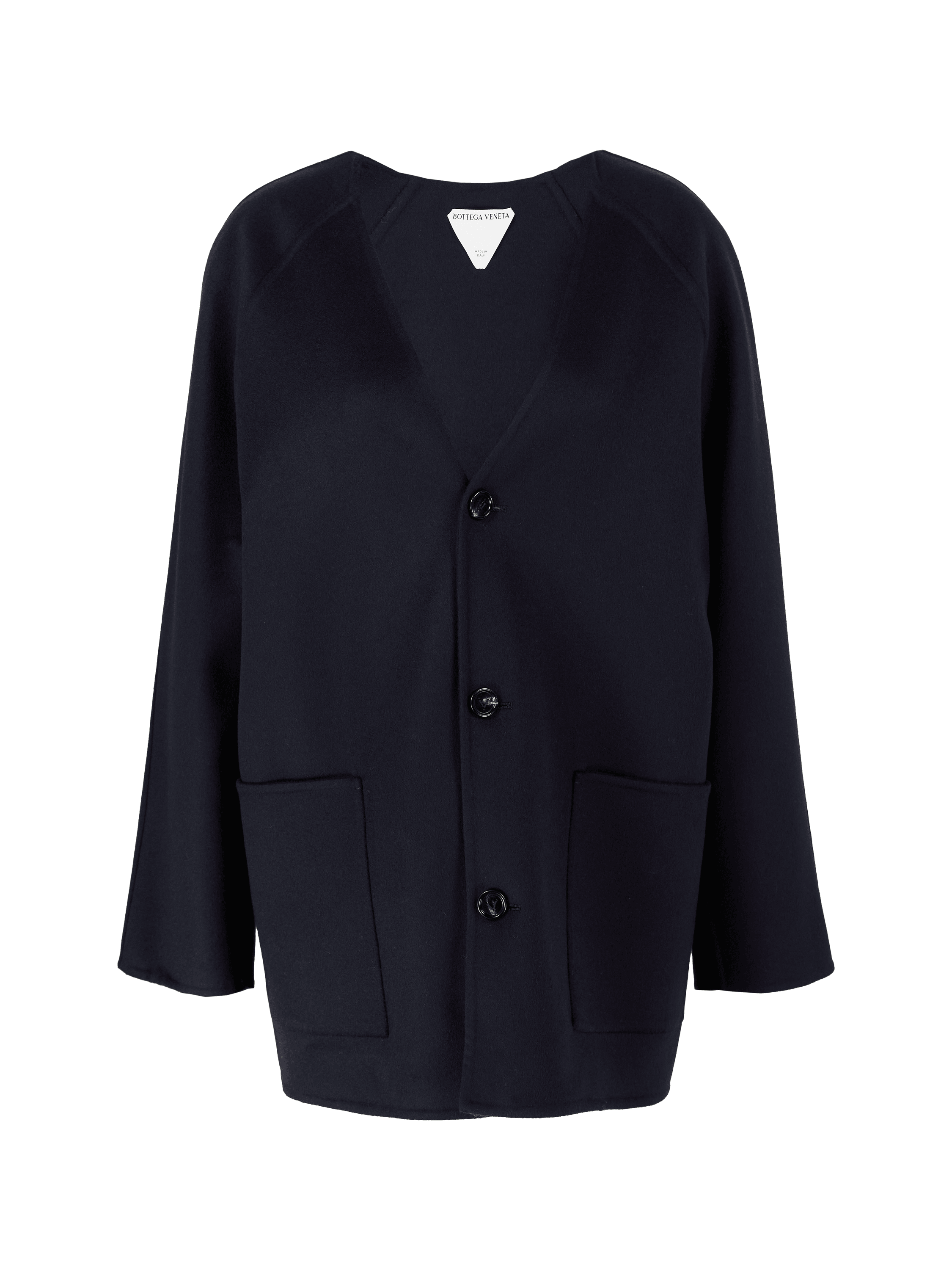 Diese Jacke in Marineblau von Bottega Veneta wurde aus einer Woll-Cashmere-Mischung gefertigt und besticht durch die gerade Silhouette. Die frontale Knopfleiste und die aufgesetzten Eingrifftaschen vollenden dieses minimalistische Design.