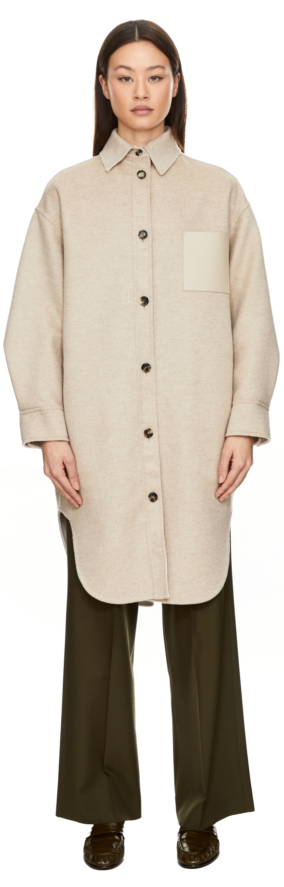 Dieser Mantel in Beige von LOEWE wurde aus einer Doubleface-Woll-Cashmere-Mischung gefertigt und besticht durch die weiche Haptik. Die übergroße Passform, die mittlere Länge, der klassische Kragen sowie die Ledertasche mit Anagram-Prägung auf der Brust zeichnen dieses Modell aus.