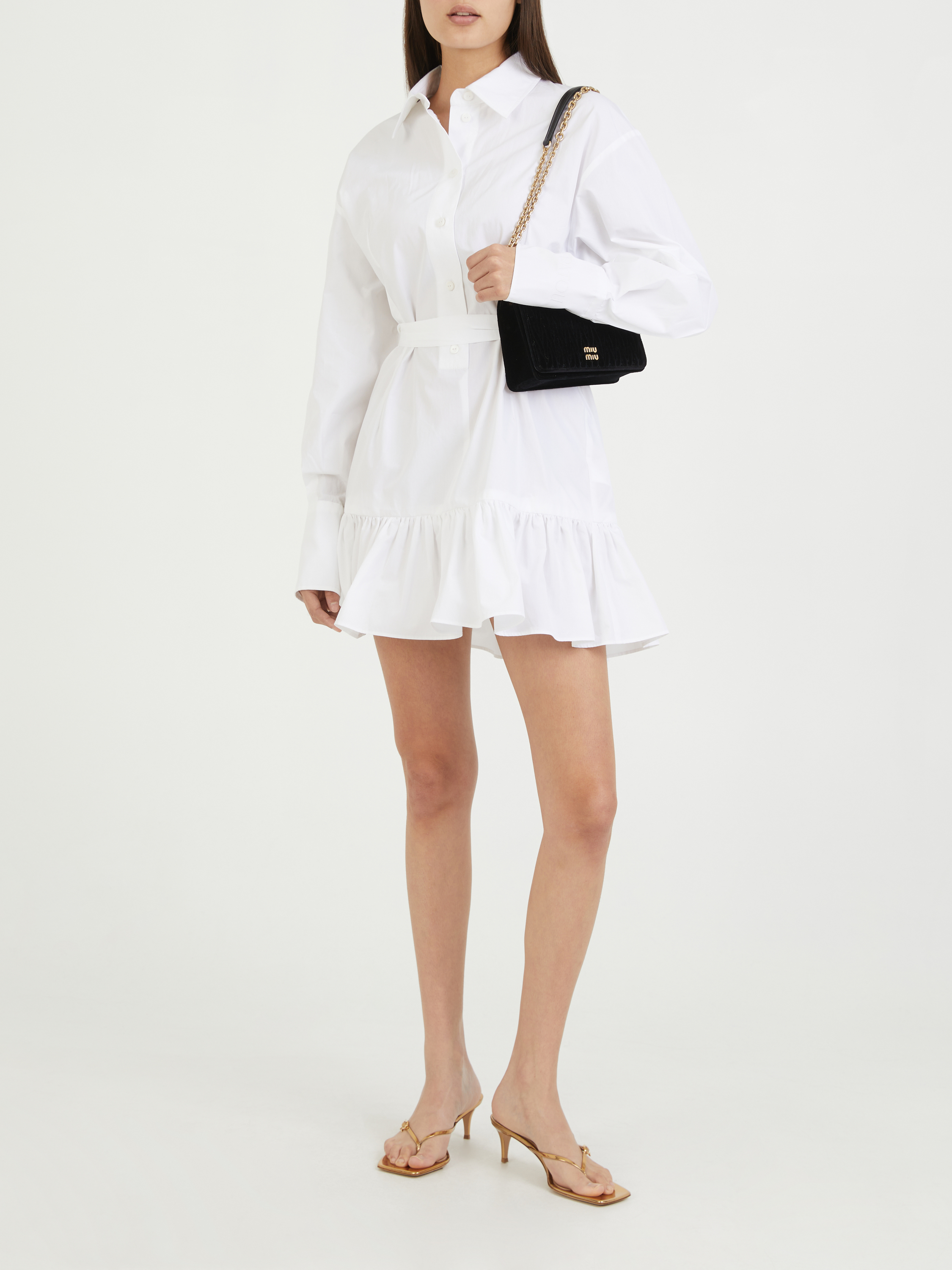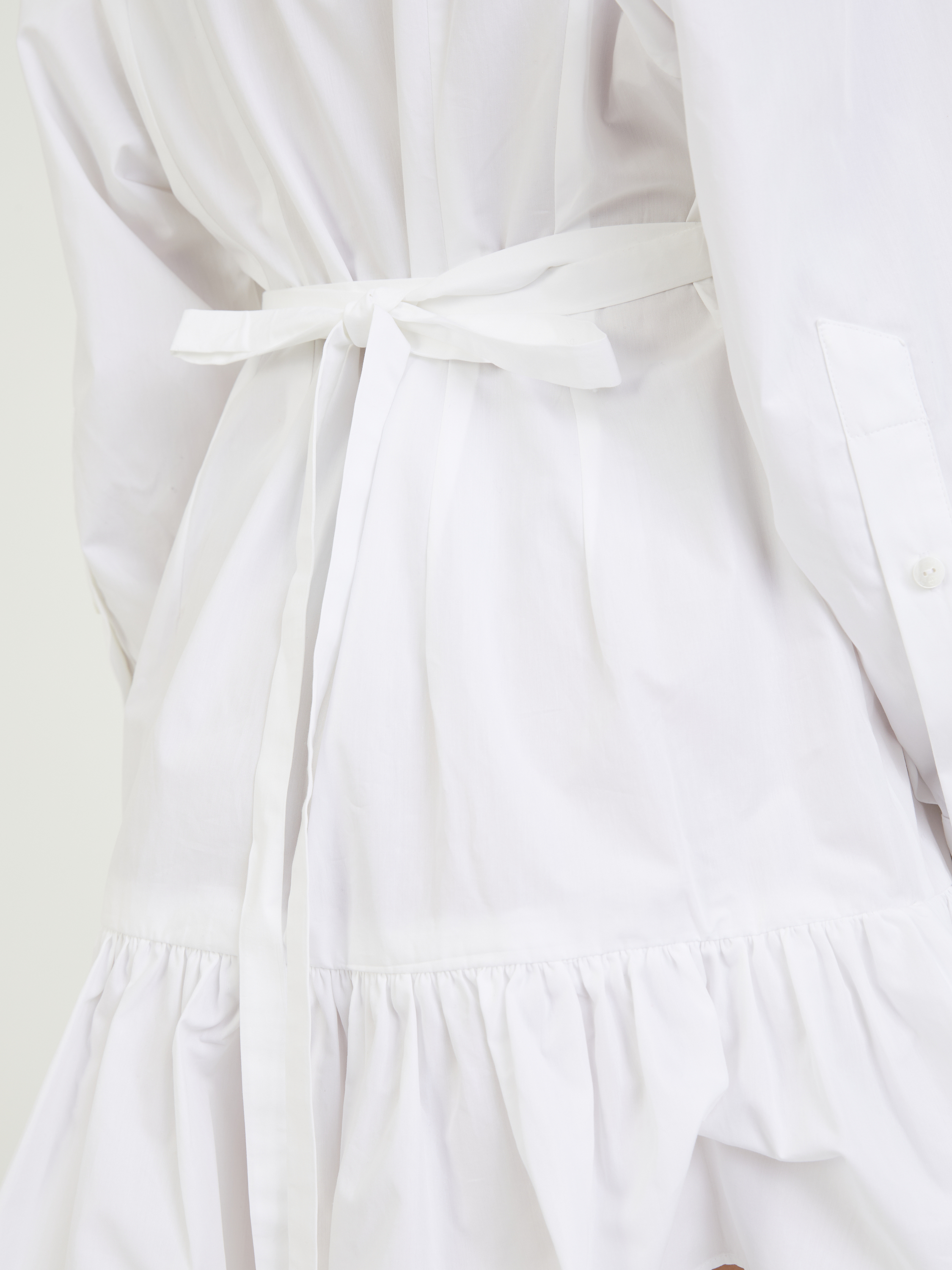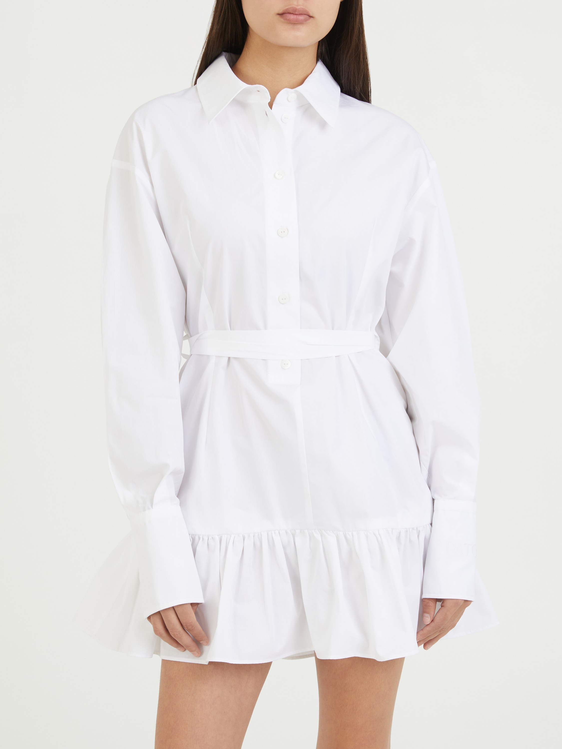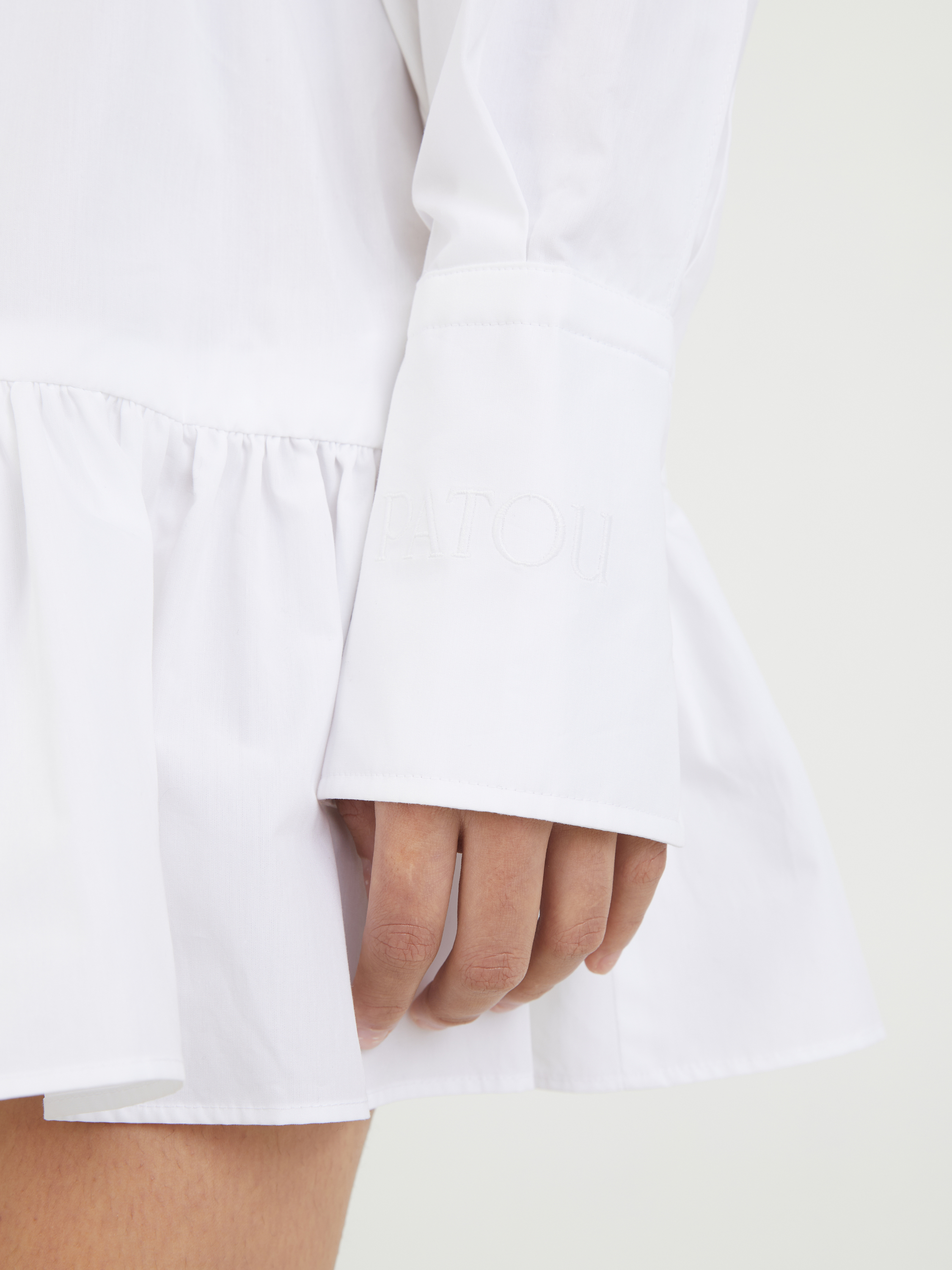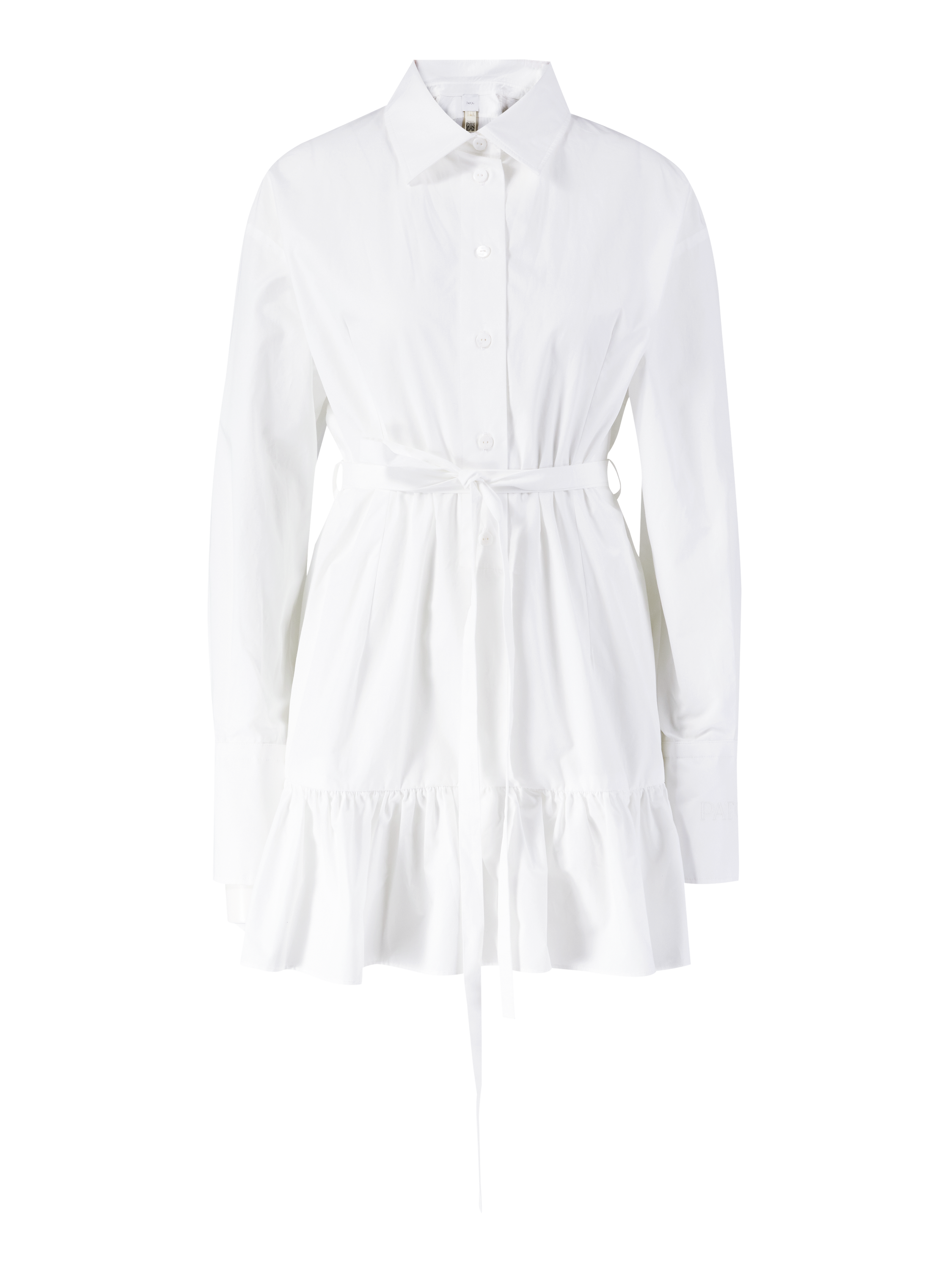 Dieses Kleid in Weiß von PATOU wurde aus hochwertiger Baumwolle gefertigt und besticht durch die Rüschen. Die frontale Knopfleiste, der Bindegürtel und die Minilänge zeichnen dieses Modell aus.