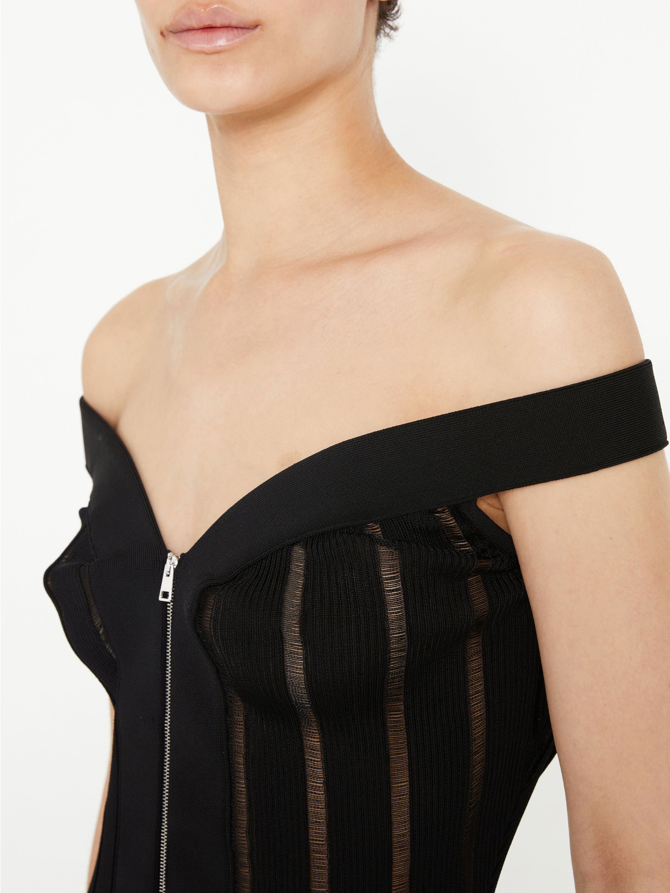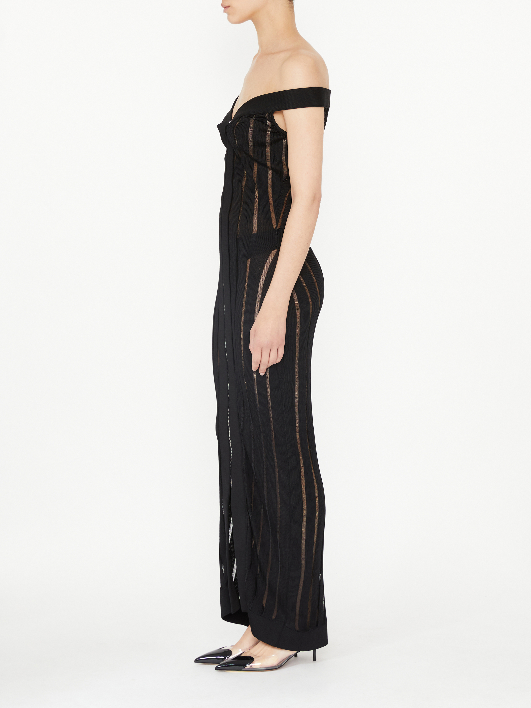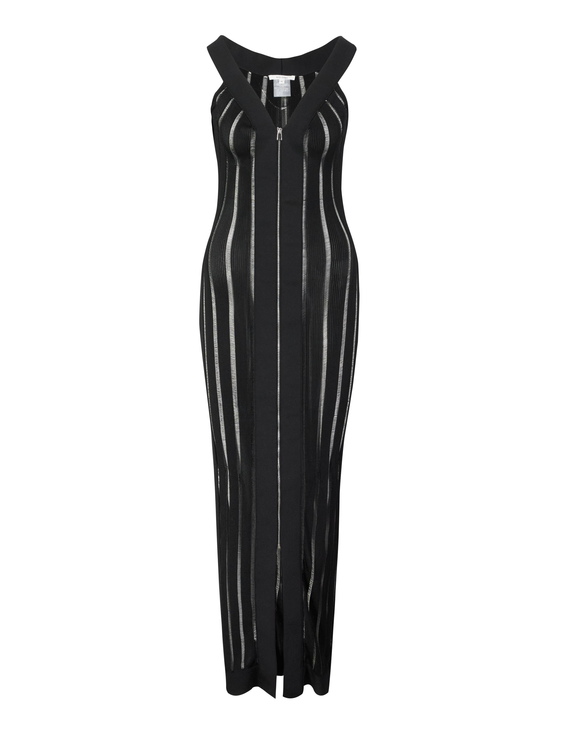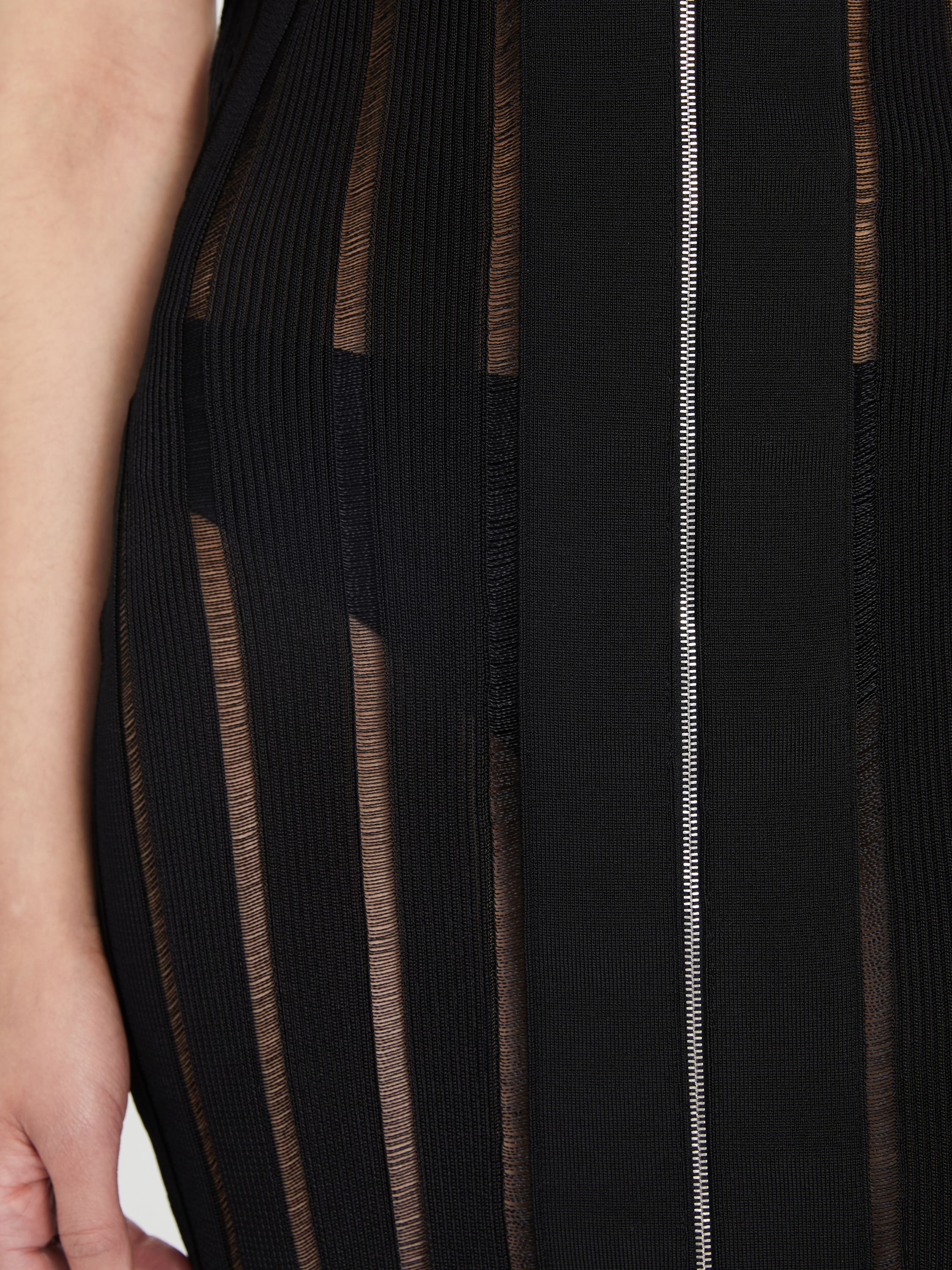 Dieses Kleid in Schwarz von NENSI DOJAKA wurde aus einem hochwertigen Material gefertigt und besticht durch das Semi-Transparente Material. Die körpernahe Silhouette und der durchgehende Reißverschluss auf der Vorderseite zeichnen dieses extravagante Modell aus.