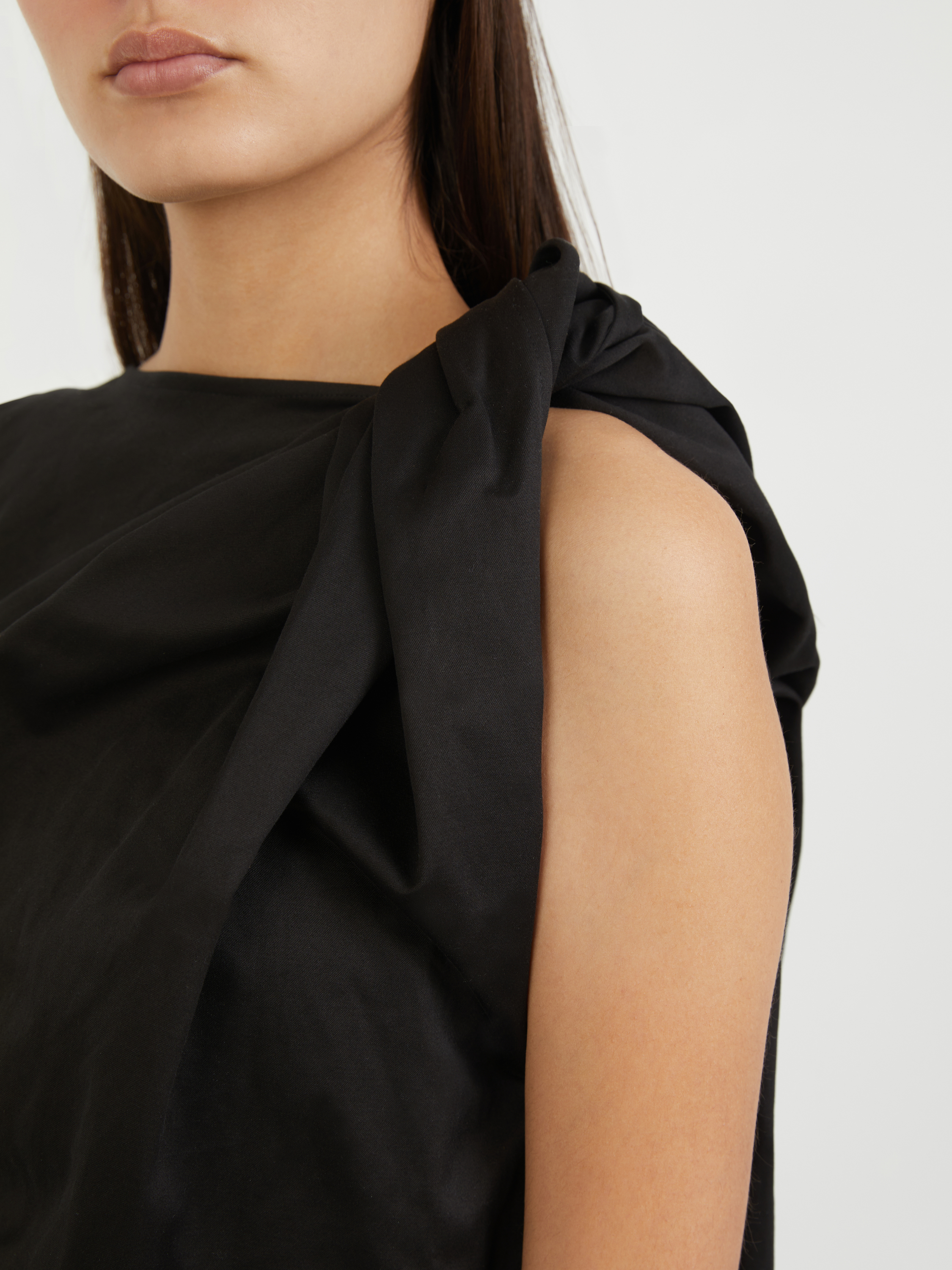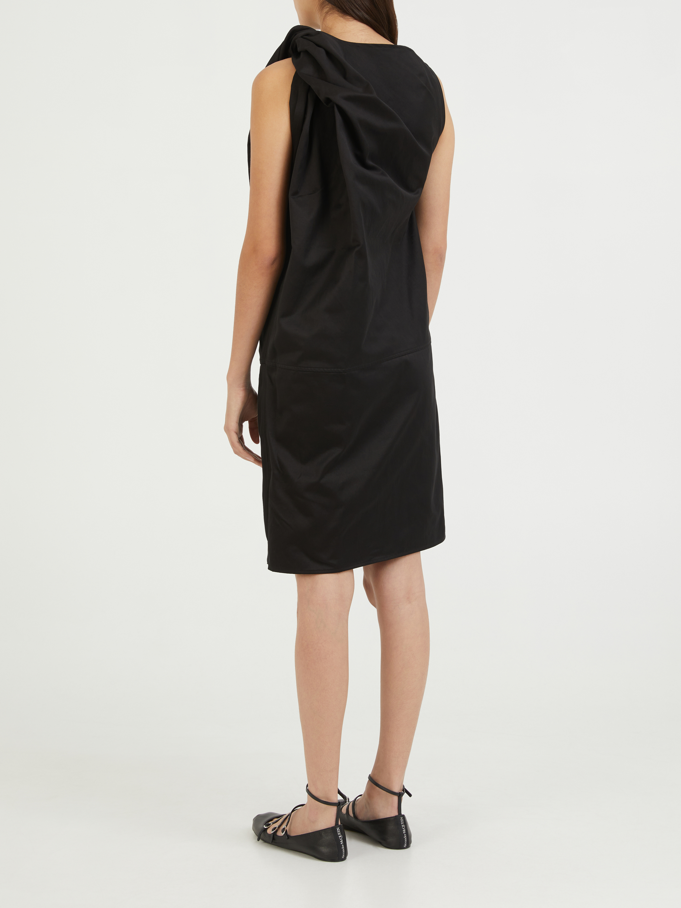 Das Kleid in Schwarz von TOTEME wurde aus einem hochwertigen Baumwoll-Leinen-Gemisch gefertigt und besticht durch einen verdrehten Träger. Das hochwertige Modell wird durch einen Midilänge, das feste Material und einen asymmetrischen Kragen perfektioniert.