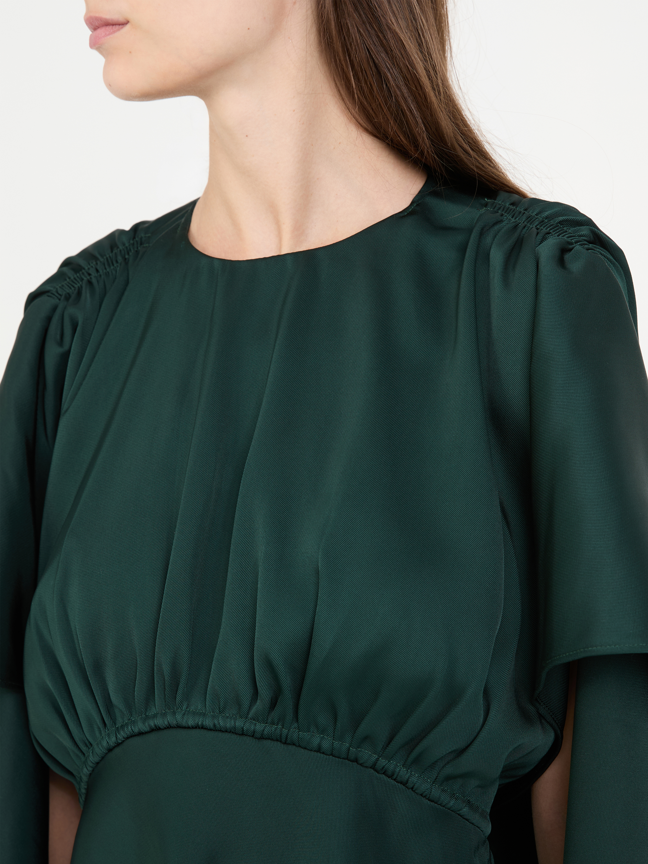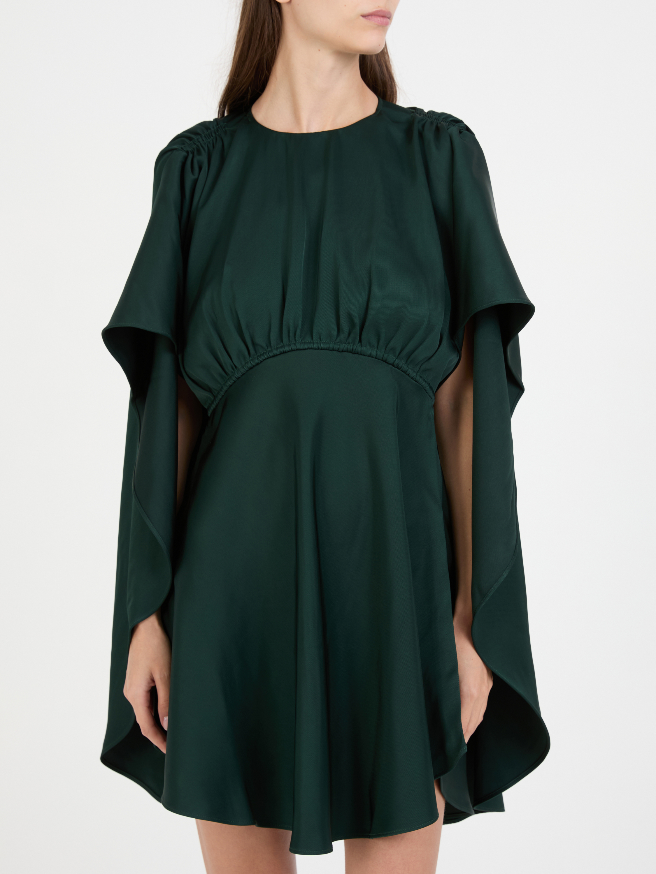 Das Kleid 'Eden Cascading' in Dunkelgrün von Zimmermann wurde aus einem hochwertigen Material gefertigt und besticht durch seine gerafften Details. Das Modell wird durch das Cape und die Volant-Ärmel perfektioniert.