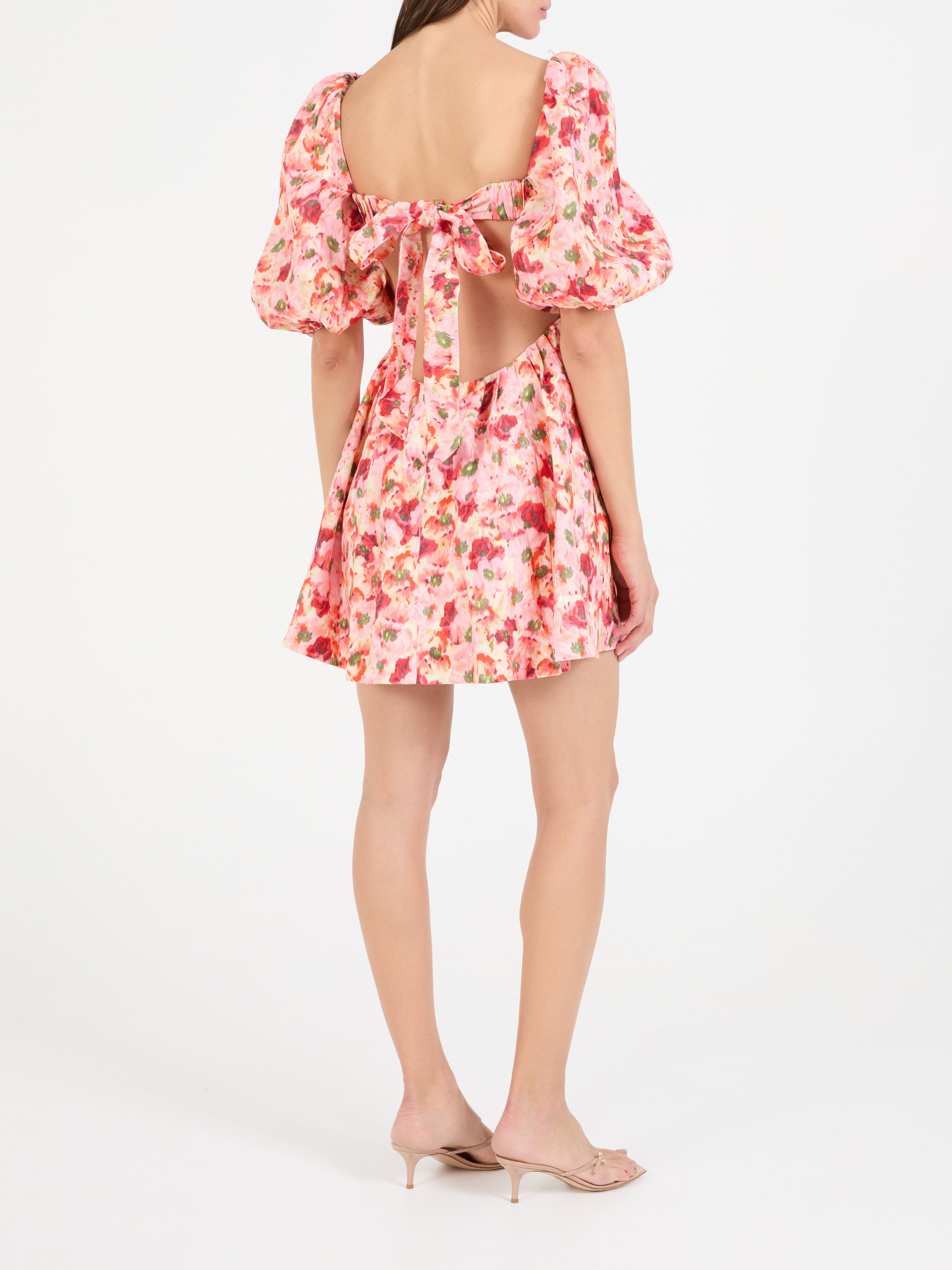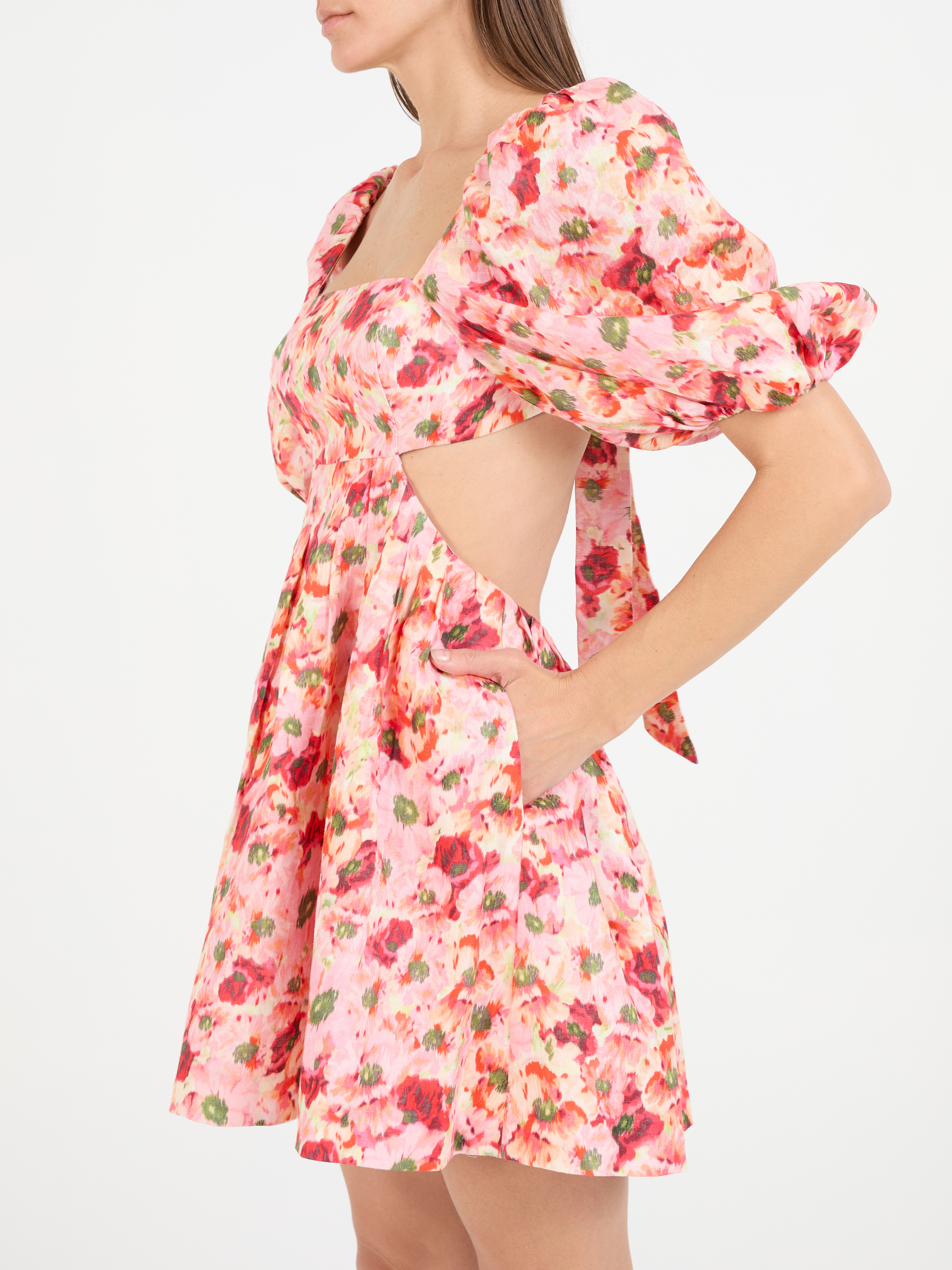 Das Kleid 'Lightburst Cut Out' in Multi von Zimmermann wurde aus einem Leinen-Baumwoll-Gemisch gefertigt und besticht durch ein mehrfarbiges, florales Muster. Der tiefe Rückenausschnitt mit verdecktem Reißverschluss und das romantische Binde-Detail zeichnen diese feminine Silhouette aus.