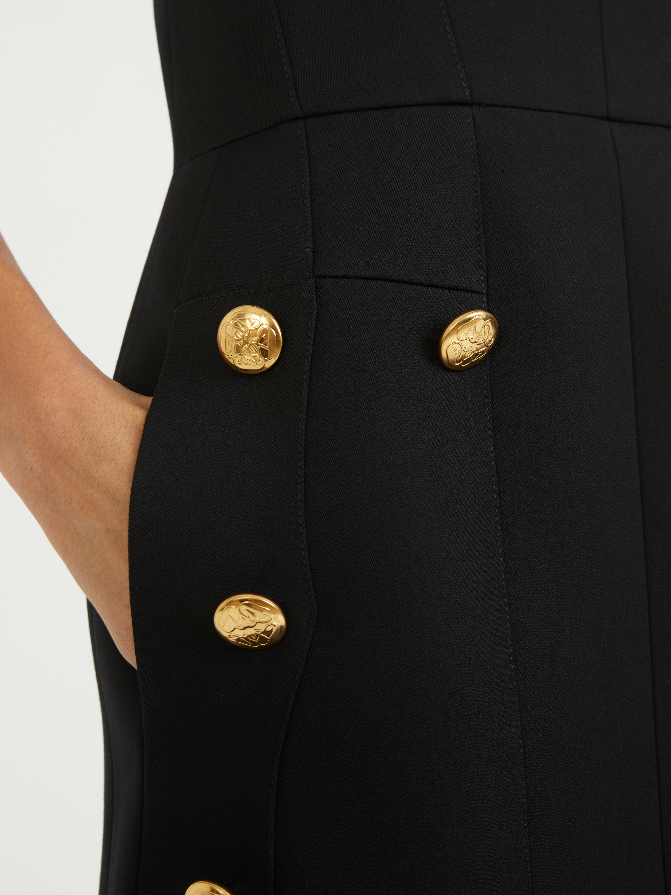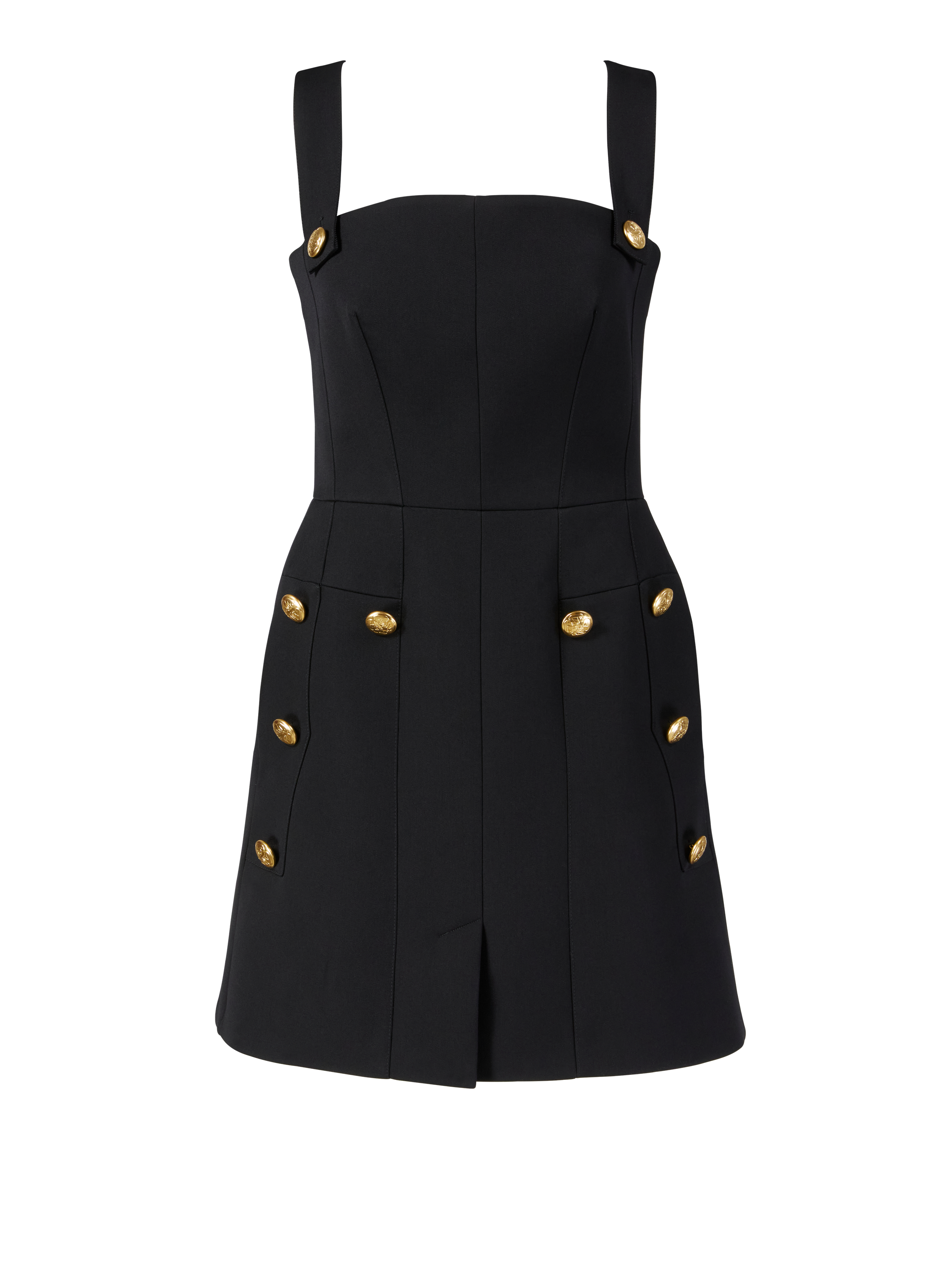 Dieses Kleid in Schwarz von Alexander McQueen wurde aus hochwertiger Wolle gefertigt und besticht durch die taillierte Silhouette. Der quadratische Ausschnitt, die Siegellogo-Knöpfe und die Minilänge zeichnen dieses Modell aus.