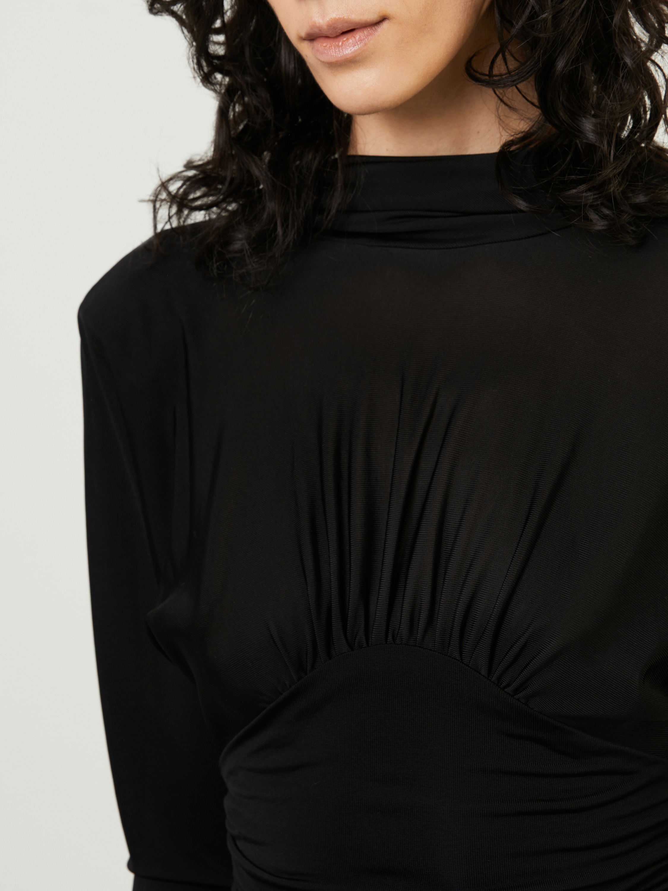 Dieses Kleid in Schwarz von SAINT LAURENT wurde aus reiner hochwertiger Viskose gefertigt und besticht durch die durchgängigen Raffungen. Das Modell wird durch den Kuttenhalsauschnitt, den Schulterpolstern und der körperbetonten Passform definiert. Einen harmonischen Abschluss schaffen die leicht transparenten Ärmel.