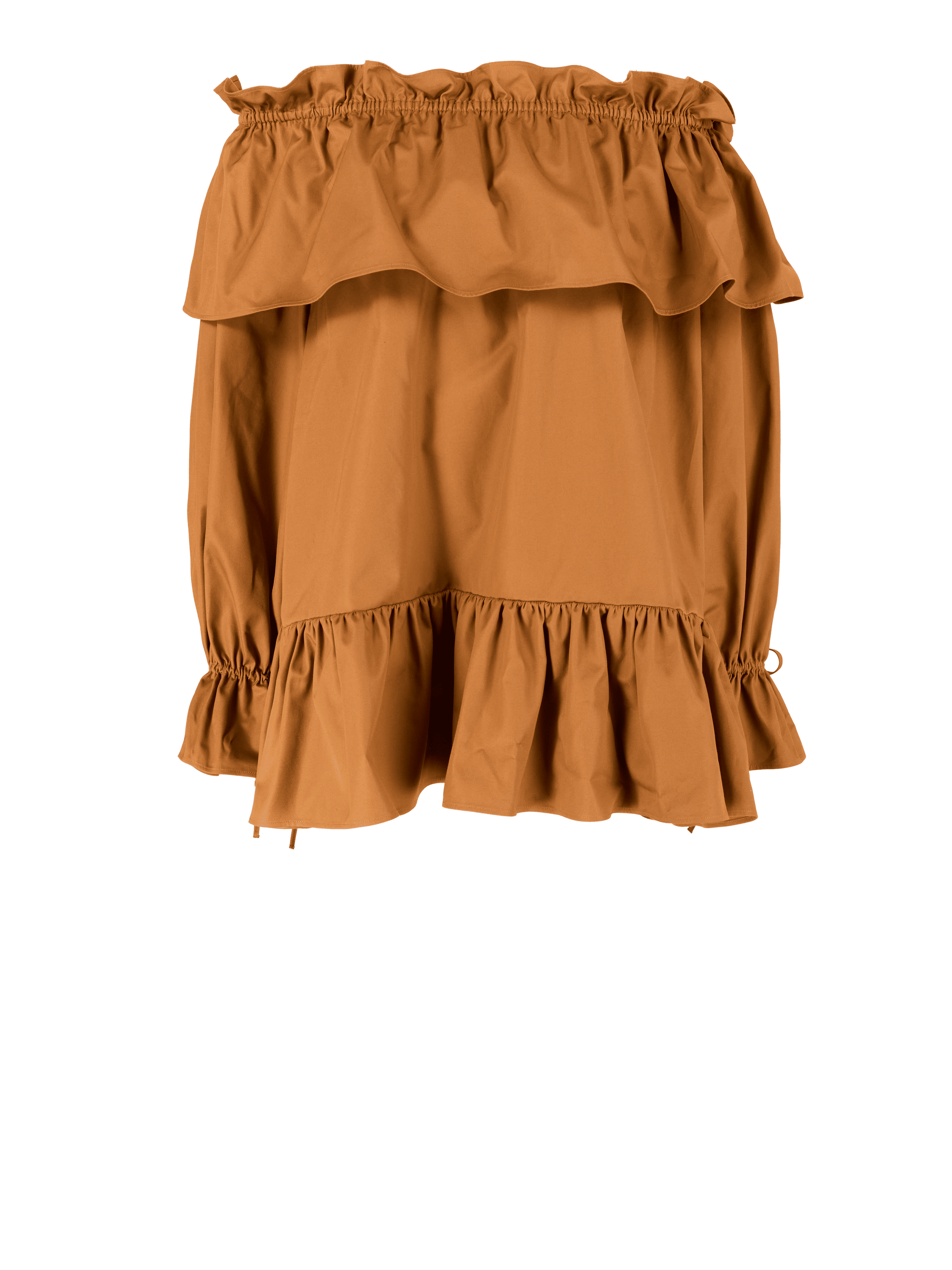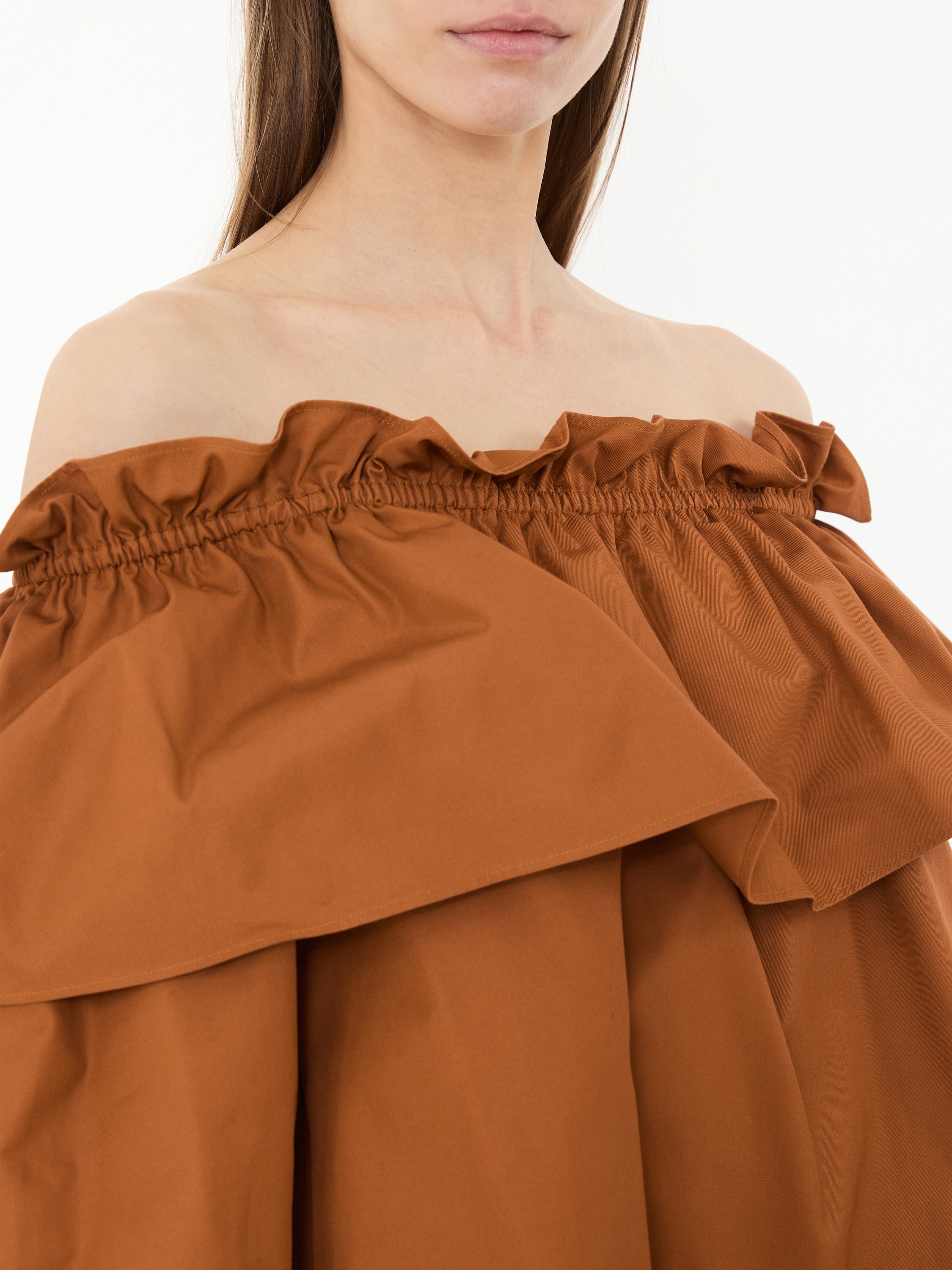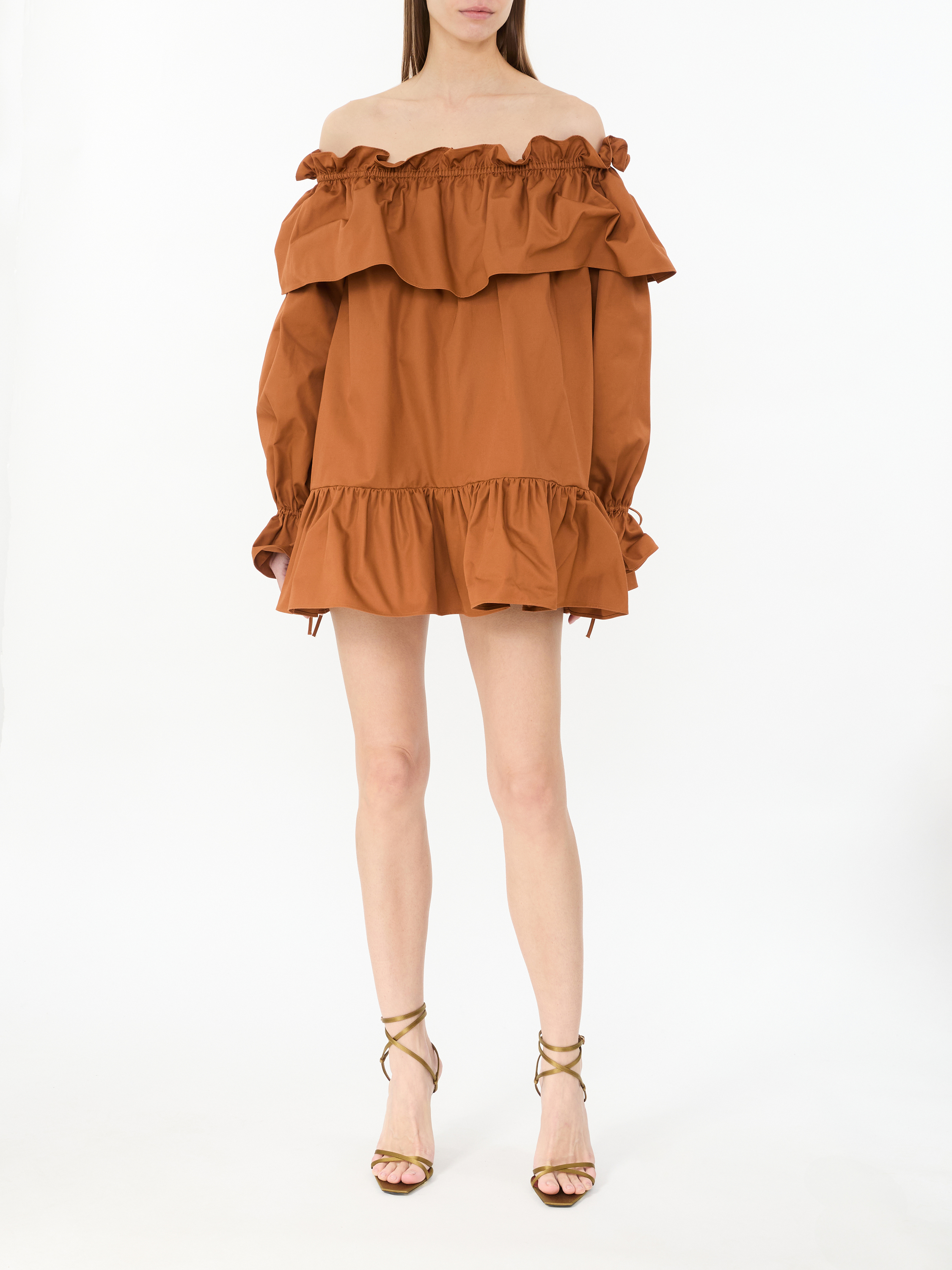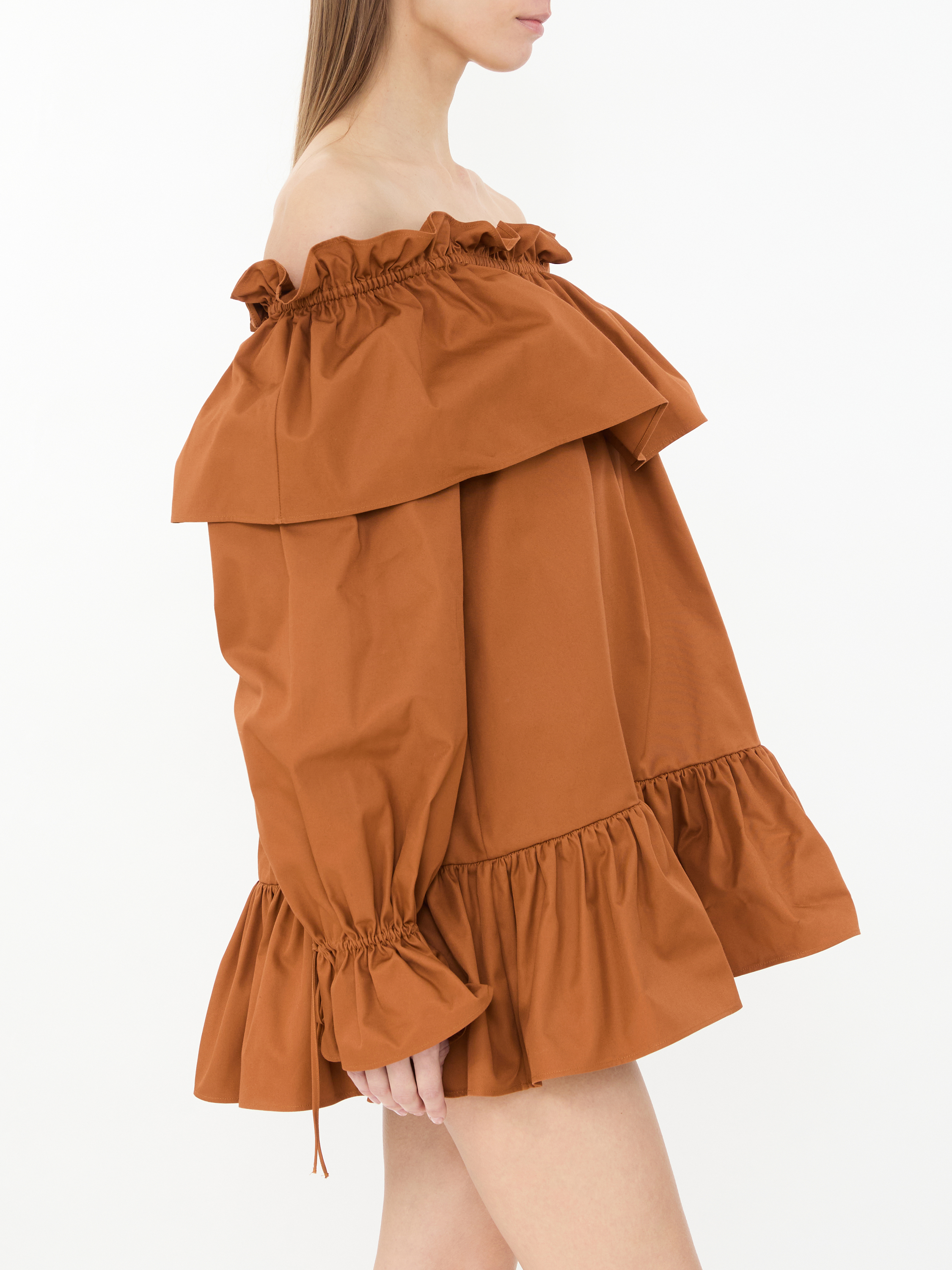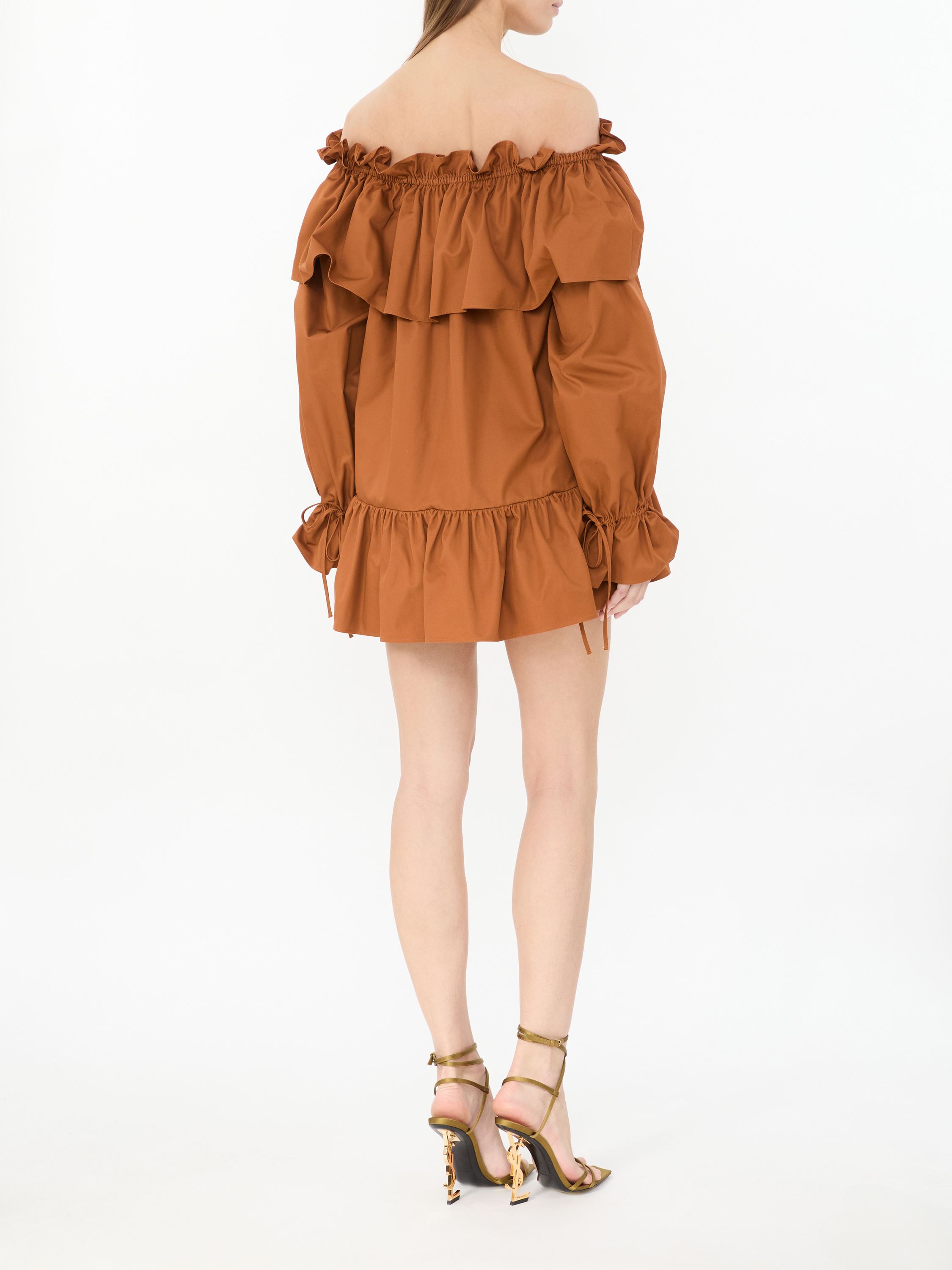 Das Kleid in Braun von Saint Laurent wurde aus Baumwolle gefertigt und besticht durch die Rüschen. Die schulterfreien Details, die ausgestellte Passform und die Minilänge zeichnen dieses Modell aus.