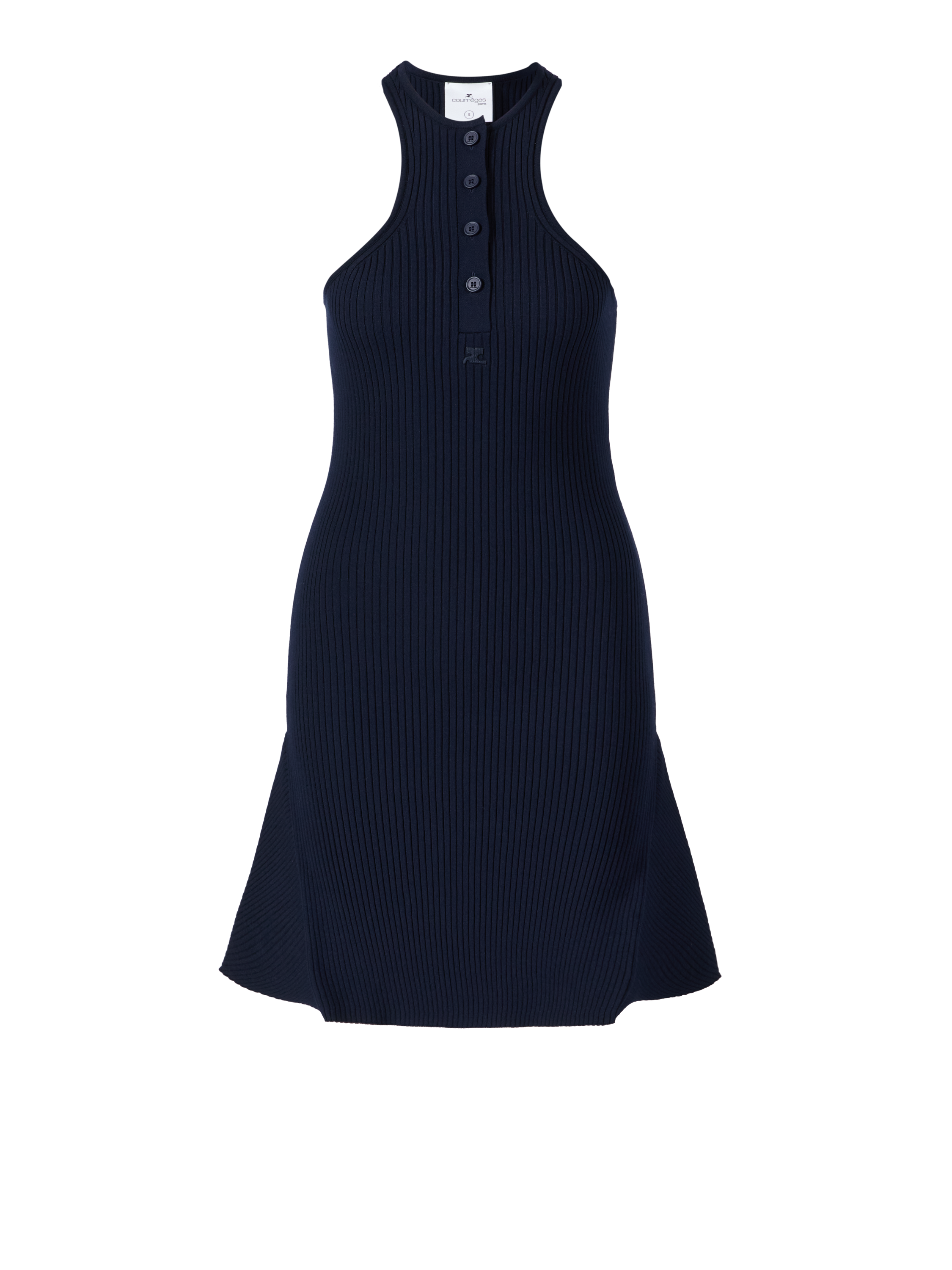 Das Minikleid 'Scuba' in Marineblau von courrèges wurde aus einer hochwertigen Materialmischung gefertigt und besticht durch die figurbetonende Silhouette. Die Minilänge, der Rippstrick und die Knopfleiste geben dem Kleid einen modernen Touch.