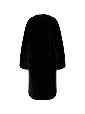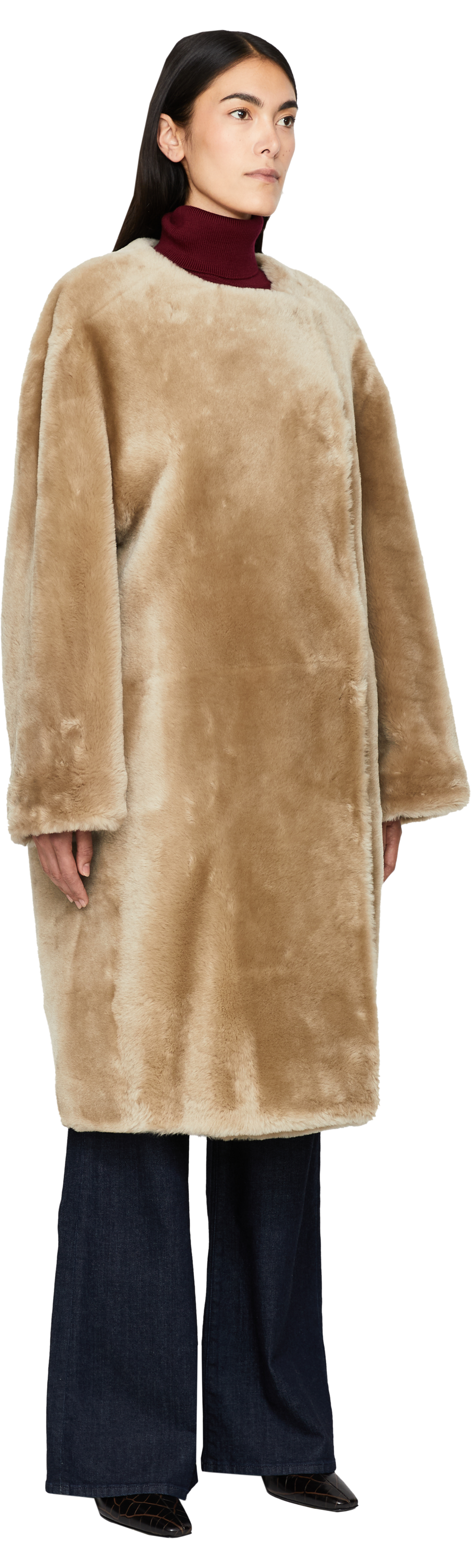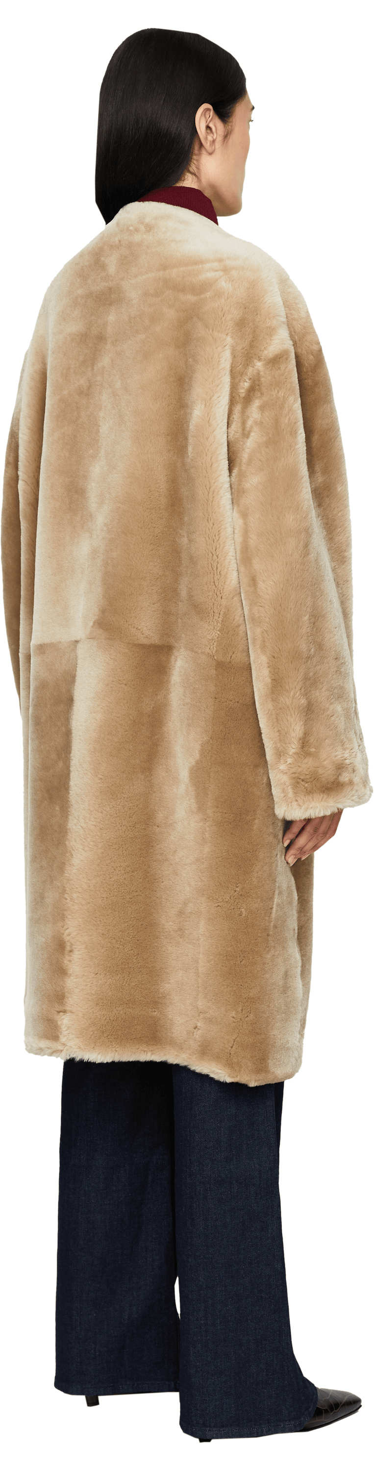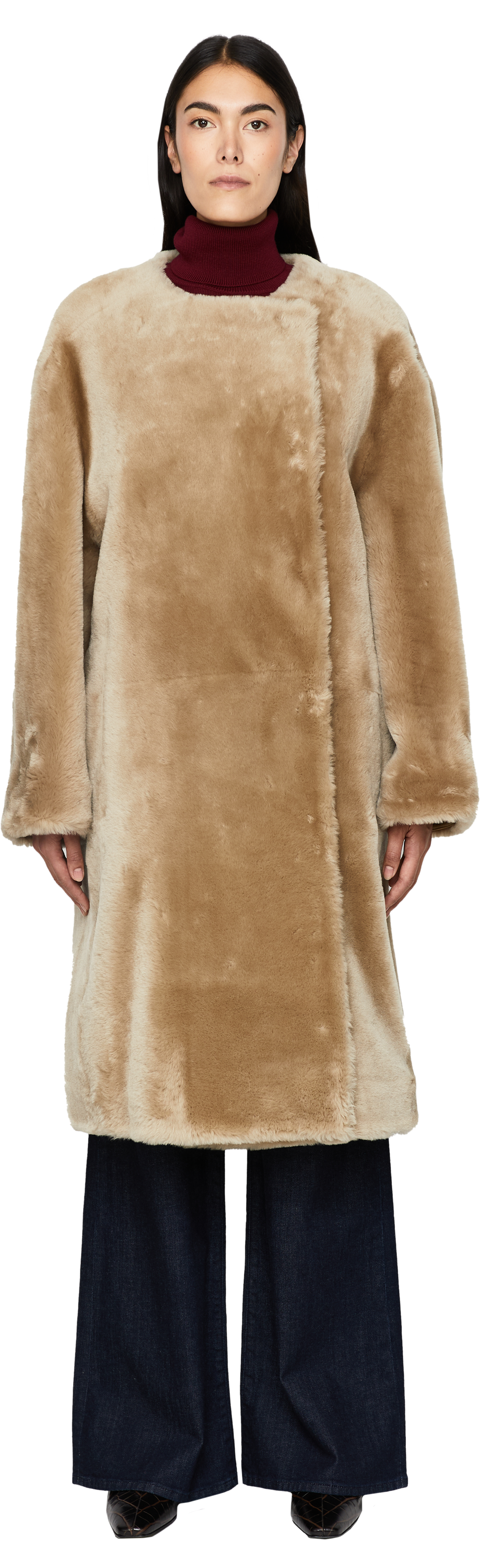 Dieser Mantel in Beige von TOTEME wurde aus hochwertigem Lammfell gefertigt und besticht durch die weiche Haptik. Der Haken- und Ösenverschluss und die lässige, weite Passform zeichnen dieses Design aus.