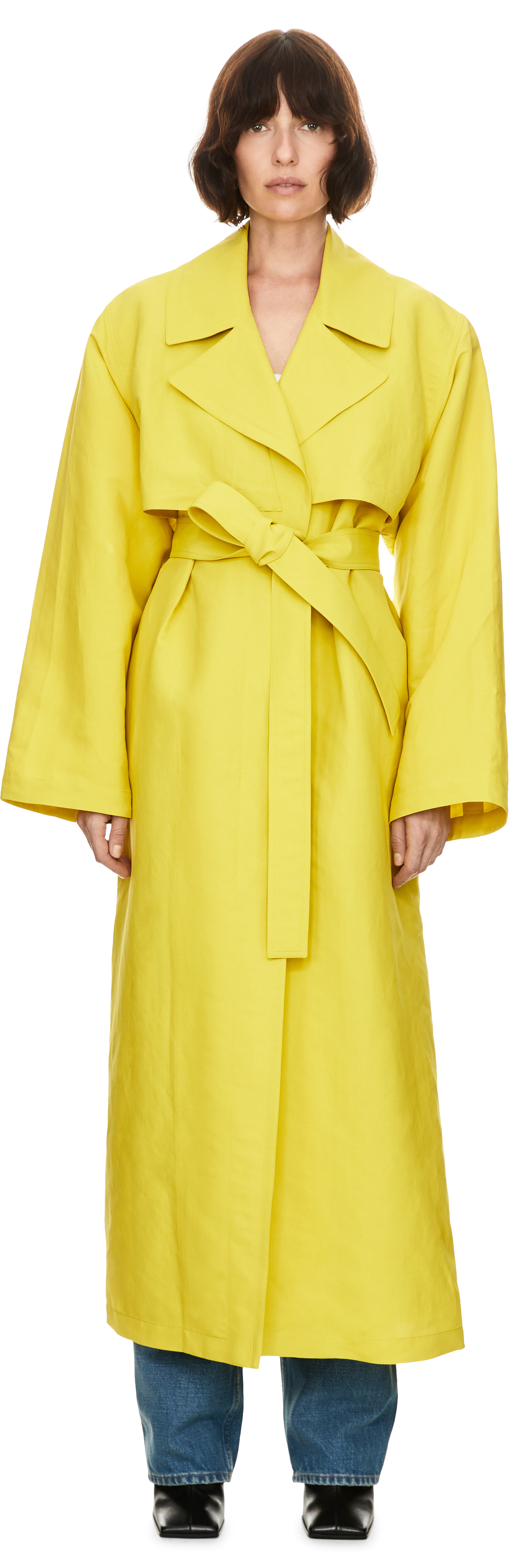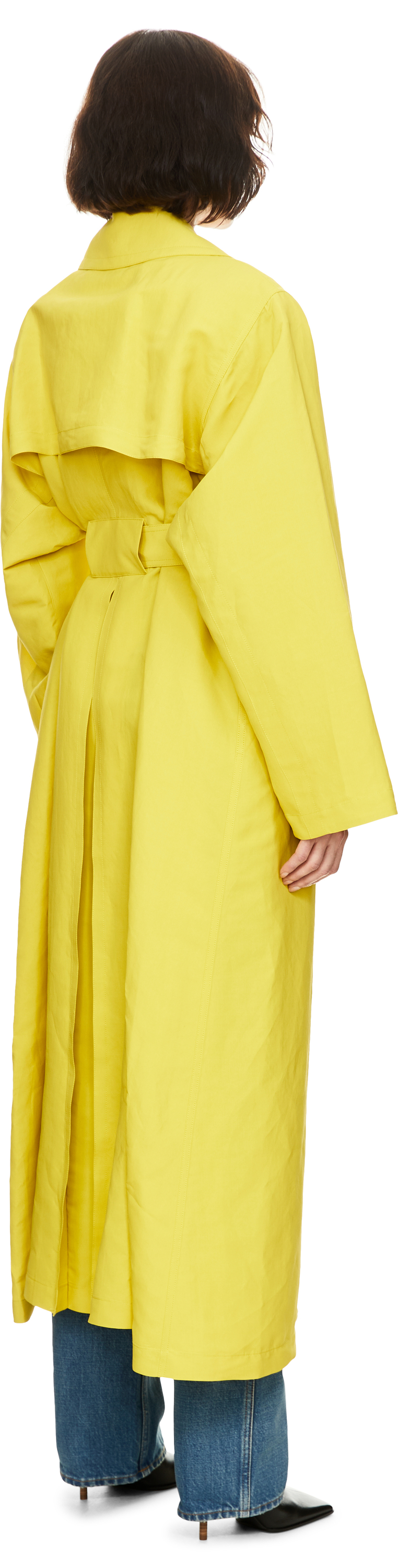 Dieser Trenchcoat in Gelb von Alaïa wurde aus hochwertigem Papiergarn und Viskose gefertigt und besticht durch die skulpturale Oversize-Passform. Das Modell verfügt über einen Reverskragen und eine verdeckte Knopfleiste auf der Vorderseite. Der abnehmbare Taillengürtel betont die Silhouette nach Belieben und unterstreicht die raffinierte Linie des Designs.