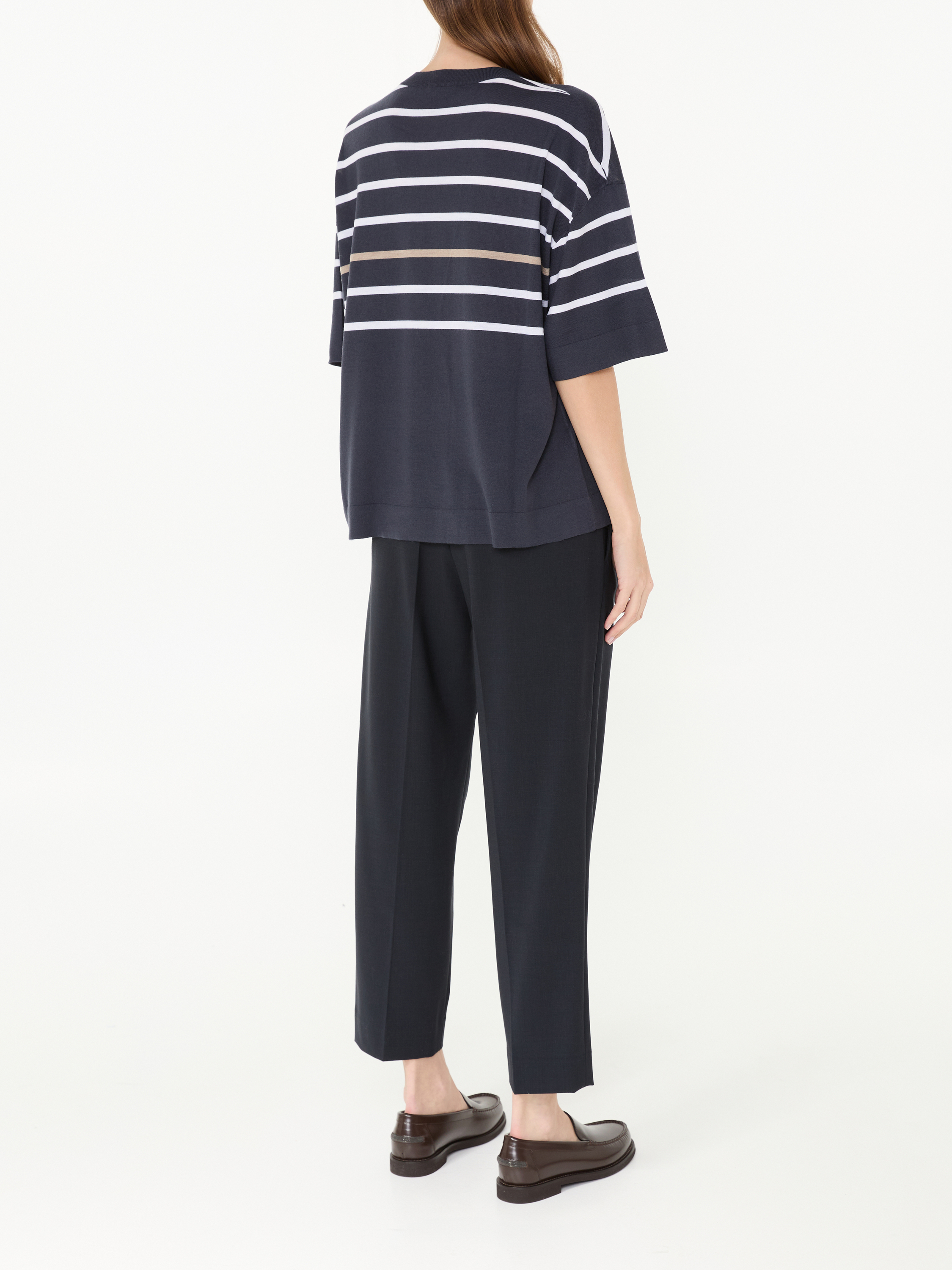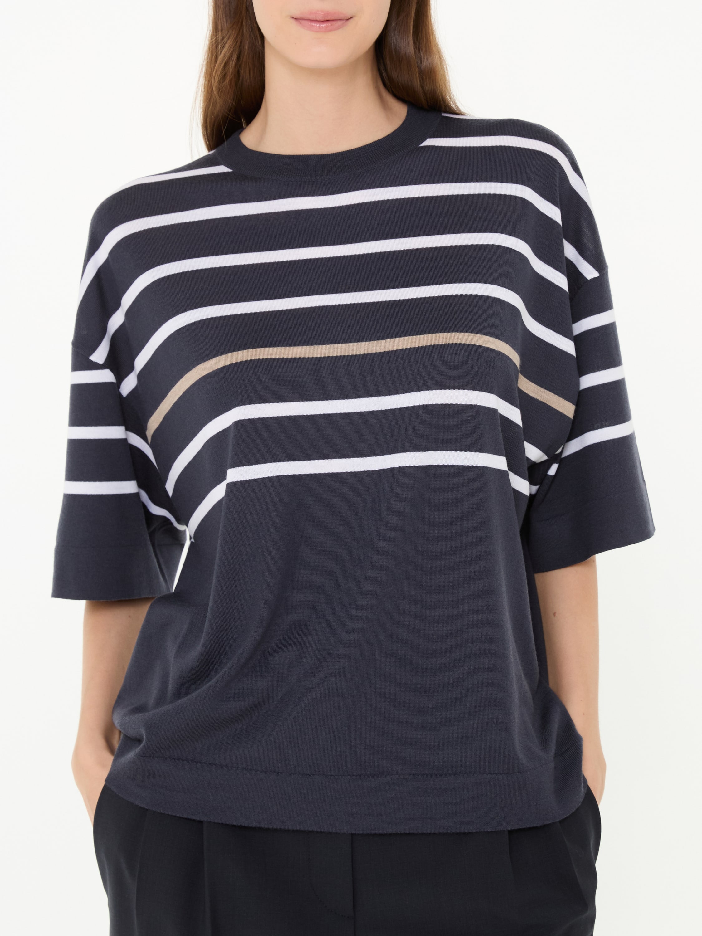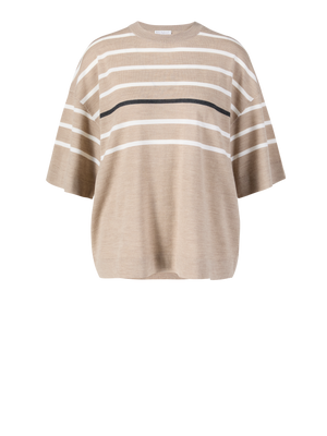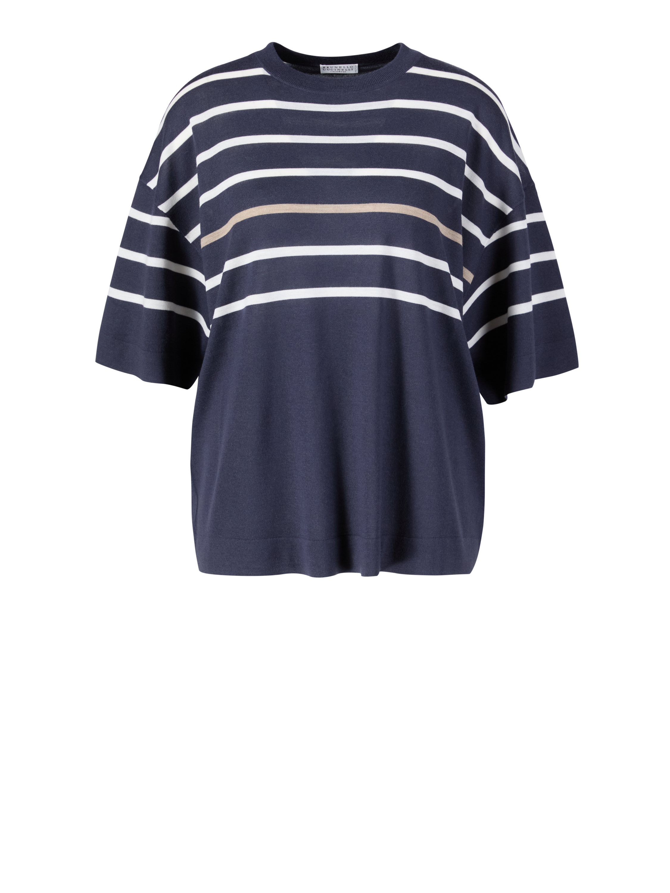 Dieser Kurzarmpullover in Marineblau/Weiß von Brunello Cucinelli wurde aus einer hochwertigen Woll-Cashmere-Mischung gefertigt und besticht durch die lockere Passform. Das minimalistische Design wird durch die Rippstrickbündchen und den klassischen Rundhalsausschnitt definiert. Der Feinstrick sorgt mit seiner weichen Haptik für einen angenehmen Tragekomfort.