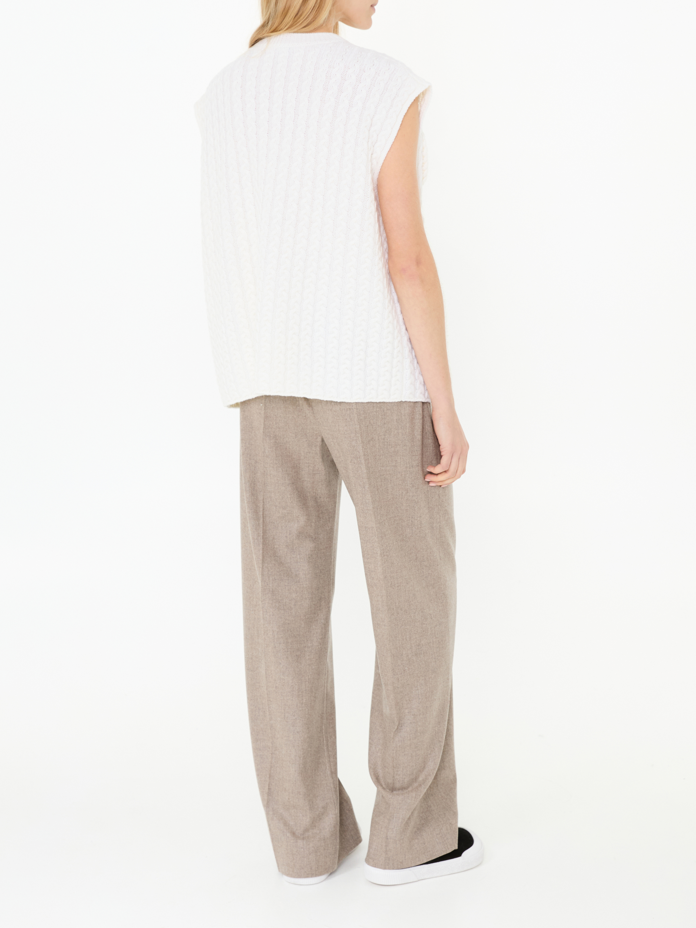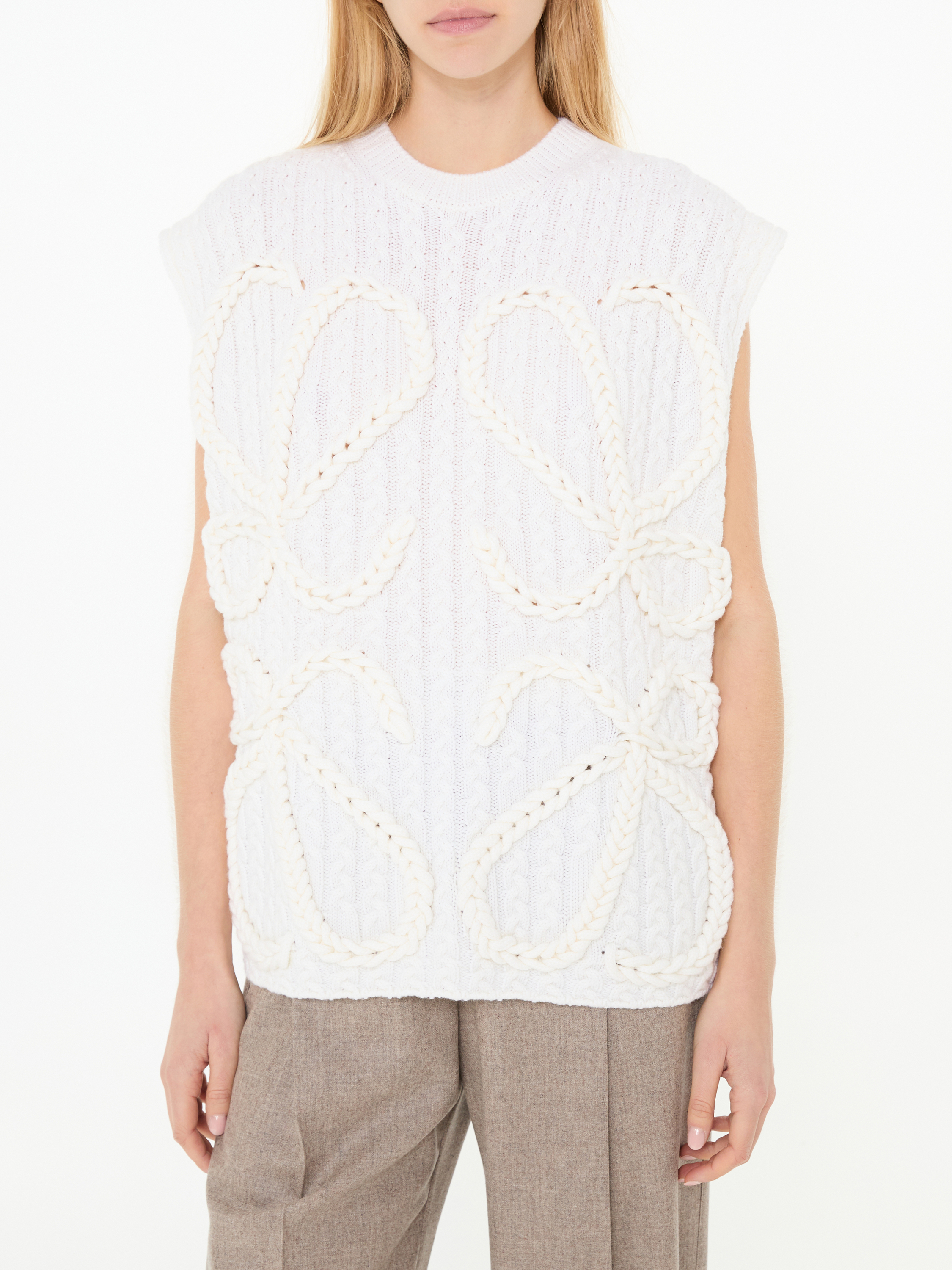 Der Pullunder in Sanftes Weiß von LOEWE wurde aus reiner Wolle gefertigt und besticht durch das prominente grob gestrickte Anagram. Das ärmellose Design wird durch die weiche Haptik und das liebevoll gestrickte Zopfmuster stilvoll ergänzt. Das Modell lässt sich hervorragend über Hemden stylen, wodurch es zu einem vielseitigen Look für den Alltag wird.