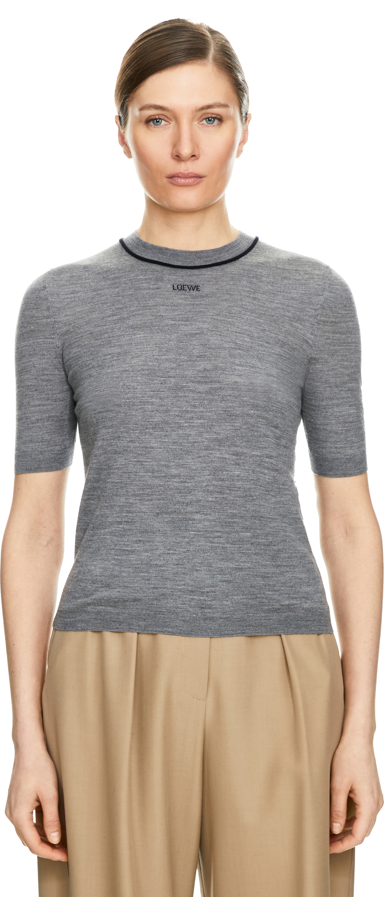 Dieser Pullover in Grau von Loewe wurde aus leichter Wolle gefertigt und besticht durch die kontrastierenden Rolljersey-Paspeln am Halsausschnitt. Die normale Passform, die gerippten Manschetten und der gerippte Saum sowie das LOEWE-Jacquard-Motiv auf der Vorderseite verleihen dem Modell eine moderne Silhouette.