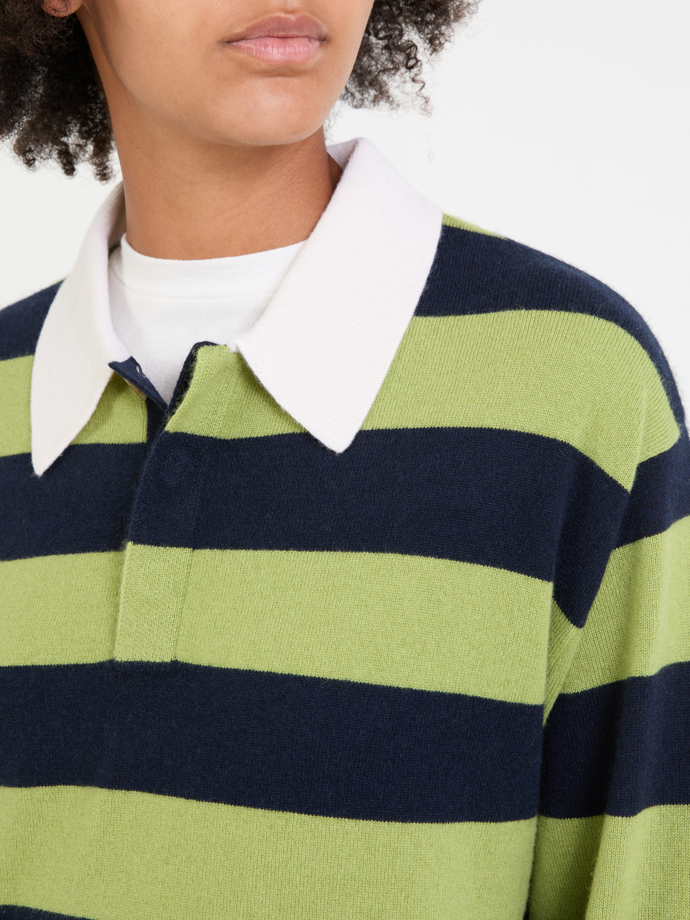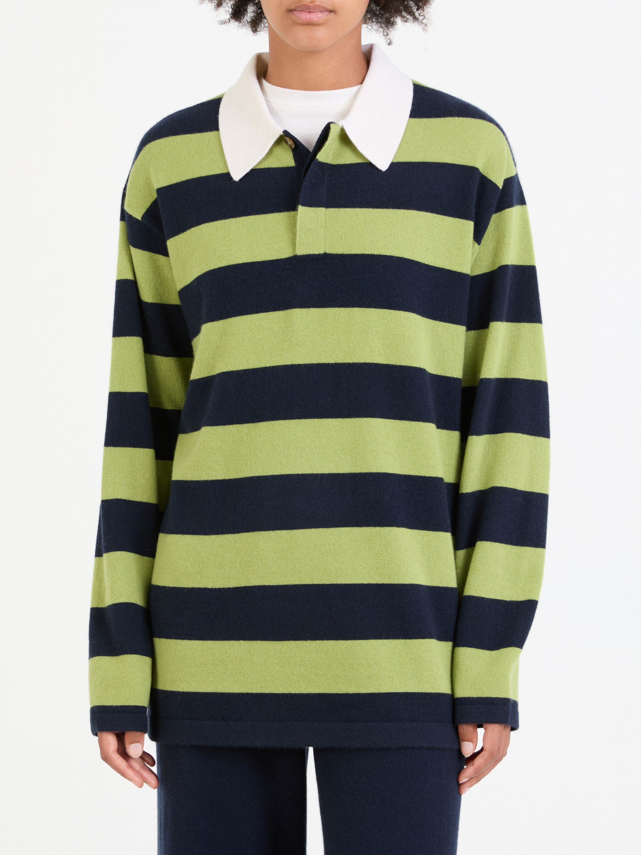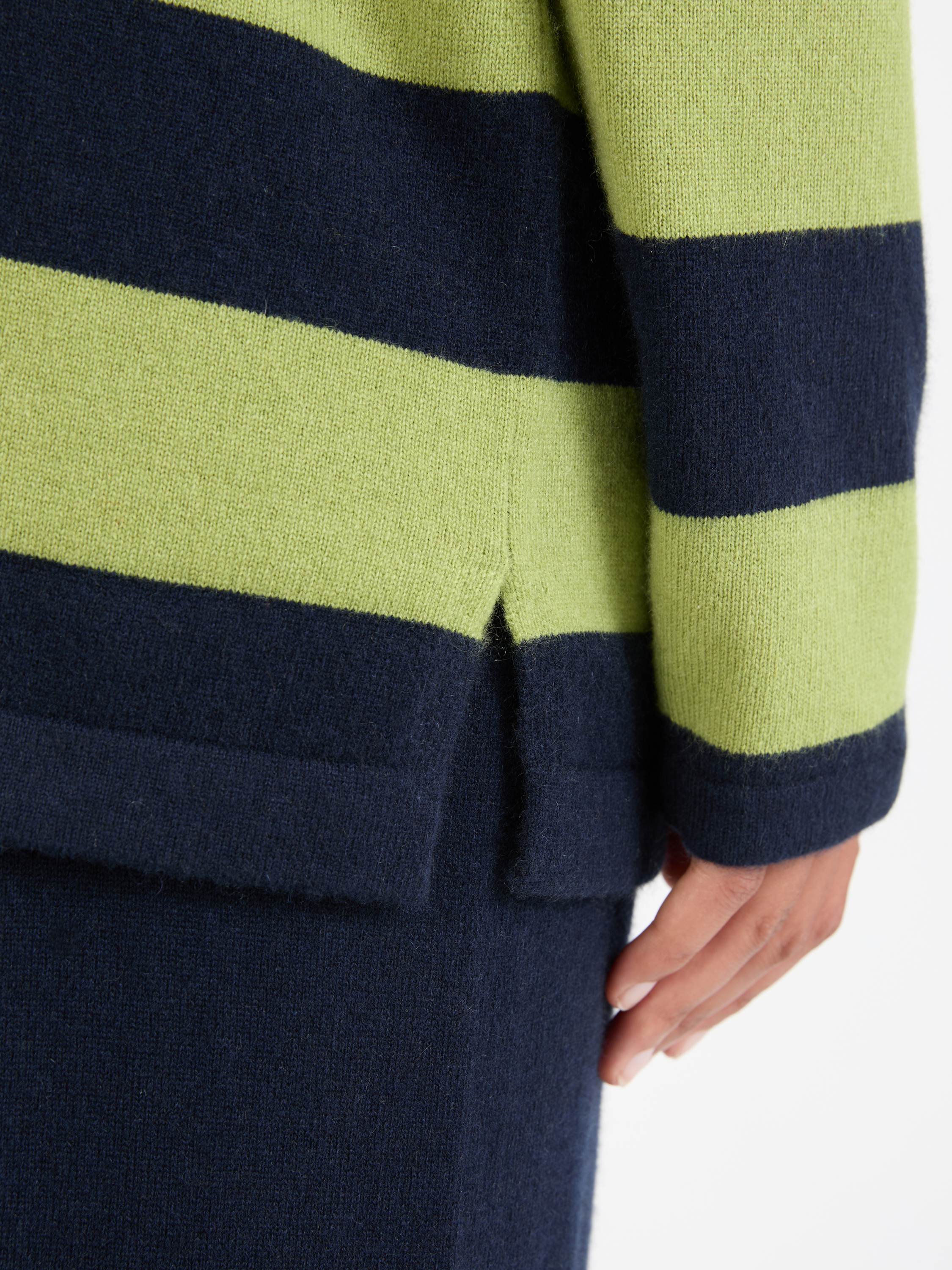 Dieser gestreifte Pullover in Grün/Marineblau von GUEST IN RESIDENCE wurde aus hochwertigen Cashmere gefertigt und besticht durch die gerade Silhouette und die verdeckte Knopfleiste. Der klassische Polokragen und die angenehme Haptik vollenden dieses stilvolle Modell.