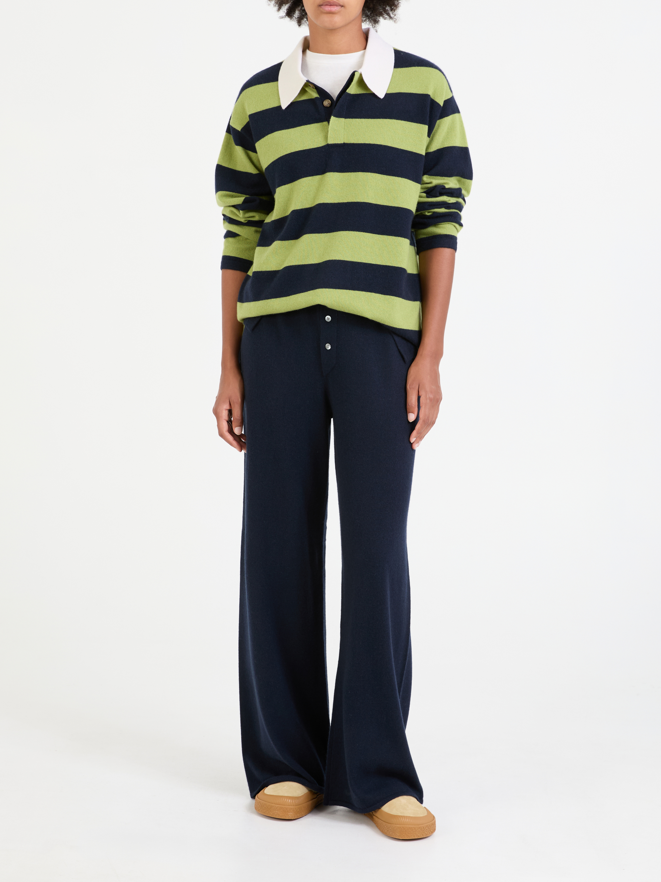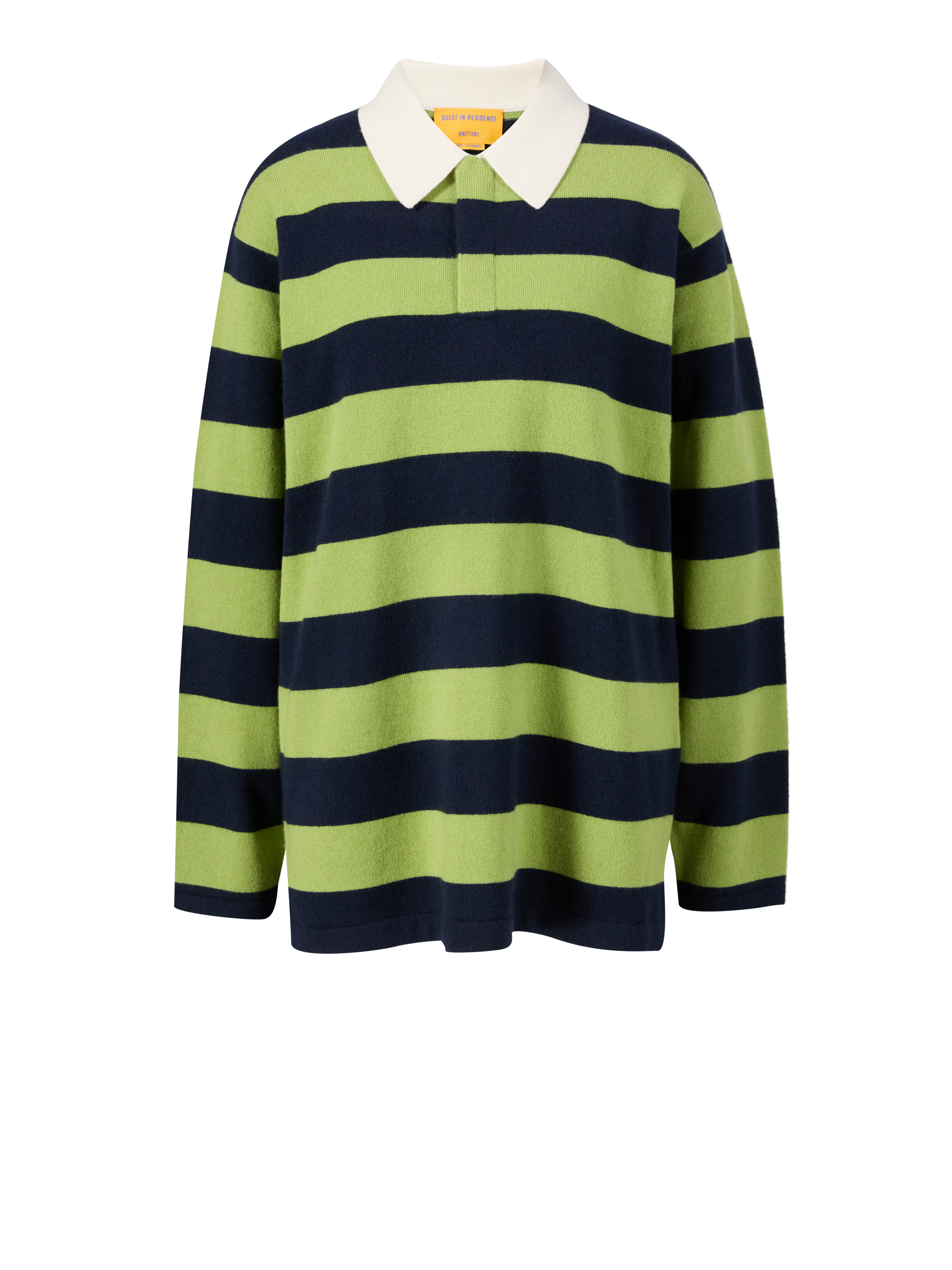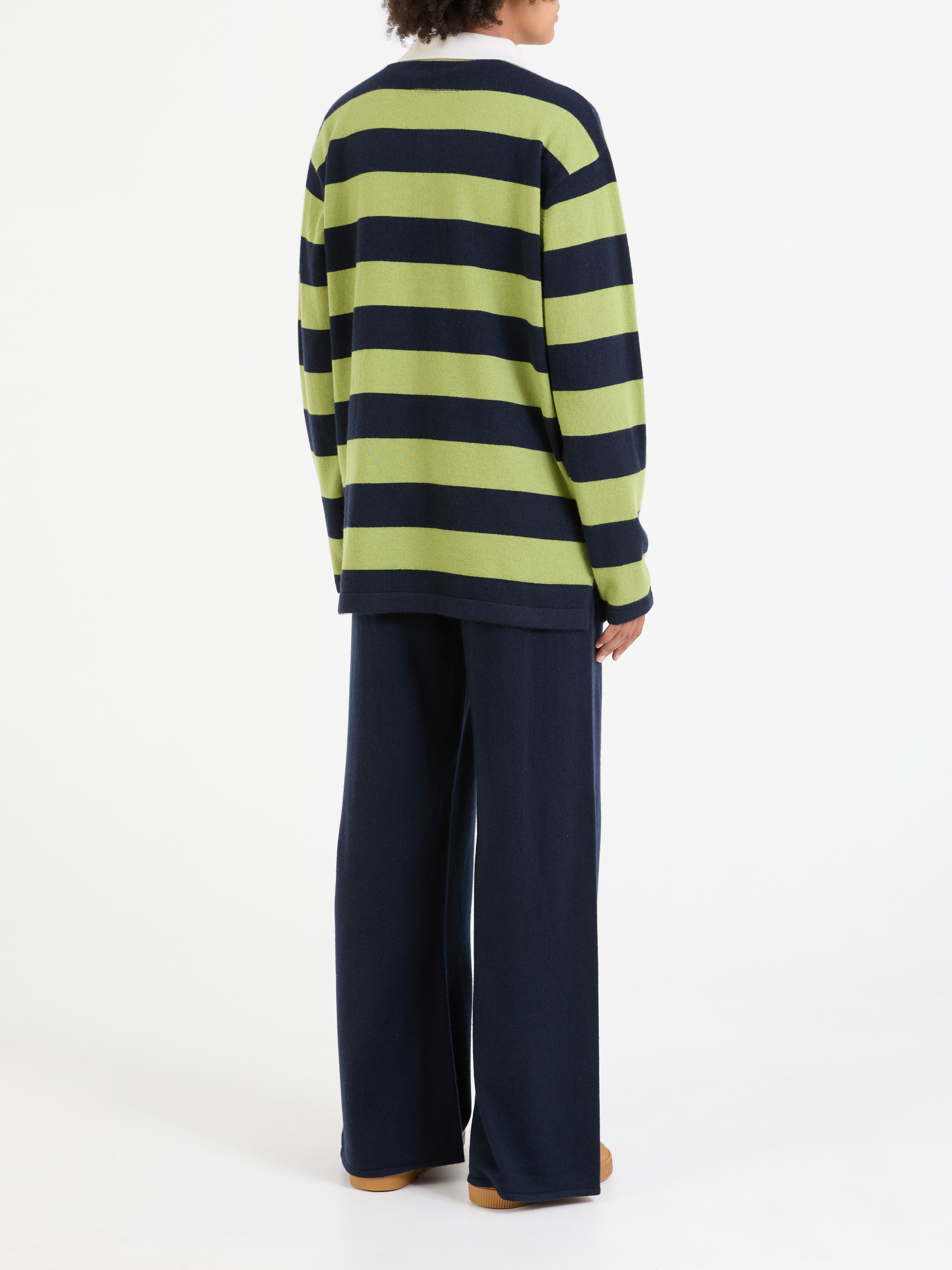 Dieser gestreifte Pullover in Grün/Marineblau von GUEST IN RESIDENCE wurde aus hochwertigen Cashmere gefertigt und besticht durch die gerade Silhouette und die verdeckte Knopfleiste. Der klassische Polokragen und die angenehme Haptik vollenden dieses stilvolle Modell.