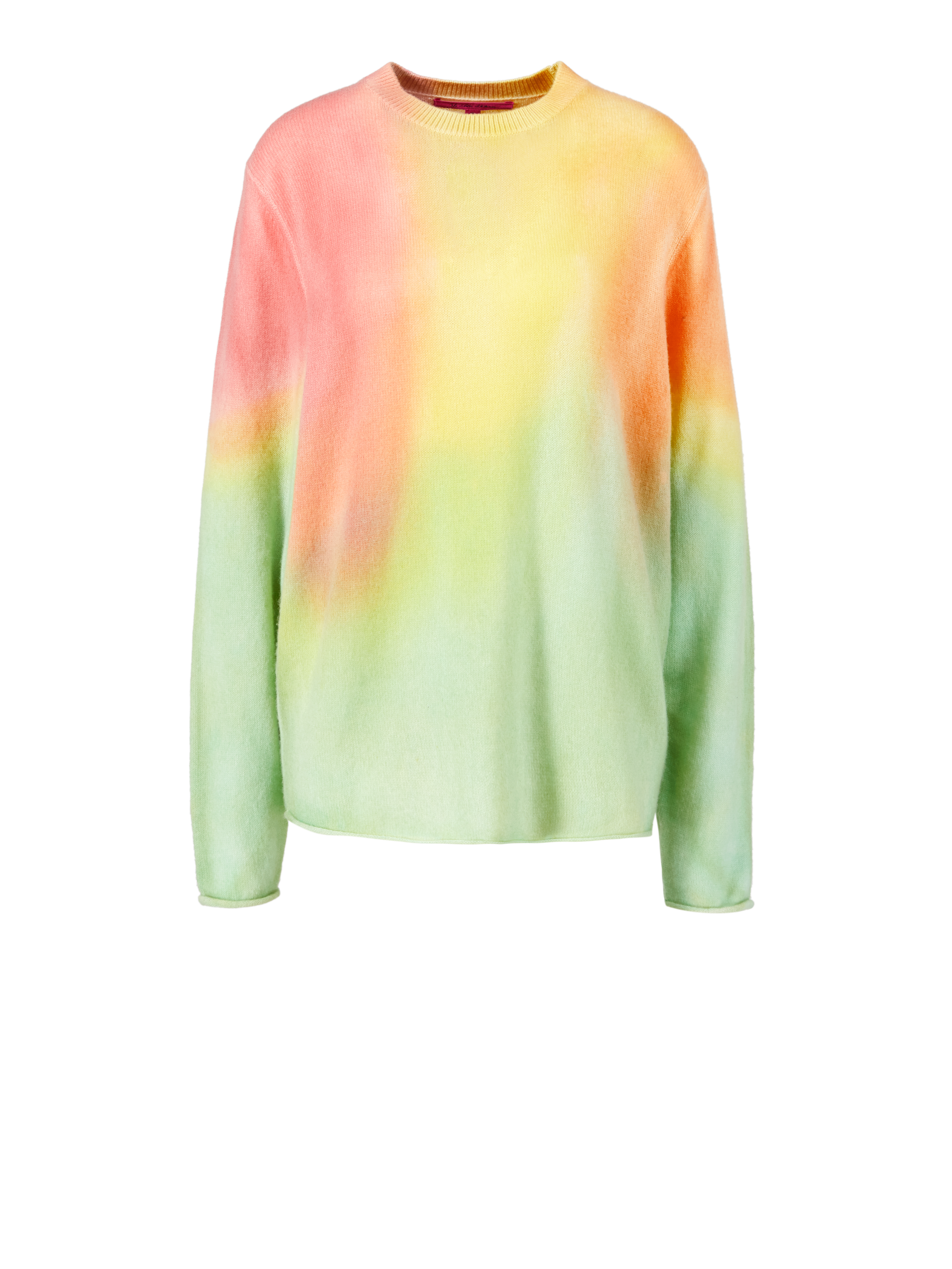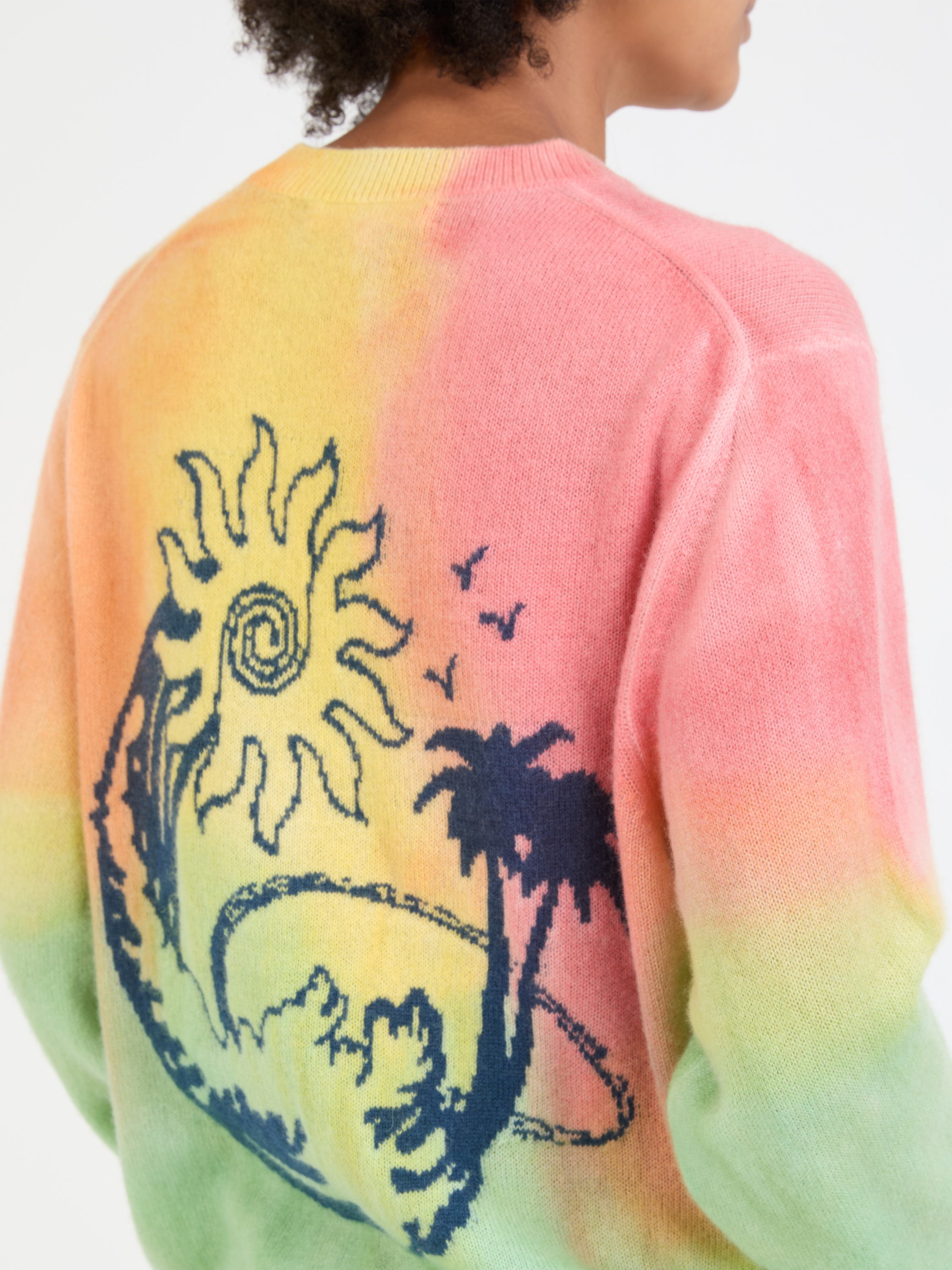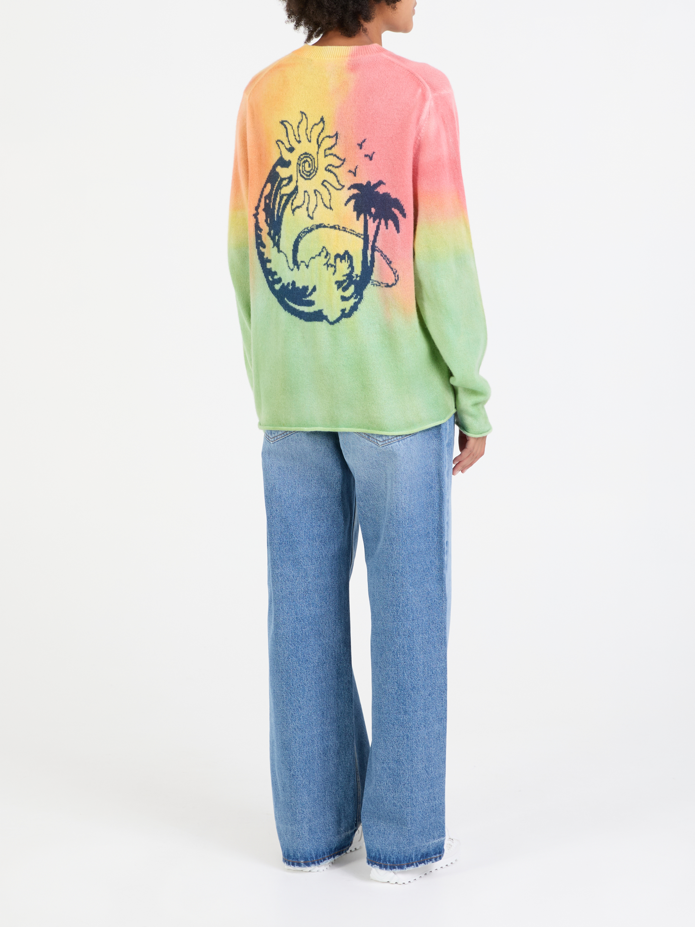 Der Pullover 'Wave Aura' in Multi von The Elder Statesman wurde aus reinem Cashmere gefertigt und besticht durch den sanften Farbverlauf. Der Rundhalsausschnitt, die langen Ärmel und die lockere Passform zeichnen dieses hochwertige Design aus. Ein großes Intarsienmuster am Rücken rundet dieses Design ab.