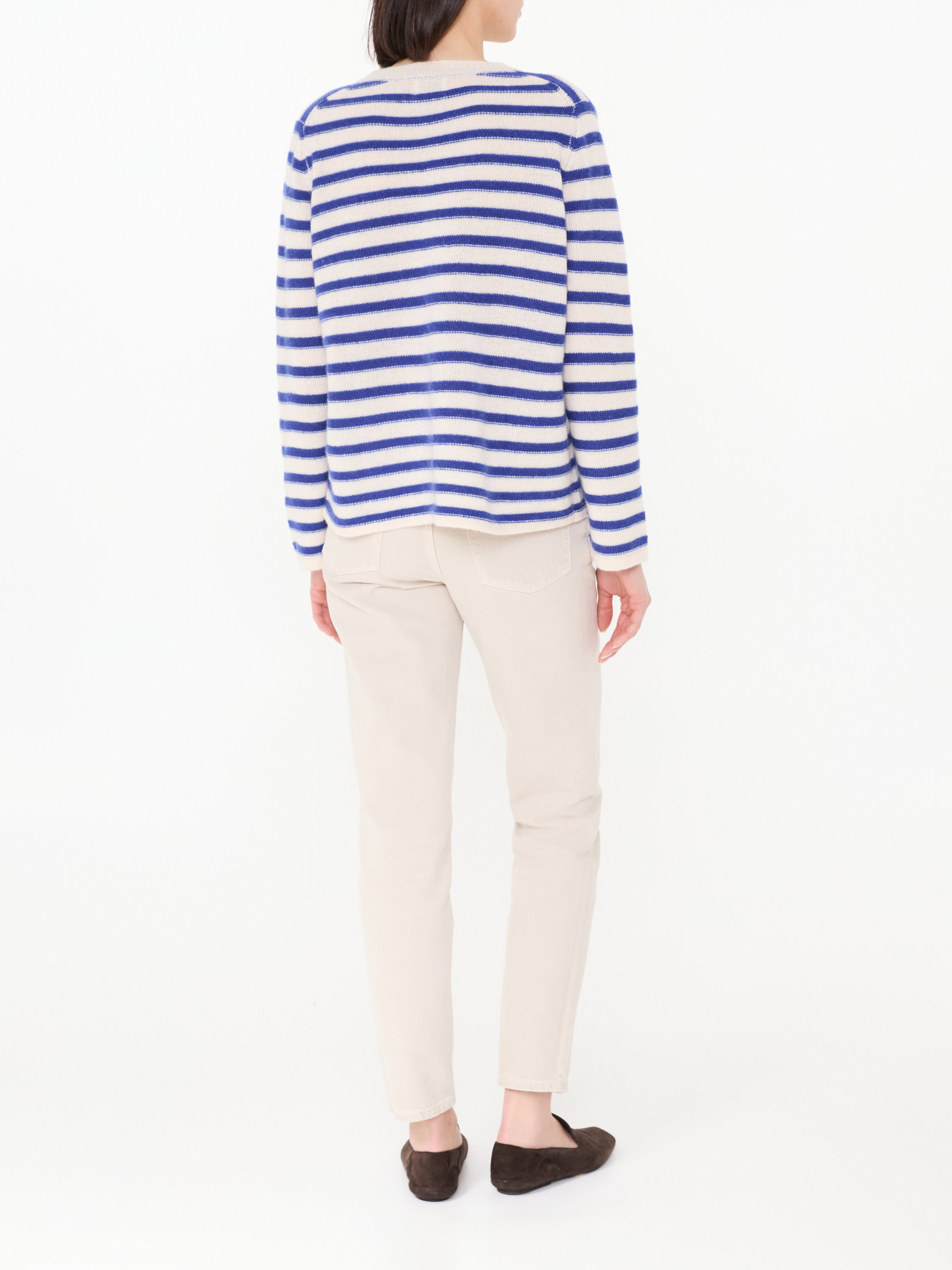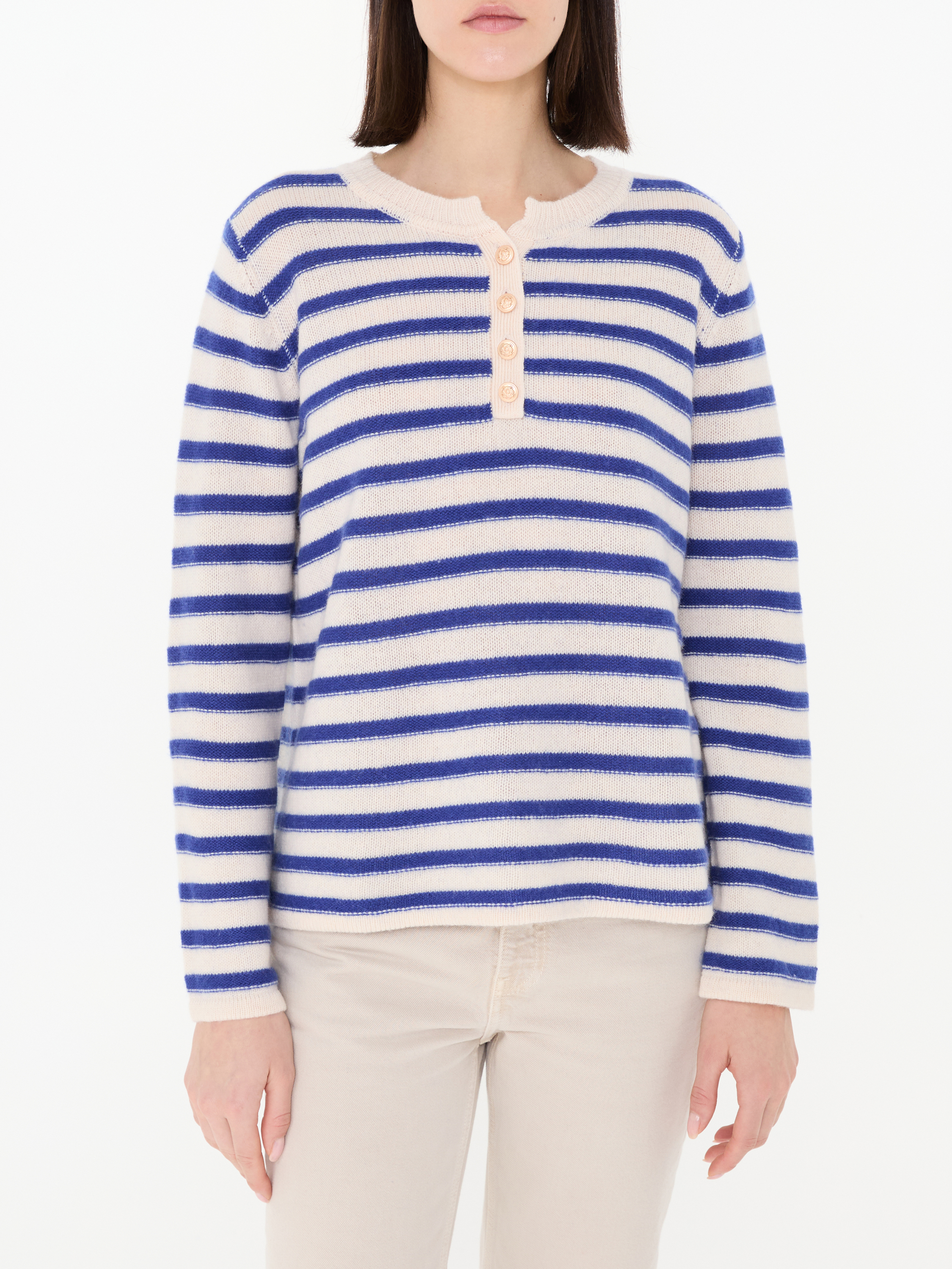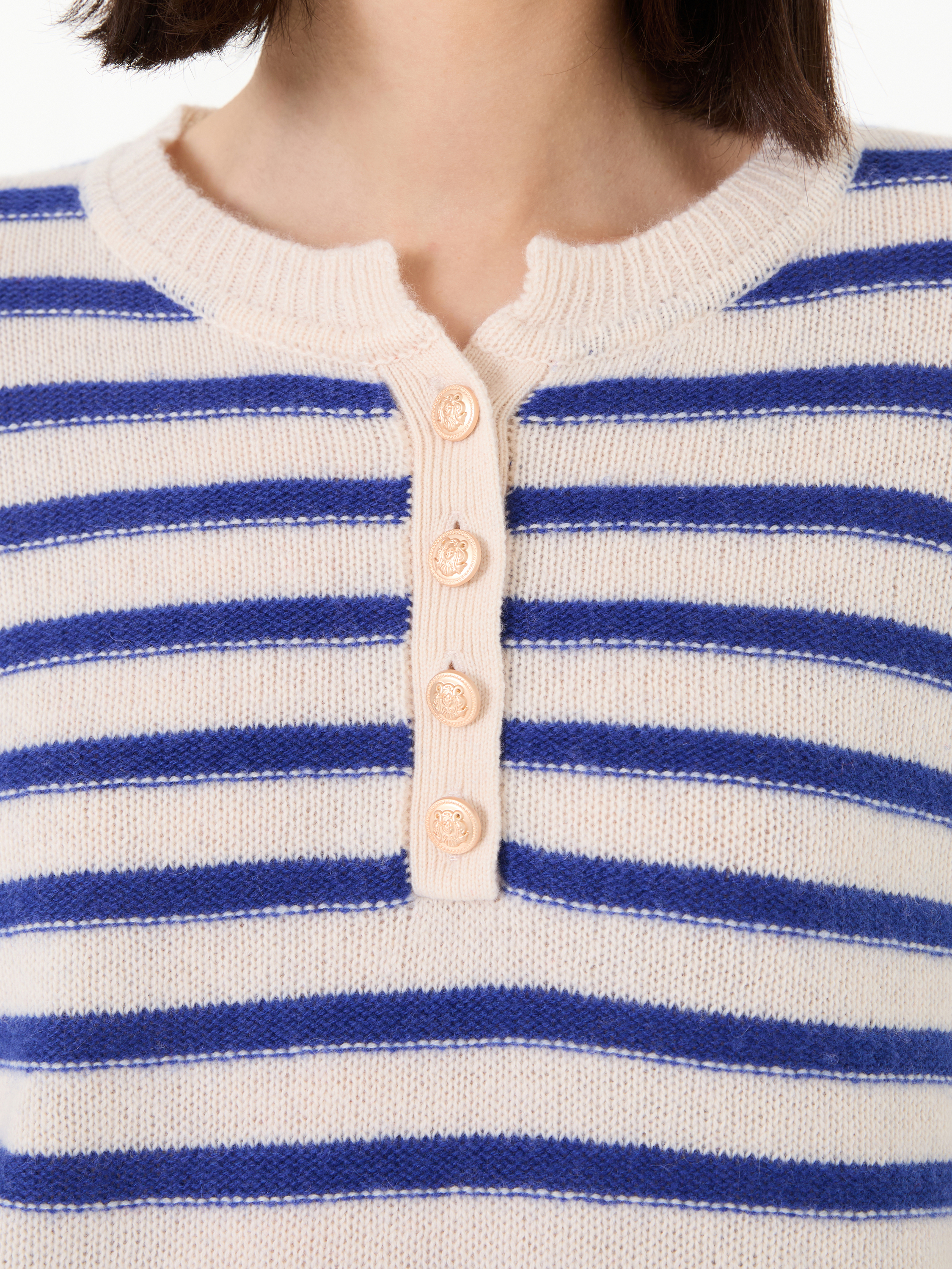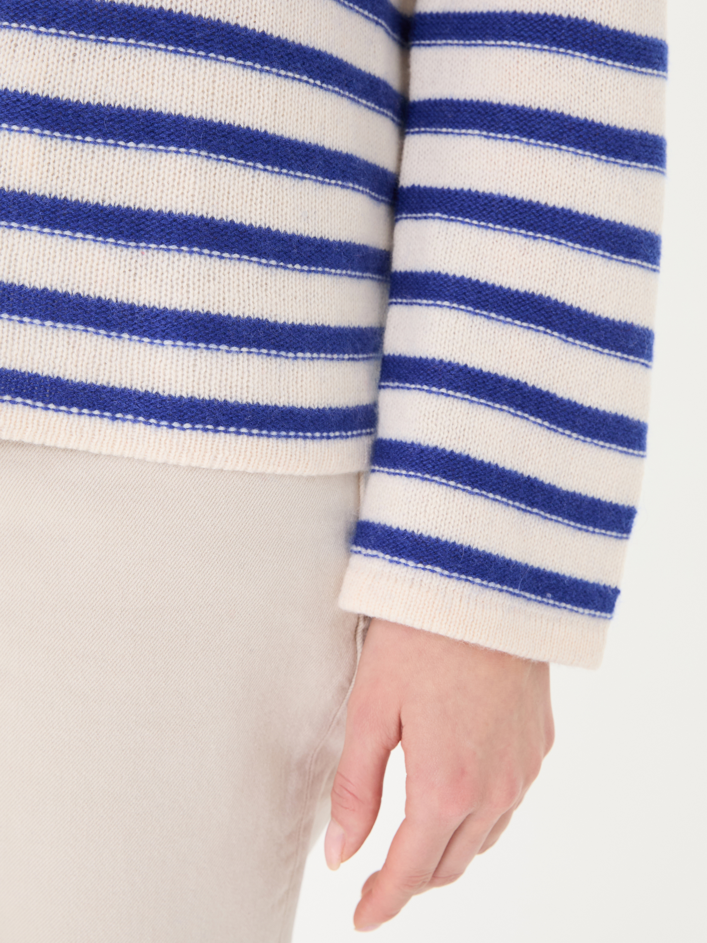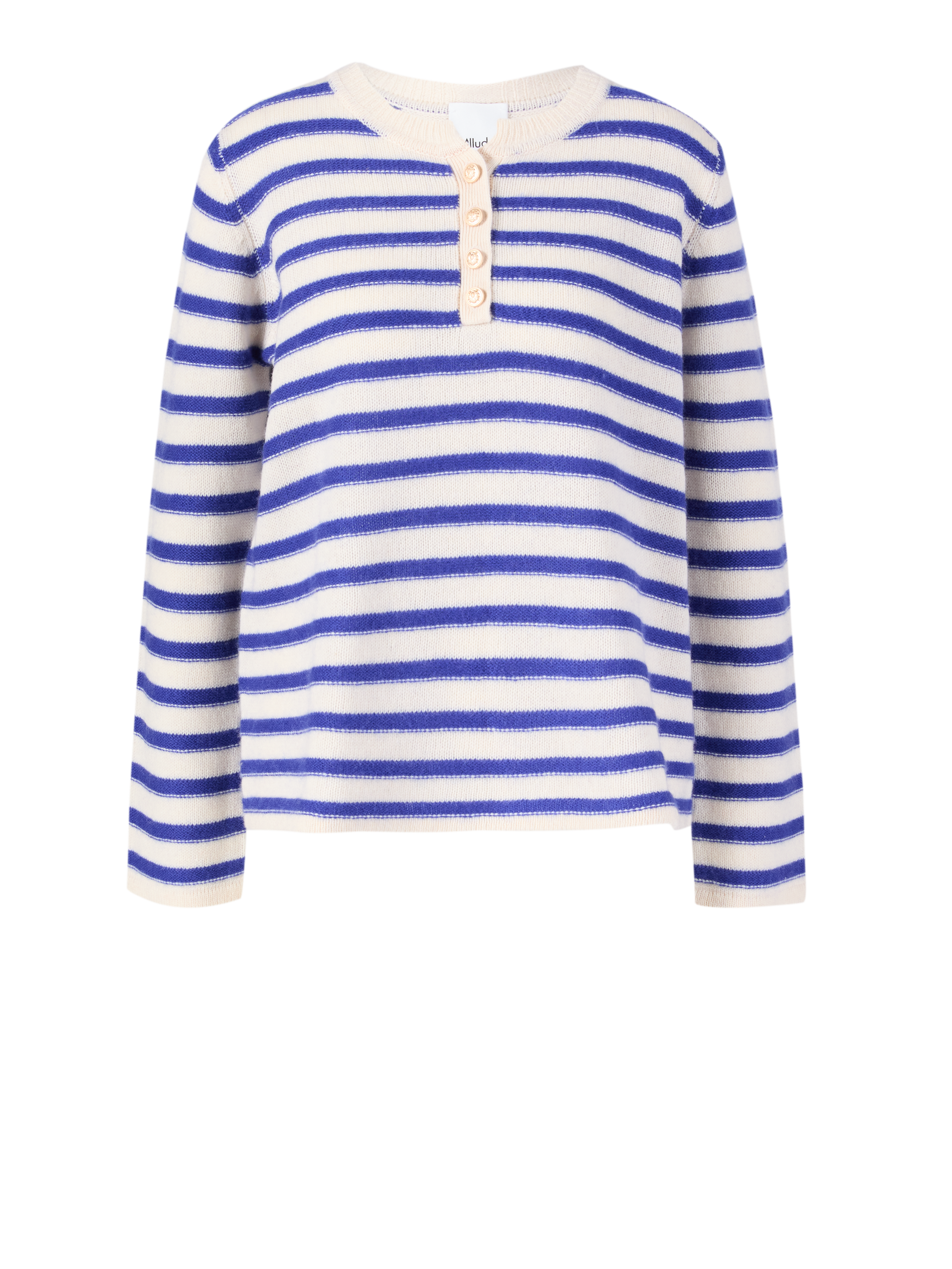 Dieser Pullover in Blau/Crème von Allude wurde aus einer Woll-Cashmere-Mischung gefertigt und besticht durch die verkürzte Passform. Die maritime Optik zeichnet dieses Modell aus. Die verkürzte Knopfleiste und die weiche Haptik runden dieses Design stilvoll ab.