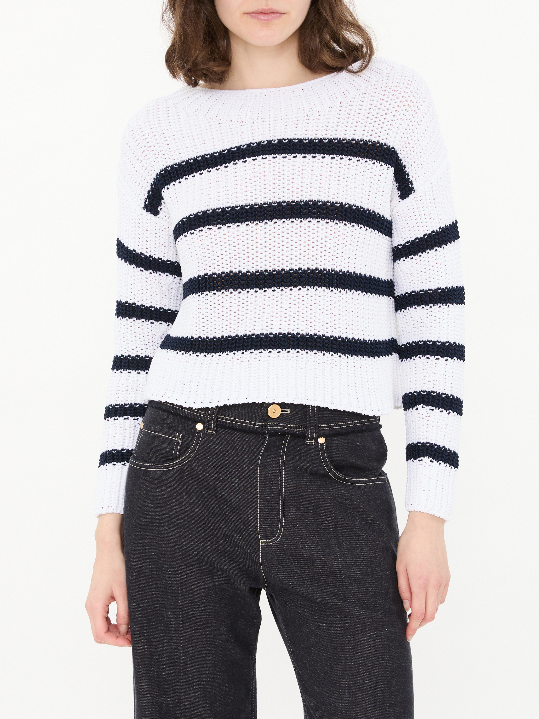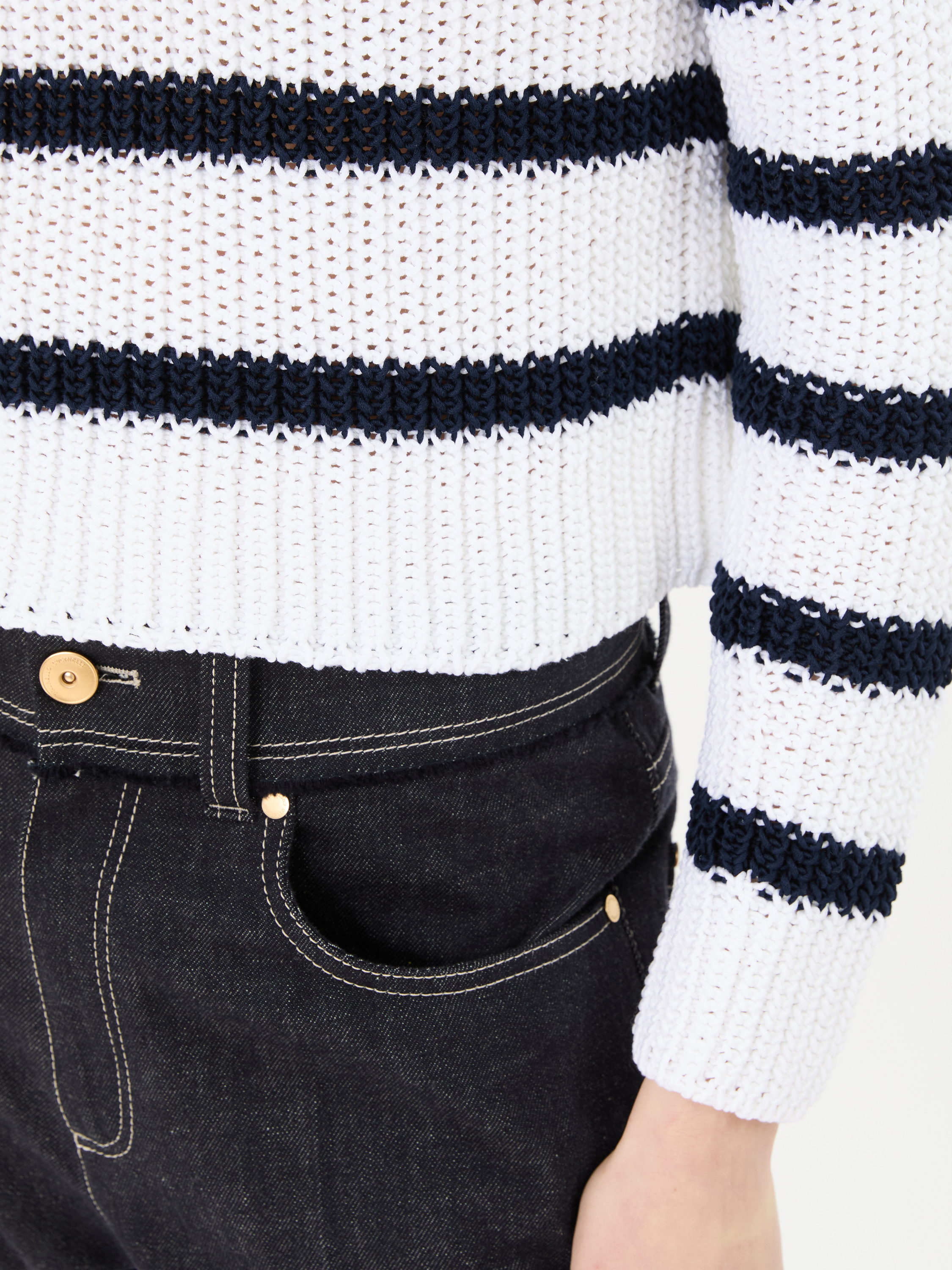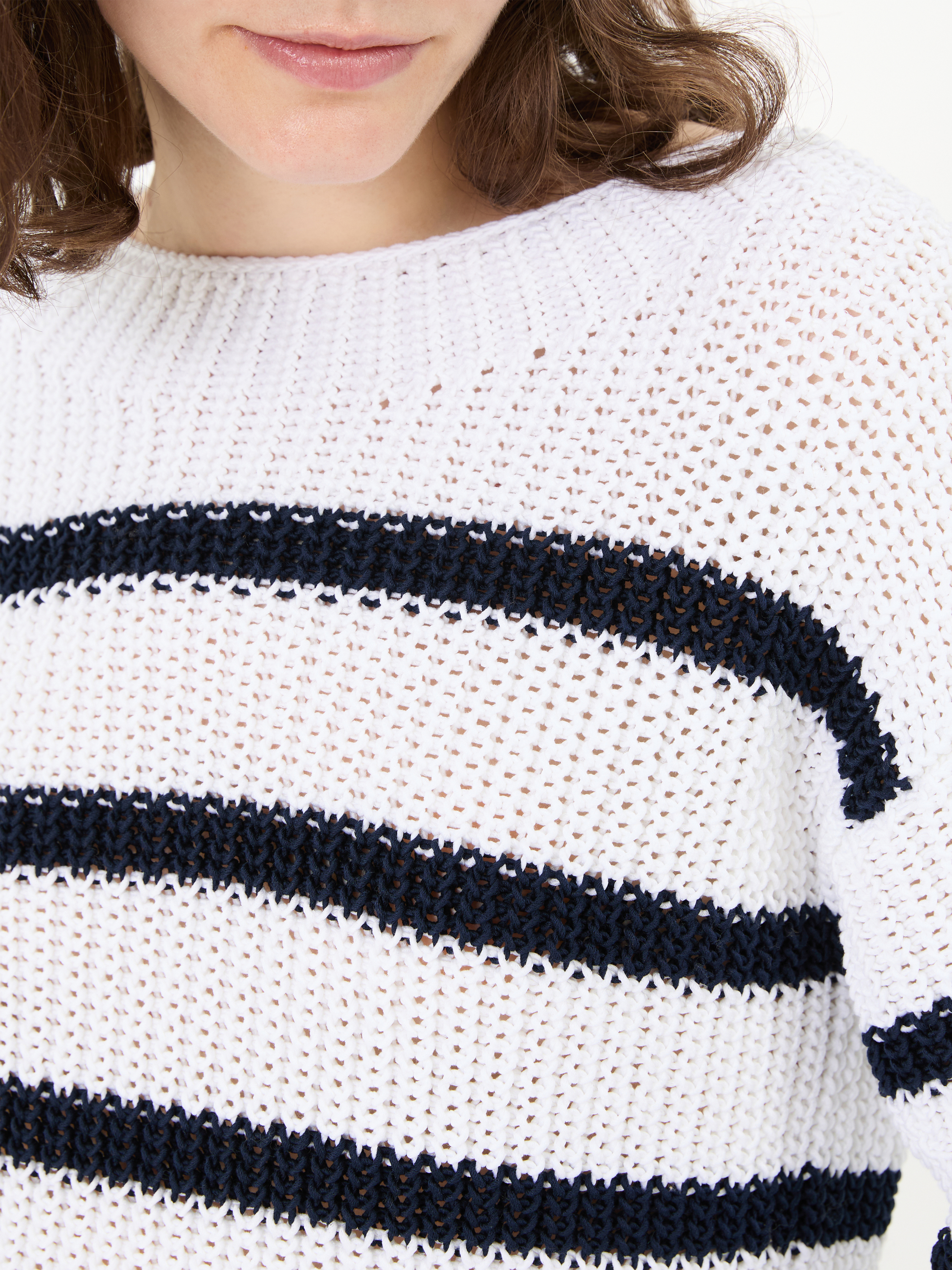 Der Pullover 'Nele' in Off White/Midnight von Iris von Arnim wurde aus einer Baumwollmischung gefertigt und besticht durch eine Lochmusterung. Die lässige Passform, der Rundhalsausschnitt und die Strickstruktur vollenden dieses besondere Modell.