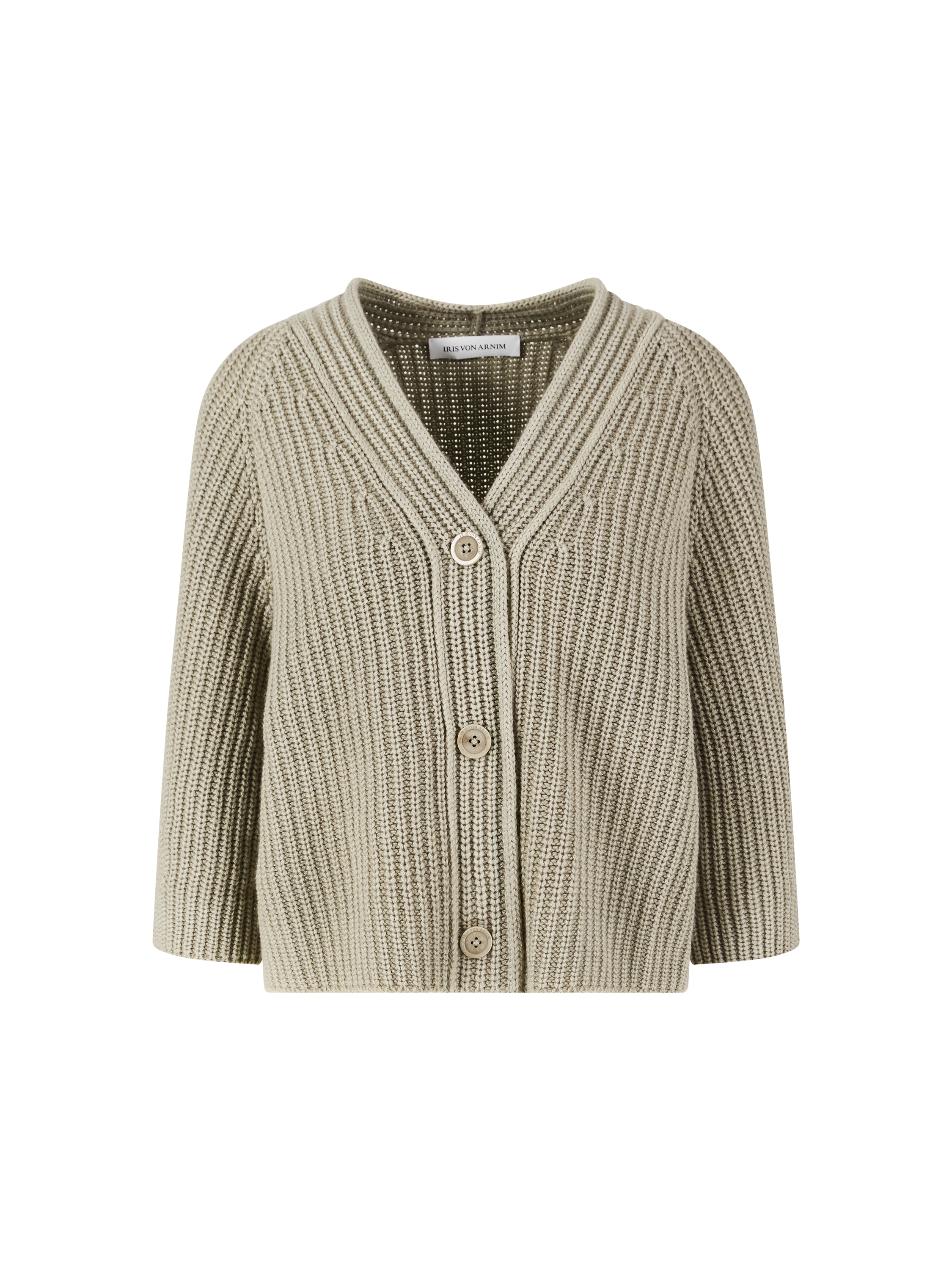 Die Strickjacke 'Fallou Button' in Schilf Stonewashed von Iris von Arnim wurde aus reinem Cashmere gefertigt und besticht durch die verkürzte Länge. Der V-Ausschnitt und die plakative Knopfleiste mit Logoprägung zeichnen dieses hochwertige Modell aus.