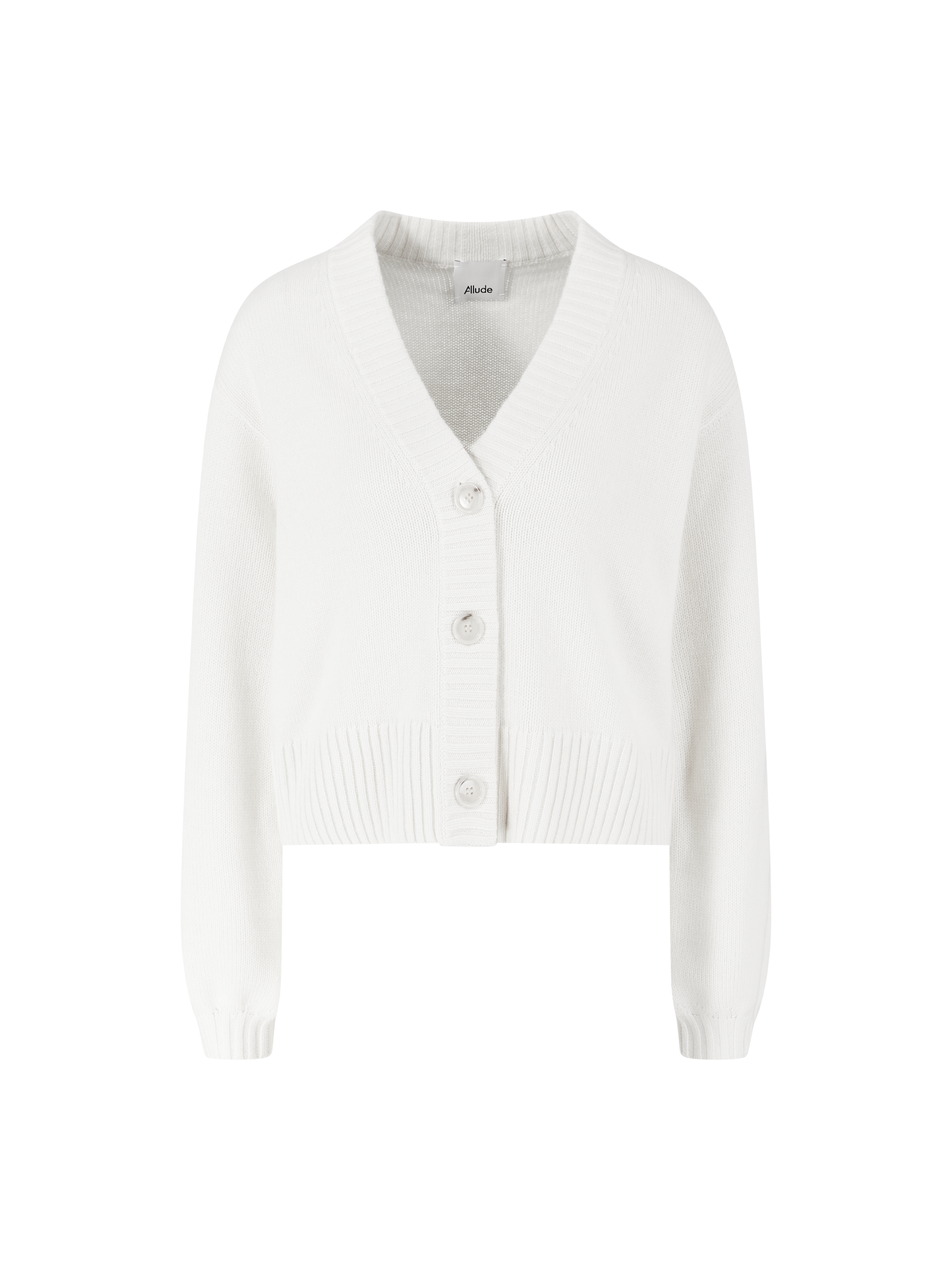 Diese Strickjacke in Weiß von Allude wurde aus reinem Cashmere gefertigt und besticht durch die weite Silhouette. Der tiefe V-Ausschnitt, die markanten Knöpfe und die Ballonärmel zeichnen dieses Modell aus. Die weiche Haptik rundet dieses Design stilvoll ab.