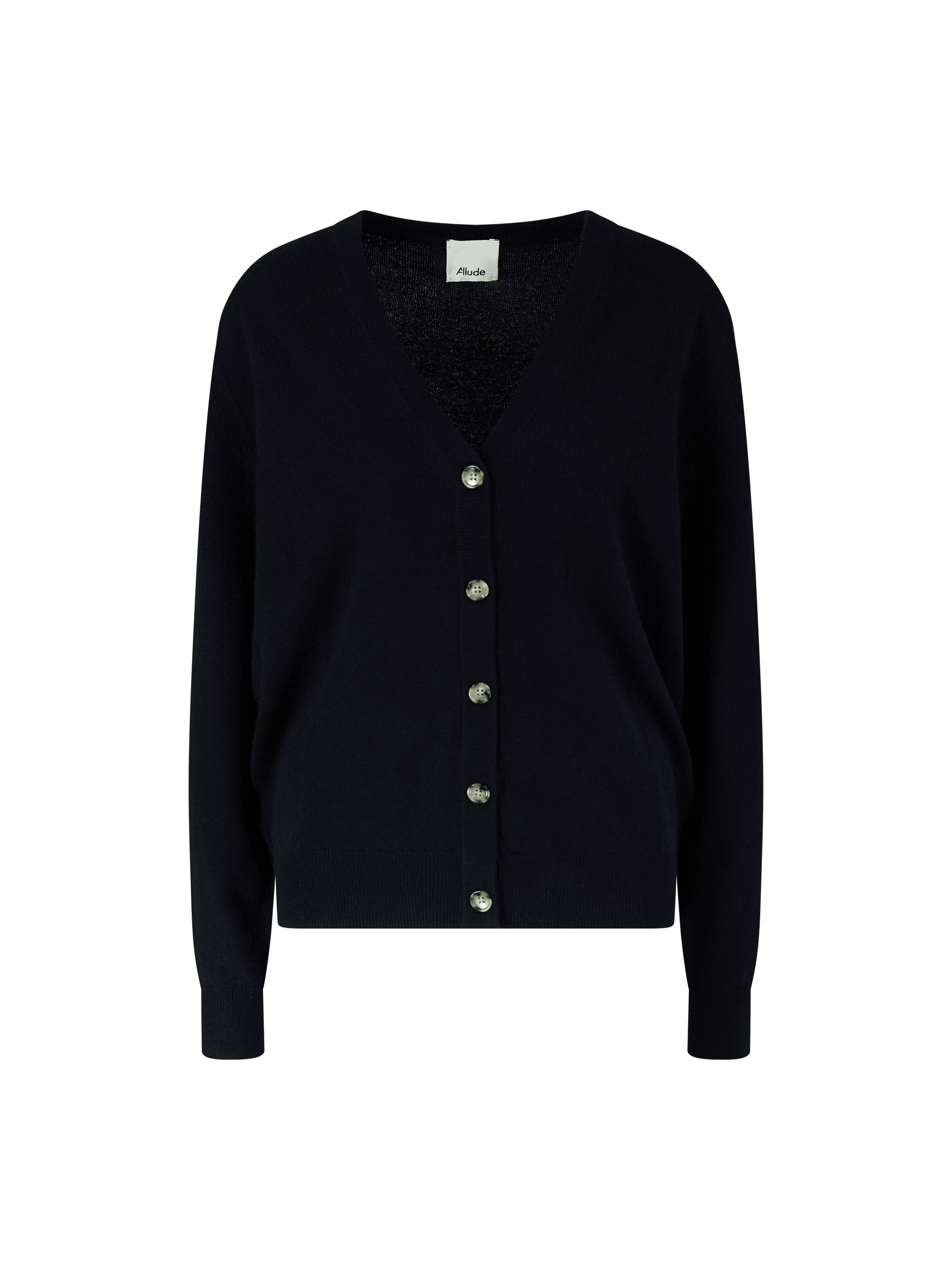 Diese Strickjacke in Marineblau von Allude wurde aus feinstem Cashmere gefertigt und besticht durch die klassische Passform. Der V-Ausschnitt und die Kombination aus Ripp- und Feinstrick zeichnen dieses Modell aus. Die einreihige Knopfleiste und die weiche Haptik runden dieses Design stilvoll ab.