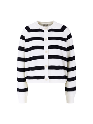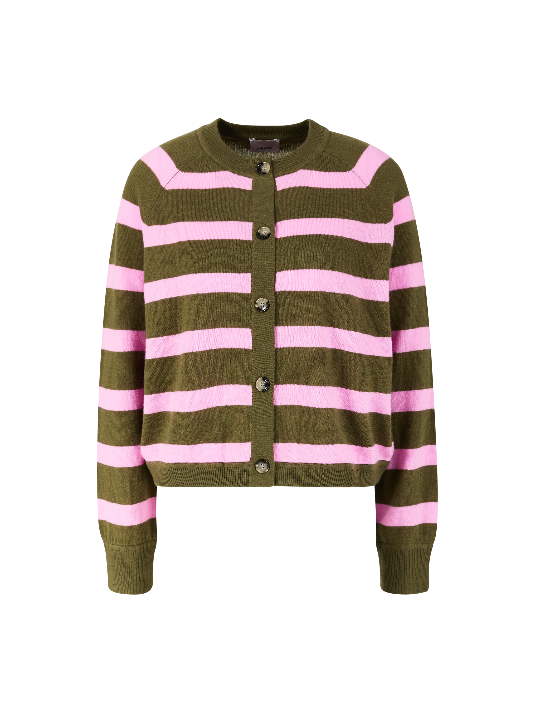 Diese Strickjacke in Olivgrün/Pink von Allude wurde aus einer hochwertigen Schurwoll-Cashmere-Mischung gefertigt und besticht durch das markante Streifenmuster. Die gerade Silhouette, die Raglanärmel und die klassische Knopfleiste verleihen dem Modell eine moderne und zugleich zeitlose Note. Die Rippstrickbündchen und der Rundhalsausschnitt runden das Design harmonisch ab.