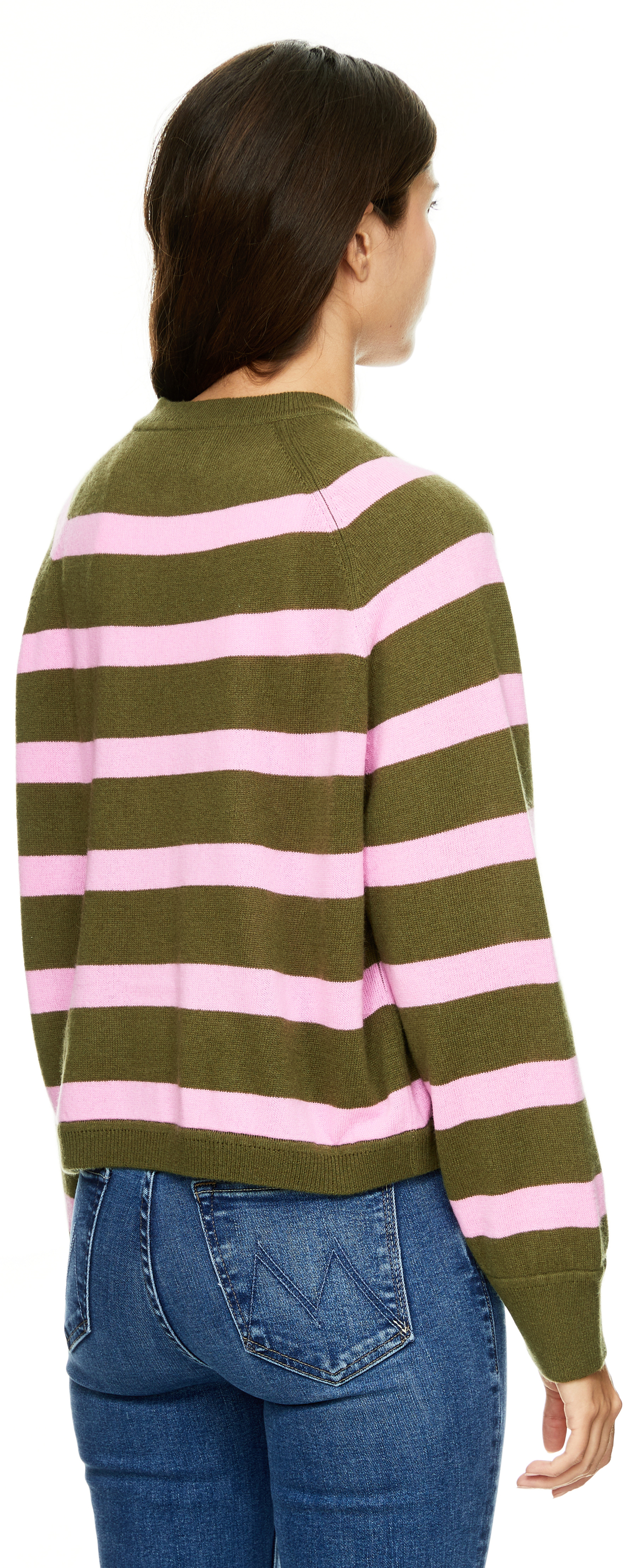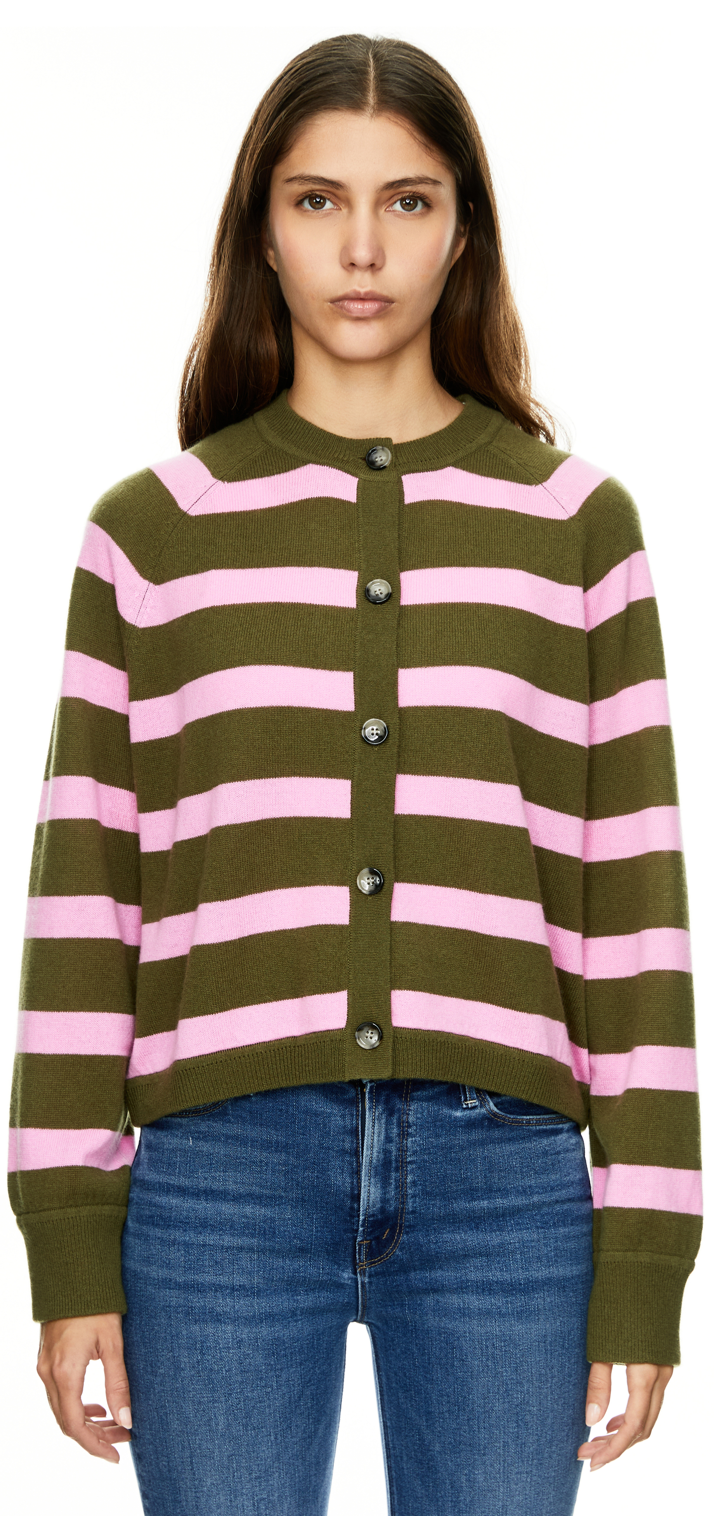 Gestreifte Woll-Cashmere-Strickjacke Olivgrün/Pink