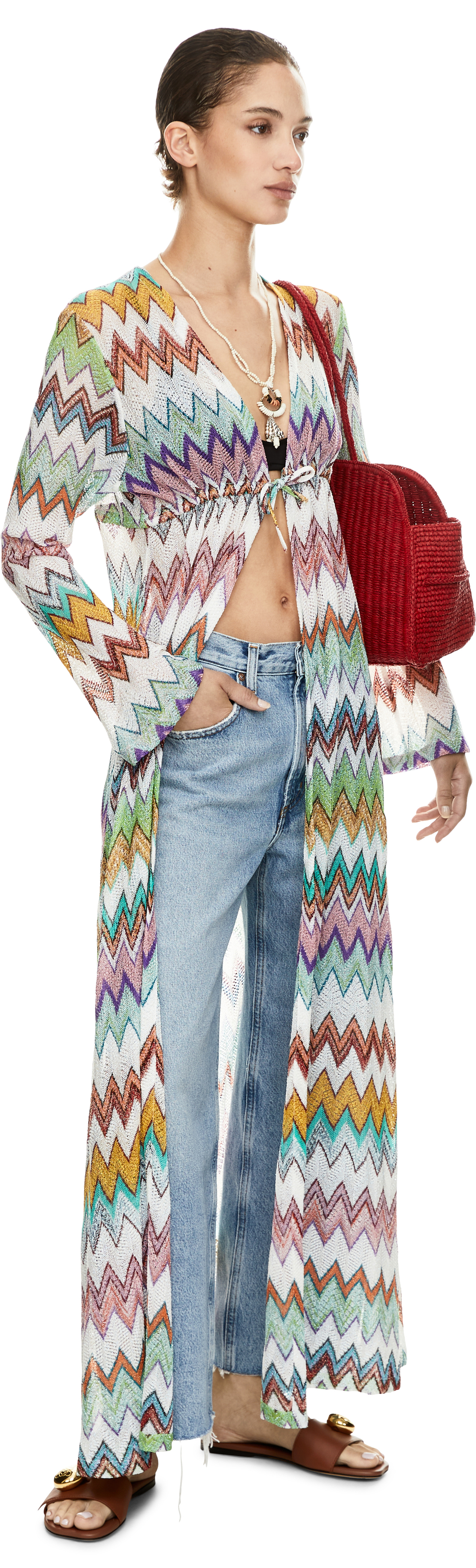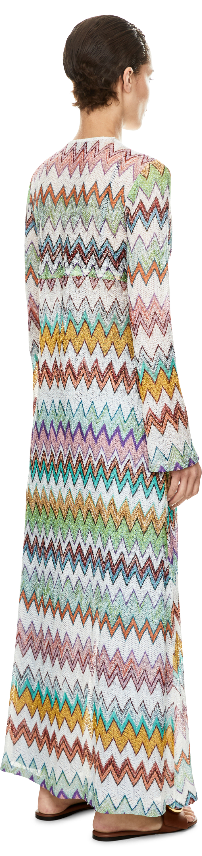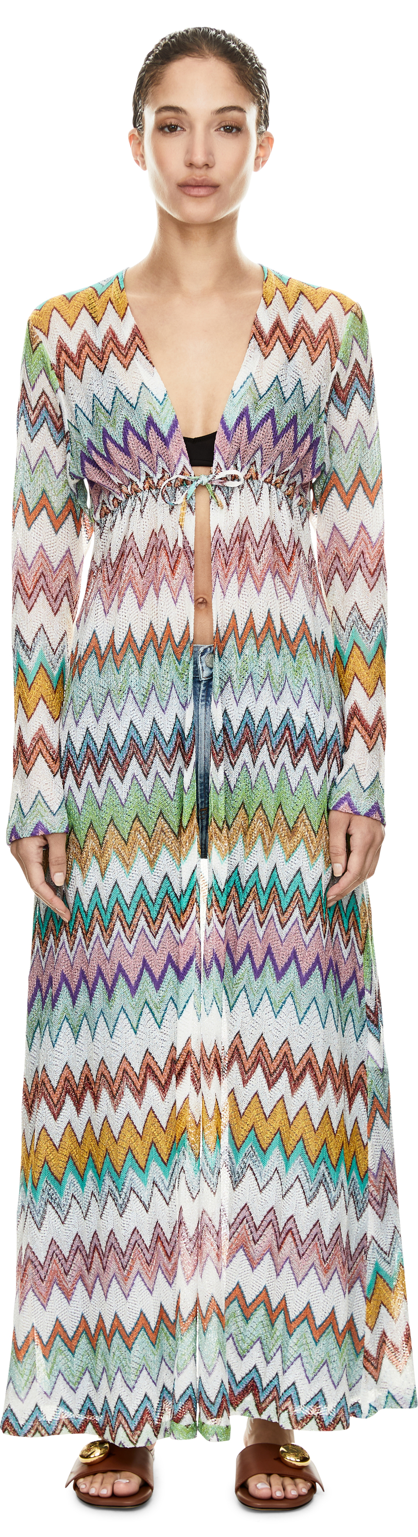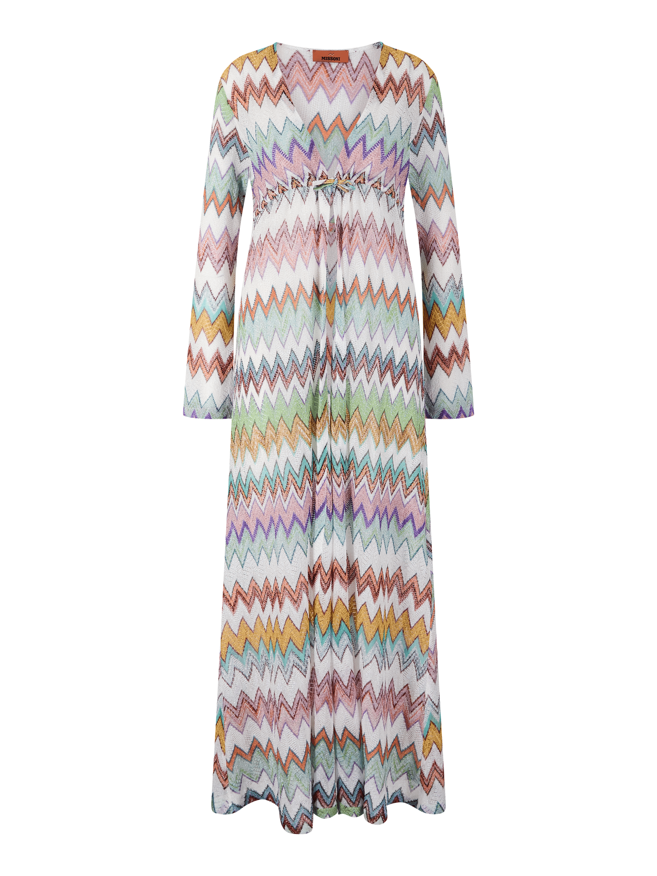 Diese Strickjacke in Multi von Missoni wurde aus einer Viskose-Lamé-Mischung gefertigt und besticht durch die fließende, schimmernde Silhouette. Die offene Vorderseite, die langen Ärmel sowie die charakteristische, Zickzack-Muster verleihen dem Design eine besondere Eleganz.