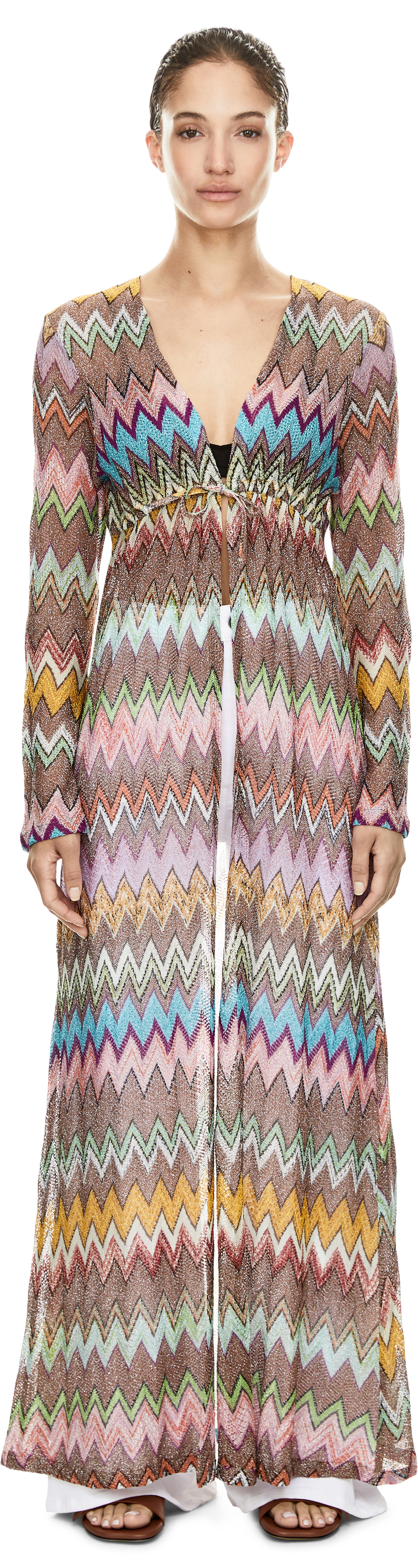Diese Strickjacke in Multi von Missoni wurde aus einer Viskose-Lamé-Mischung gefertigt und besticht durch die fließende, schimmernde Silhouette. Die offene Vorderseite, die langen Ärmel sowie die charakteristische, bunte Farbgebung verleihen dem Design eine besondere Eleganz.