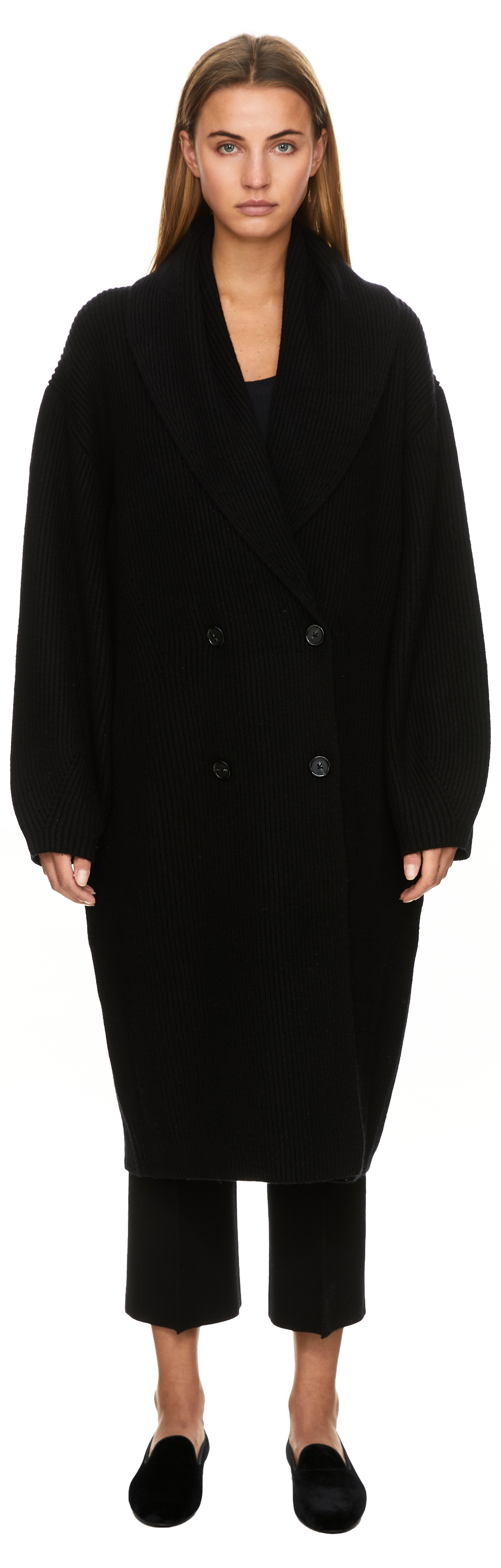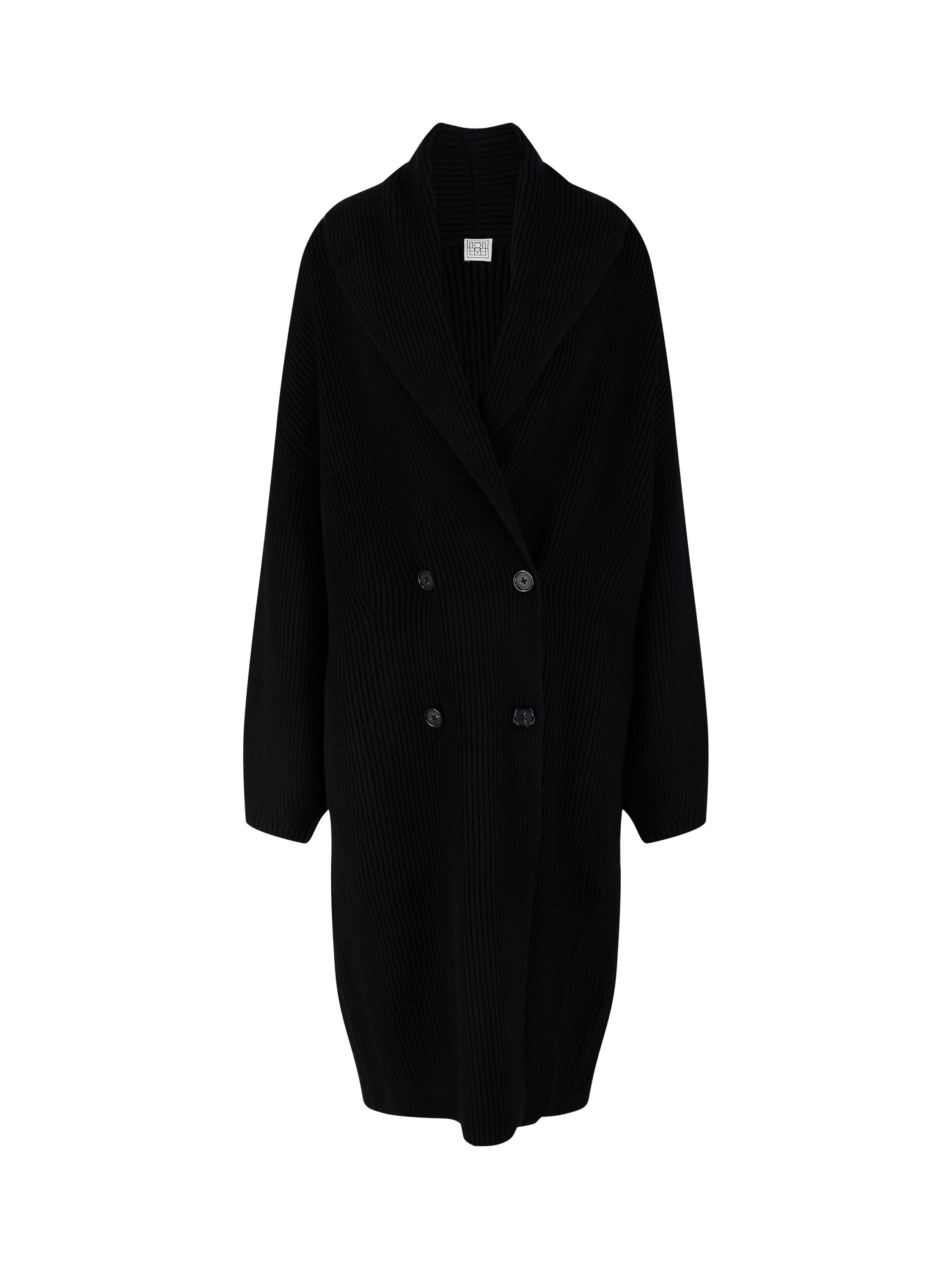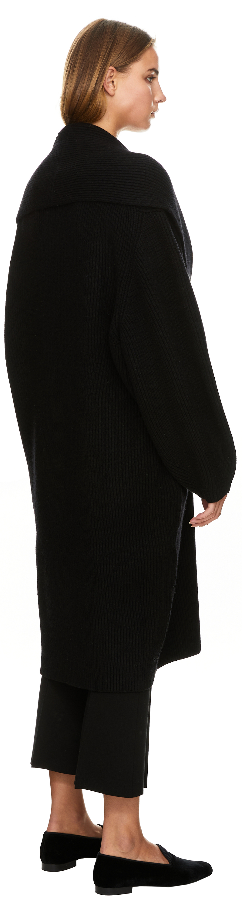 Dieser Cardigan in Schwarz von TOTEME wurde aus einer Wollmischung gefertigt und besticht durch die lange Passform. Das hochwertige Modell wird durch den groben, strukturierten Strick und die zwei seitlichen Eingrifftaschen stilvoll ergänzt. Der Schalkragen verleiht dem Design eine feminine Silhouette.