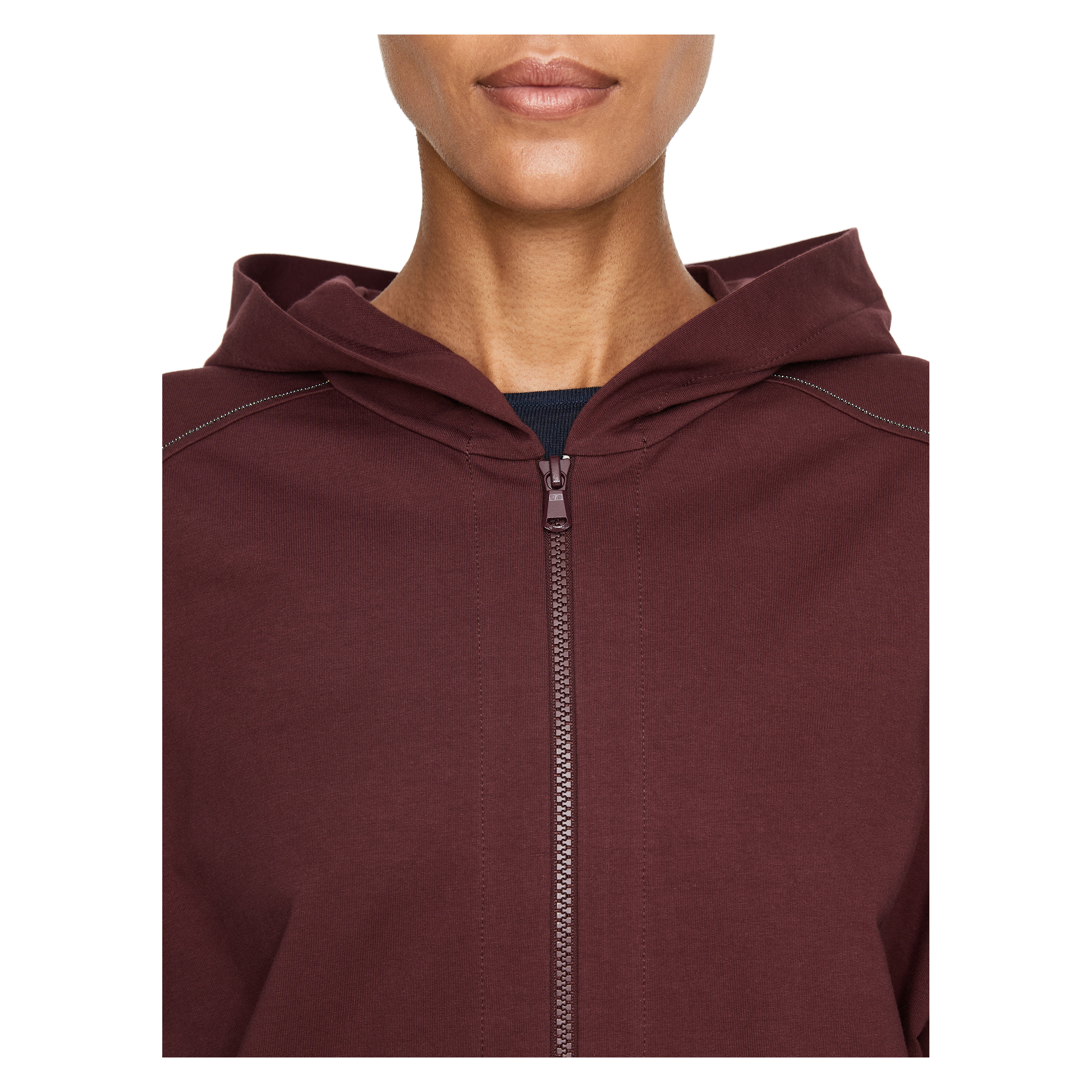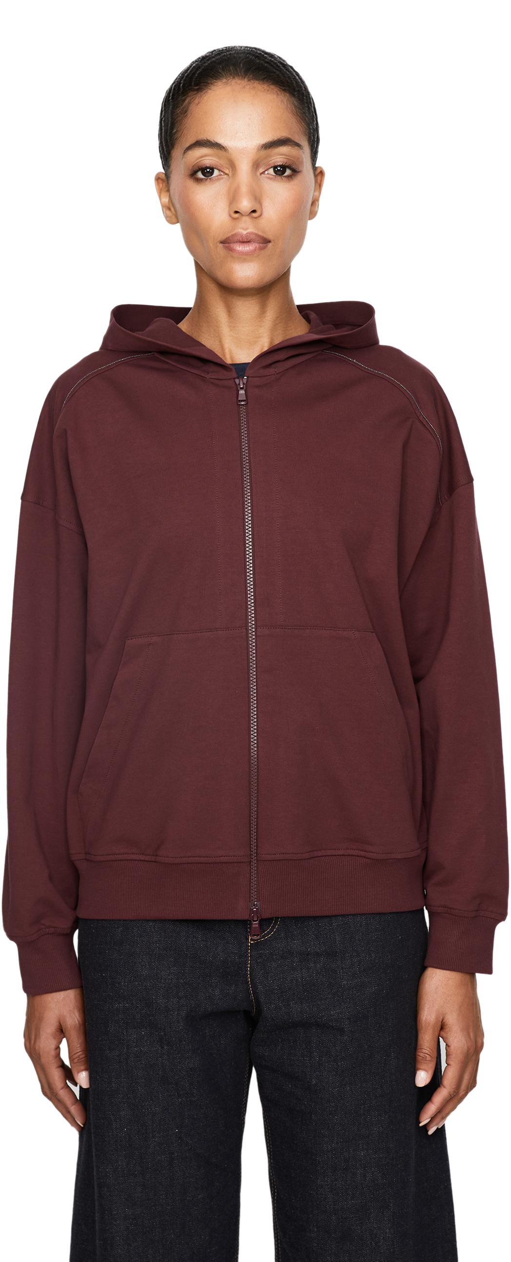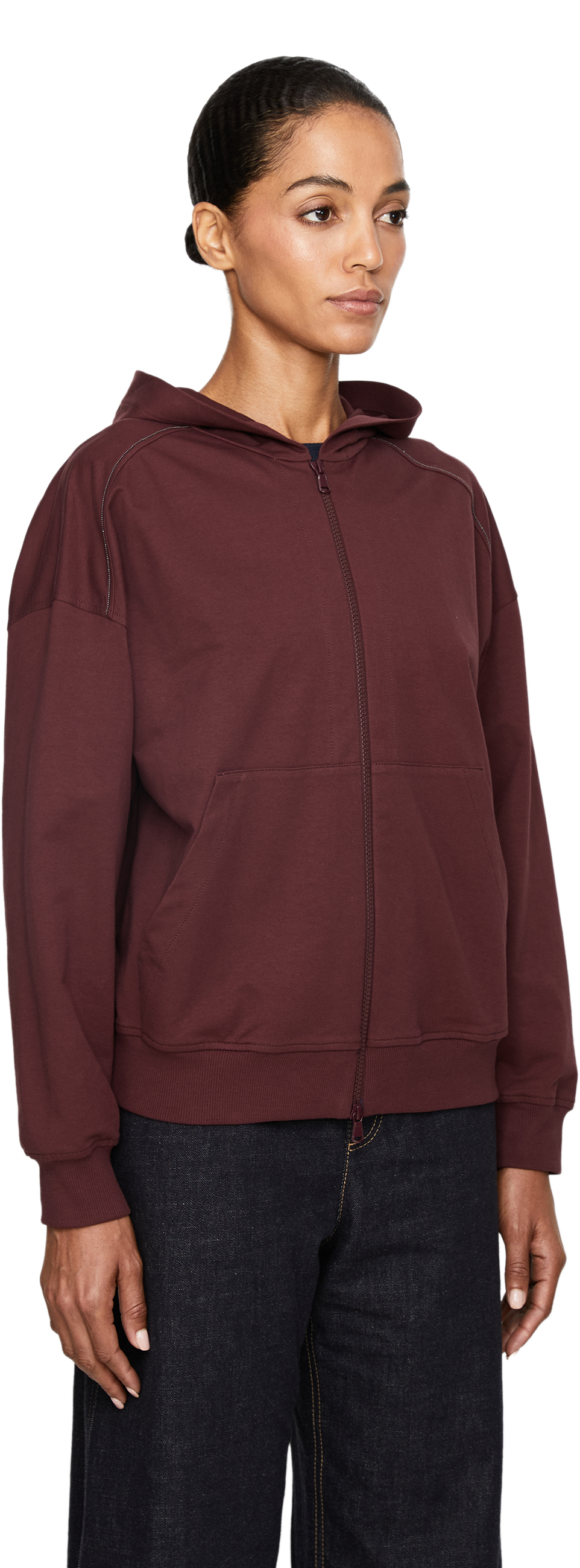 Diese Sweatjacke in Bordeaux von Brunello Cucinelli wurde aus hochwertiger Baumwolle gefertigt und besticht durch die überschnittenen Schultern. Die lockere Passform und die Kängurutasche machen dieses Modell zu einem echten Hingucker. Der Reißverschluss und die Monili-Perlen am Raglanärmel vollenden dieses Design.