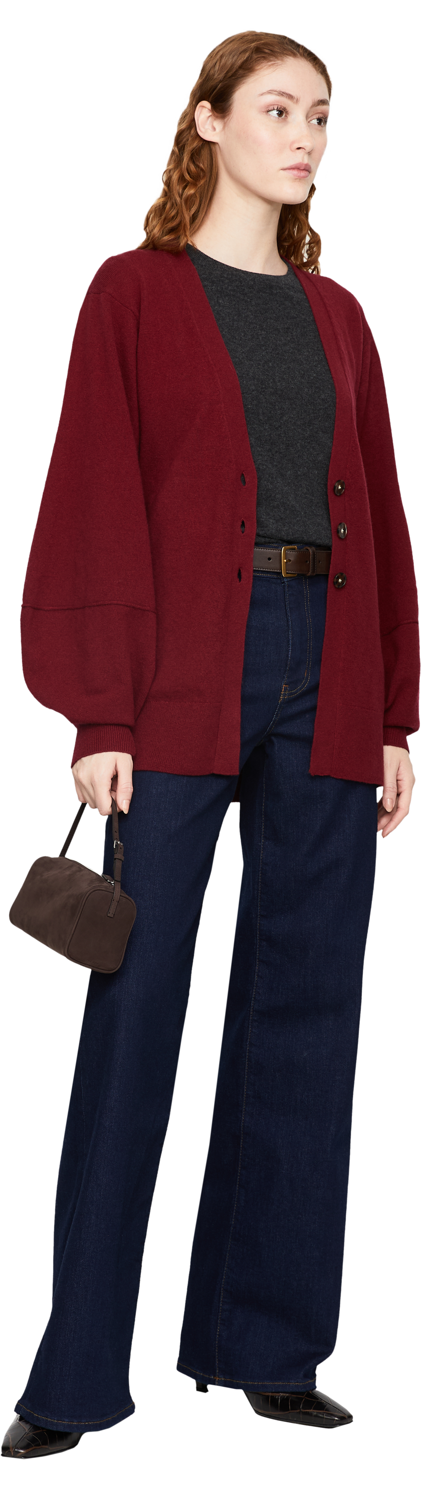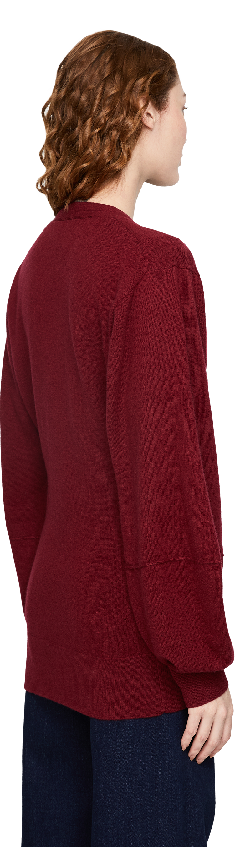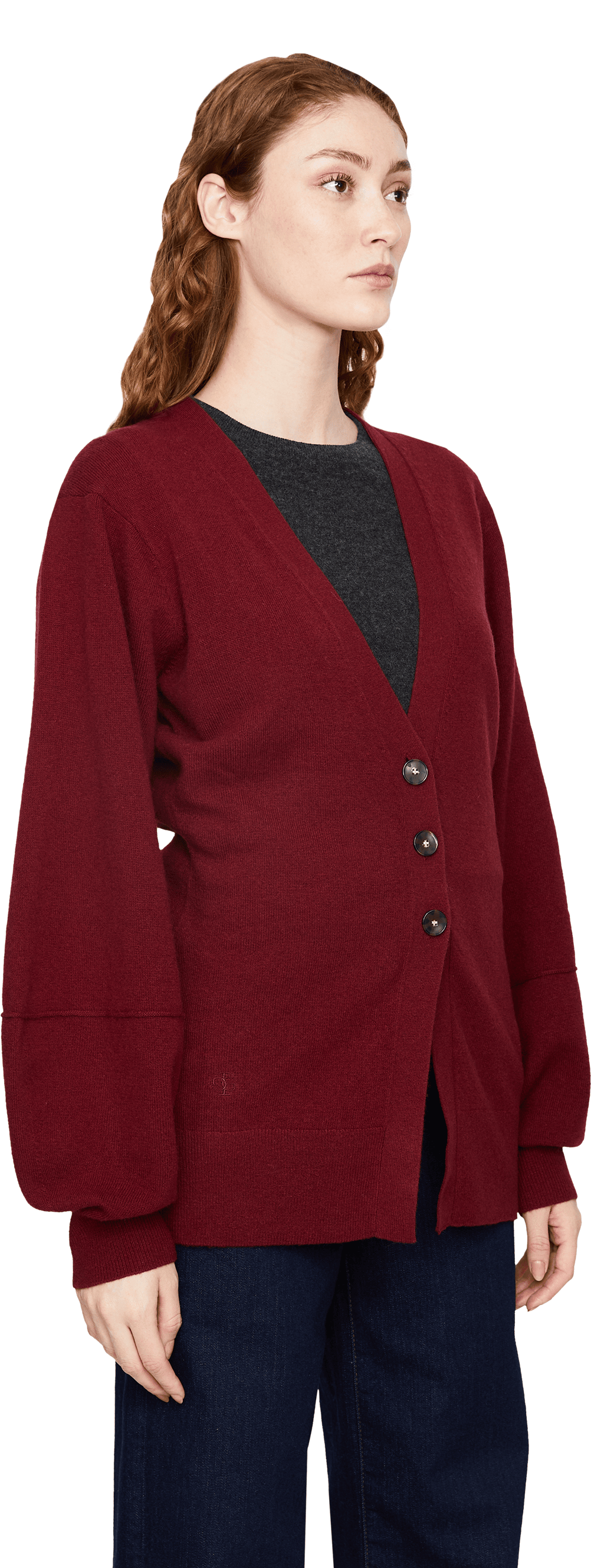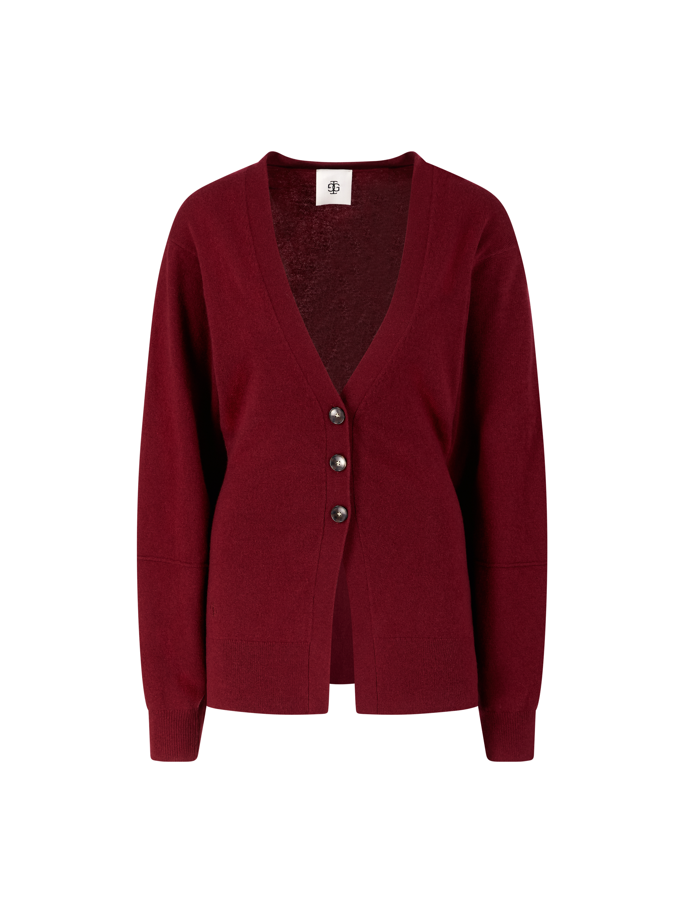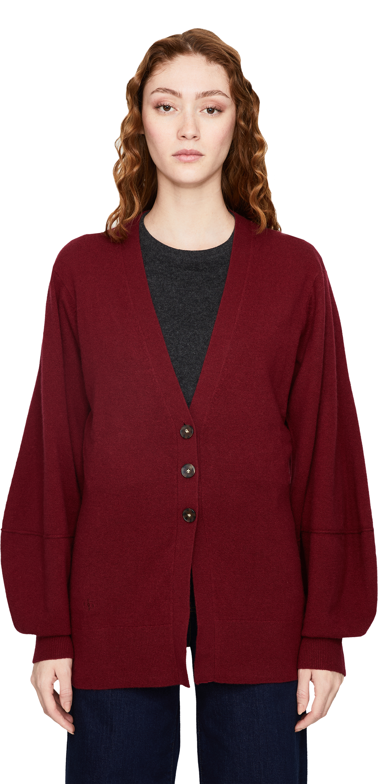 Die Strickjacke 'Como' in Bordeaux von THE GARMENT wurde aus einer hochwertigen Woll-Cashmere-Mischung gefertigt und besticht durch das klassische Design. Der tiefe V-Ausschnitt, der Drei-Knopf-Verschluss und die Ballonärmel zeichnen dieses Modell aus.