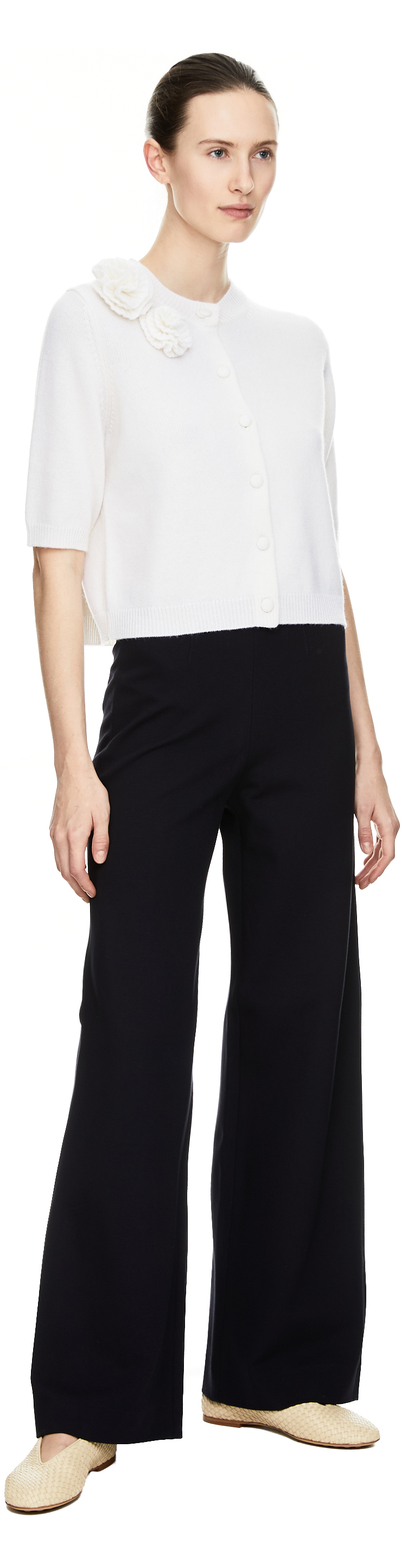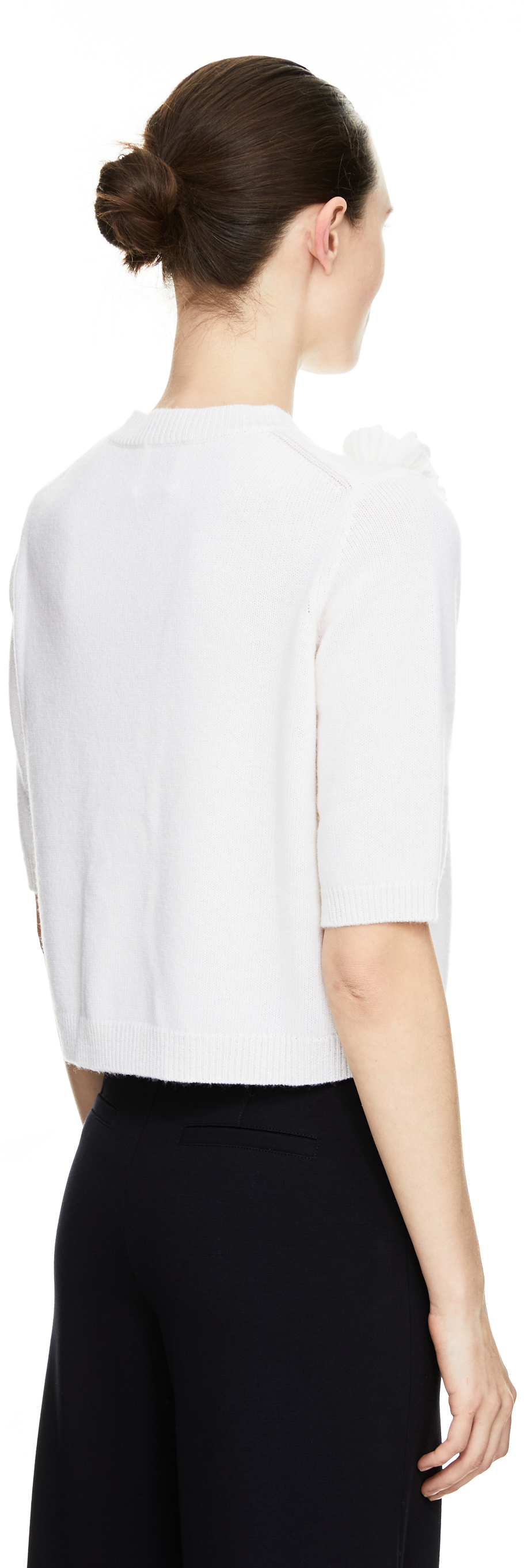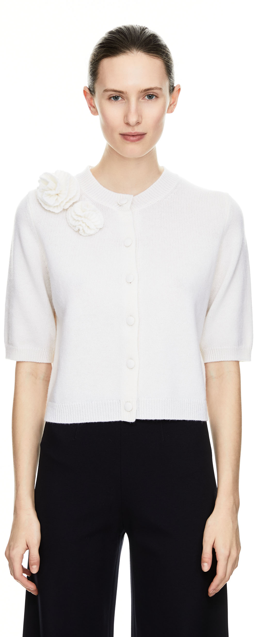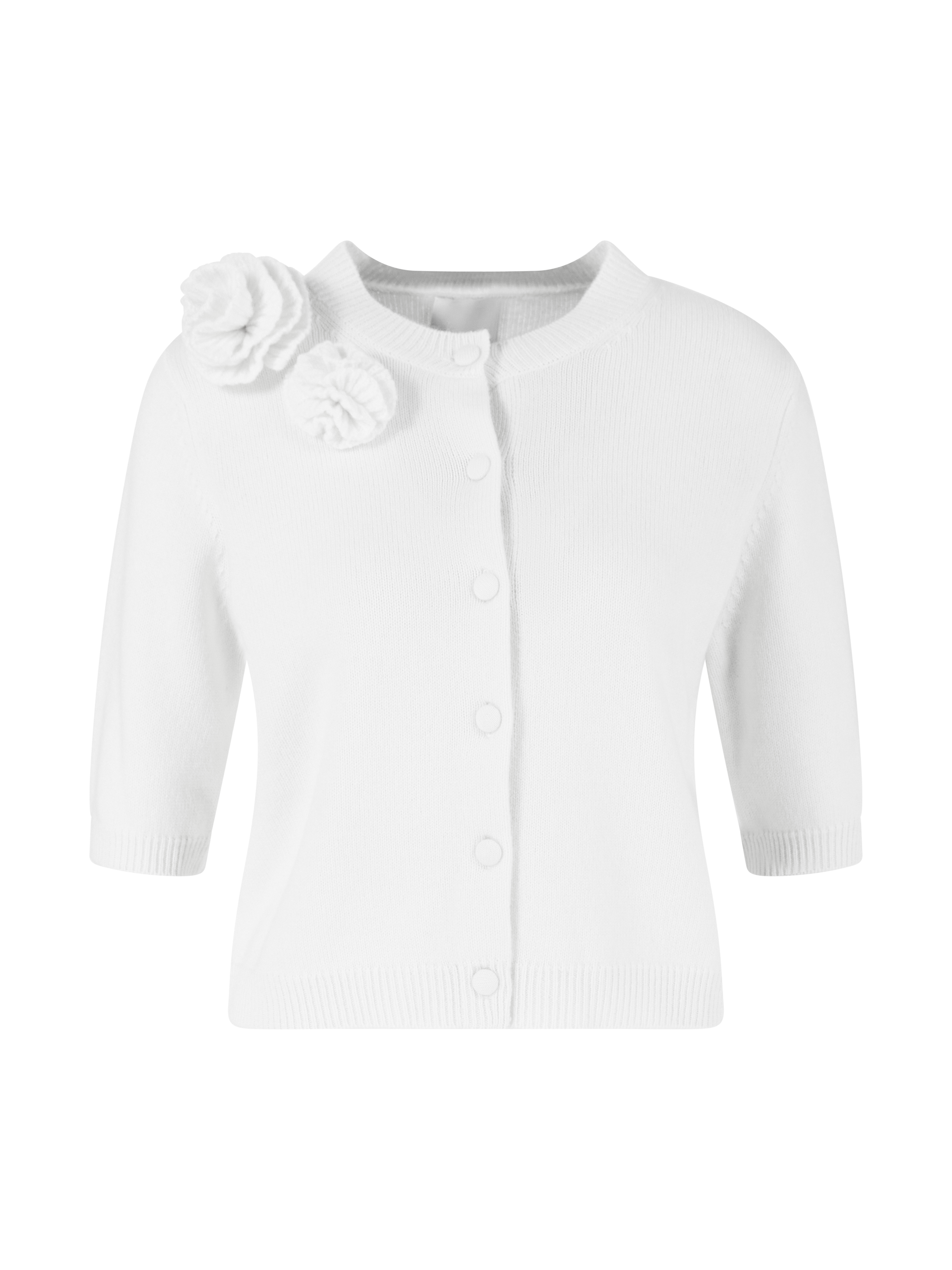 Diese Strickjacke in Weiß von Allude wurde aus einer hochwertigen Woll-Cashmere-Mischung gefertigt und besticht durch das Blumen-Detail. Der Rundhalsausschnitt, die 3/4-Ärmel sowie die gerade Silhouette vervollständigen das stilvolle Modell.