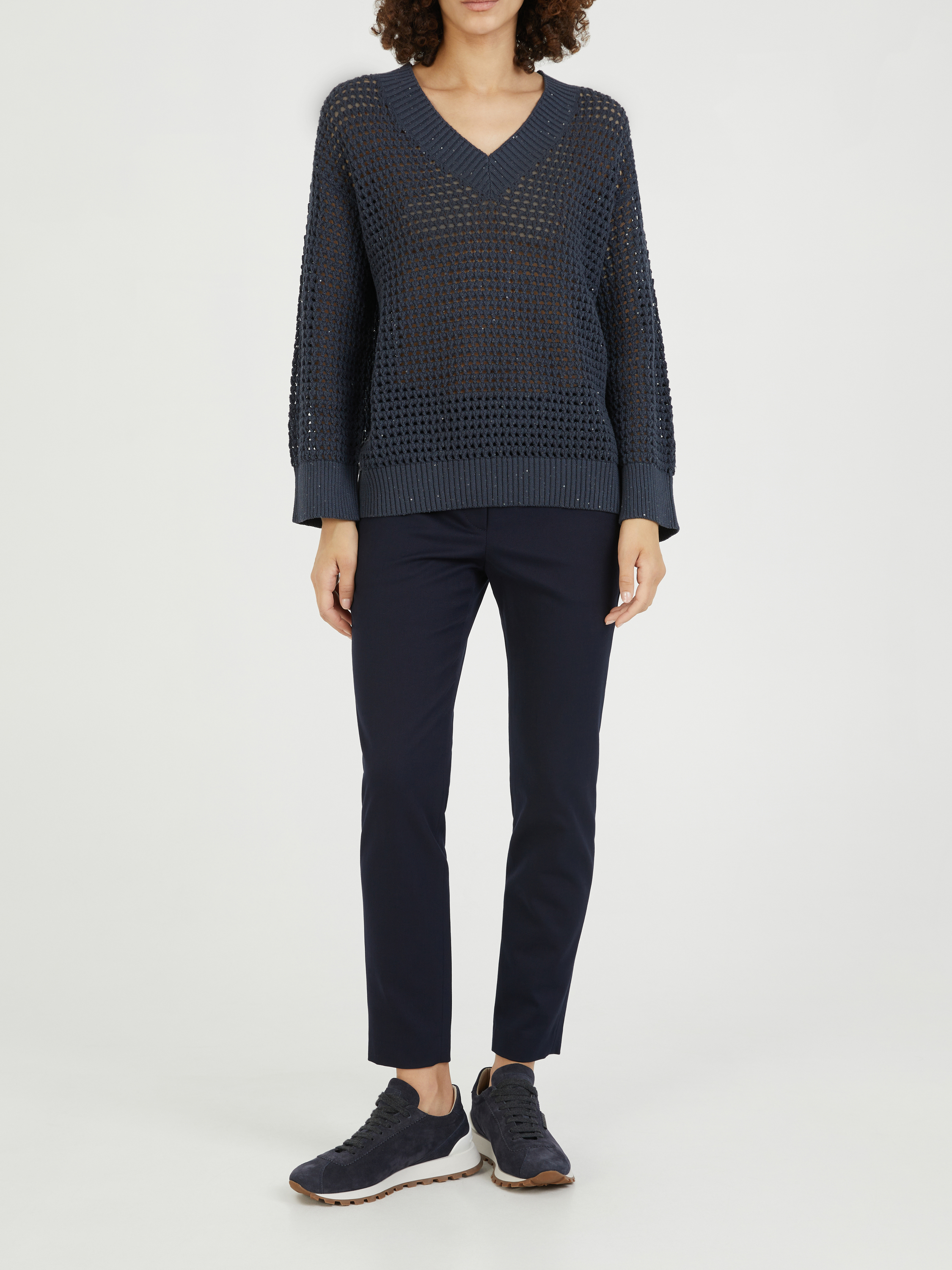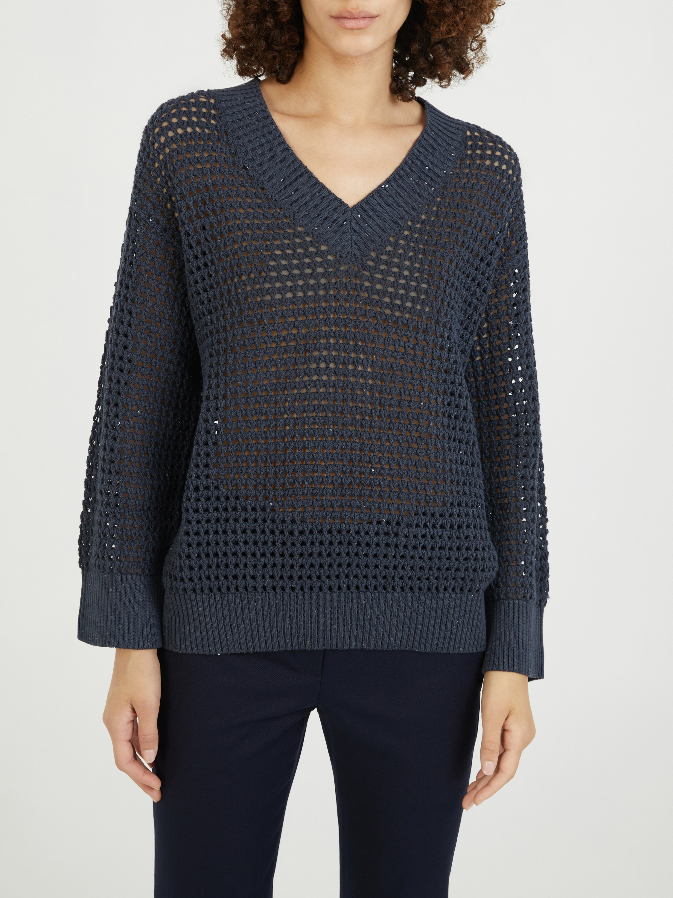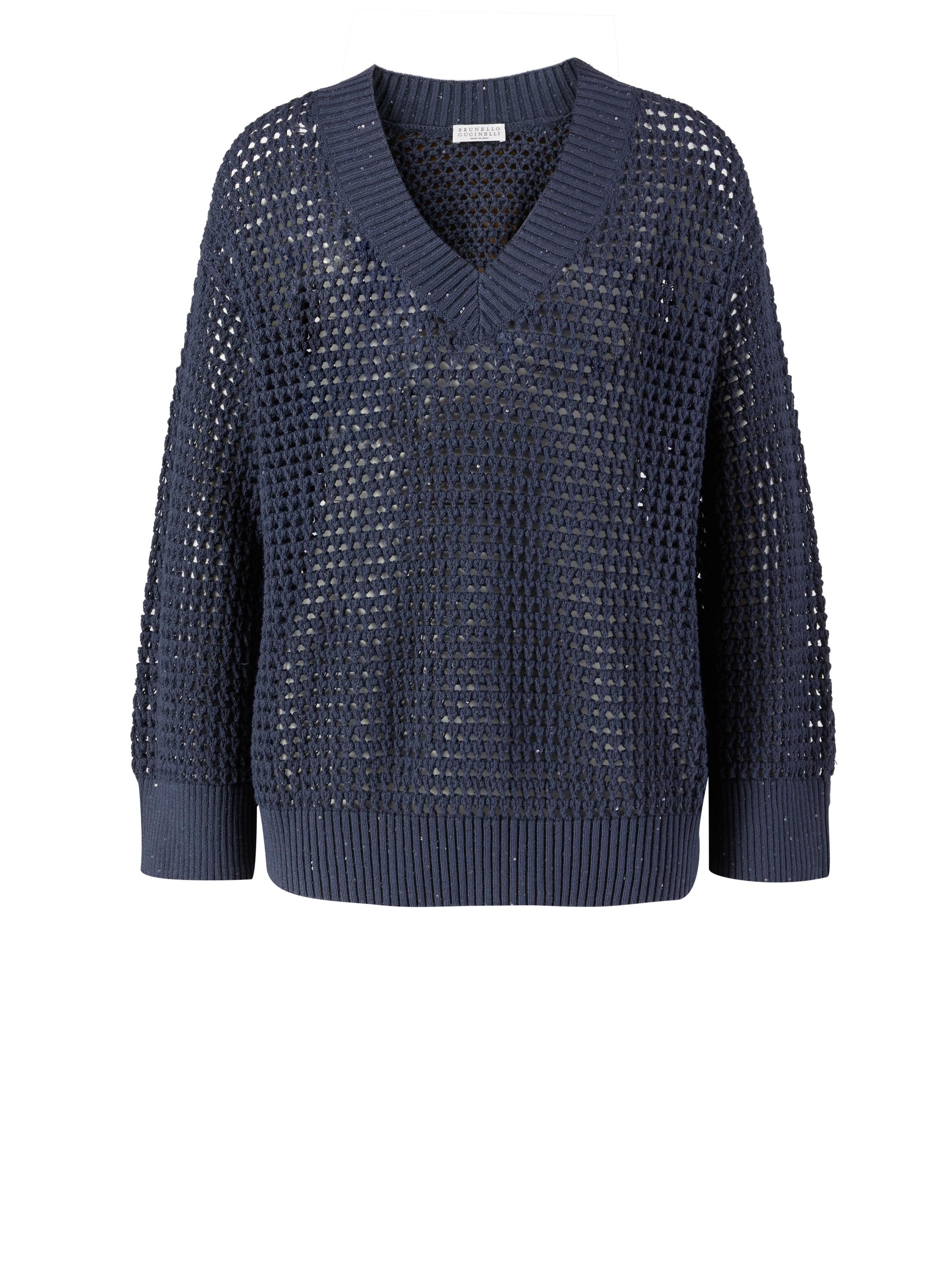 Dieser Pullover in Marineblau Brunello Cucinelli wurde aus einem Baumwollgemisch gefertigt und besticht durch ein Lochmuster. Dieses hochwertige Design überzeugt mit einer lässigen Passform und einem V-Ausschnitt. Der Rippstricksaum und die eingearbeiteten Pailletten vollenden dieses besondere Modell.