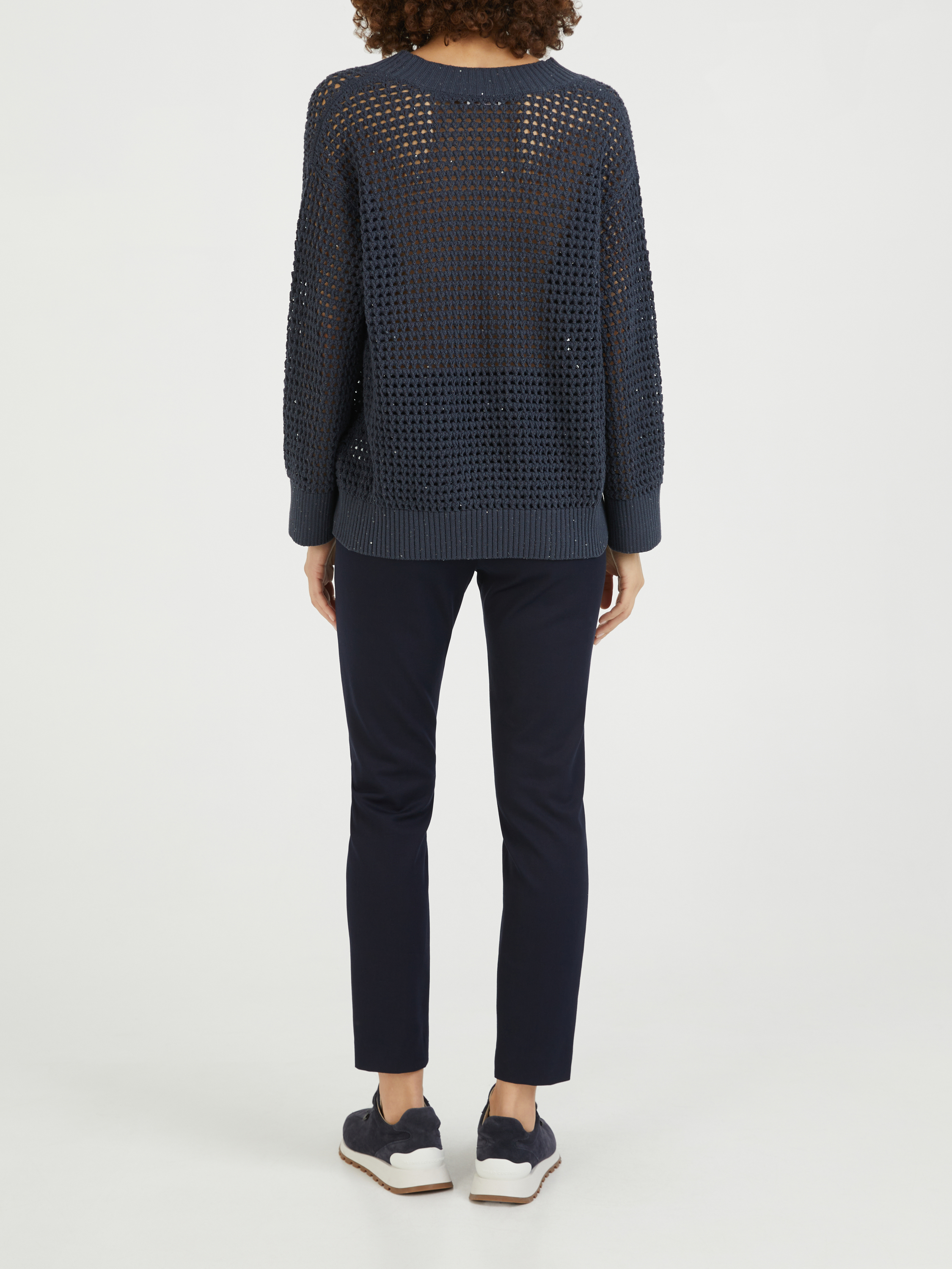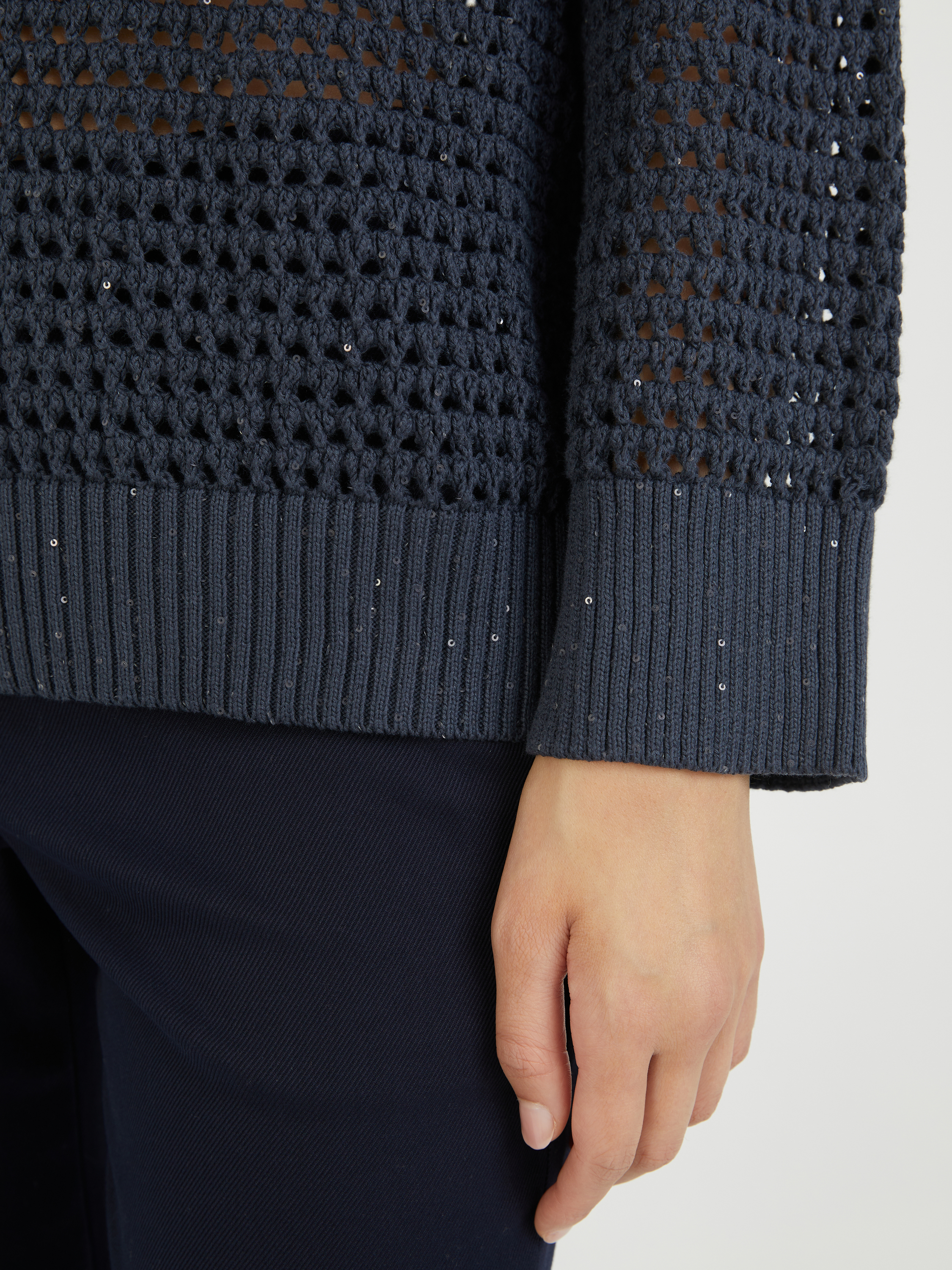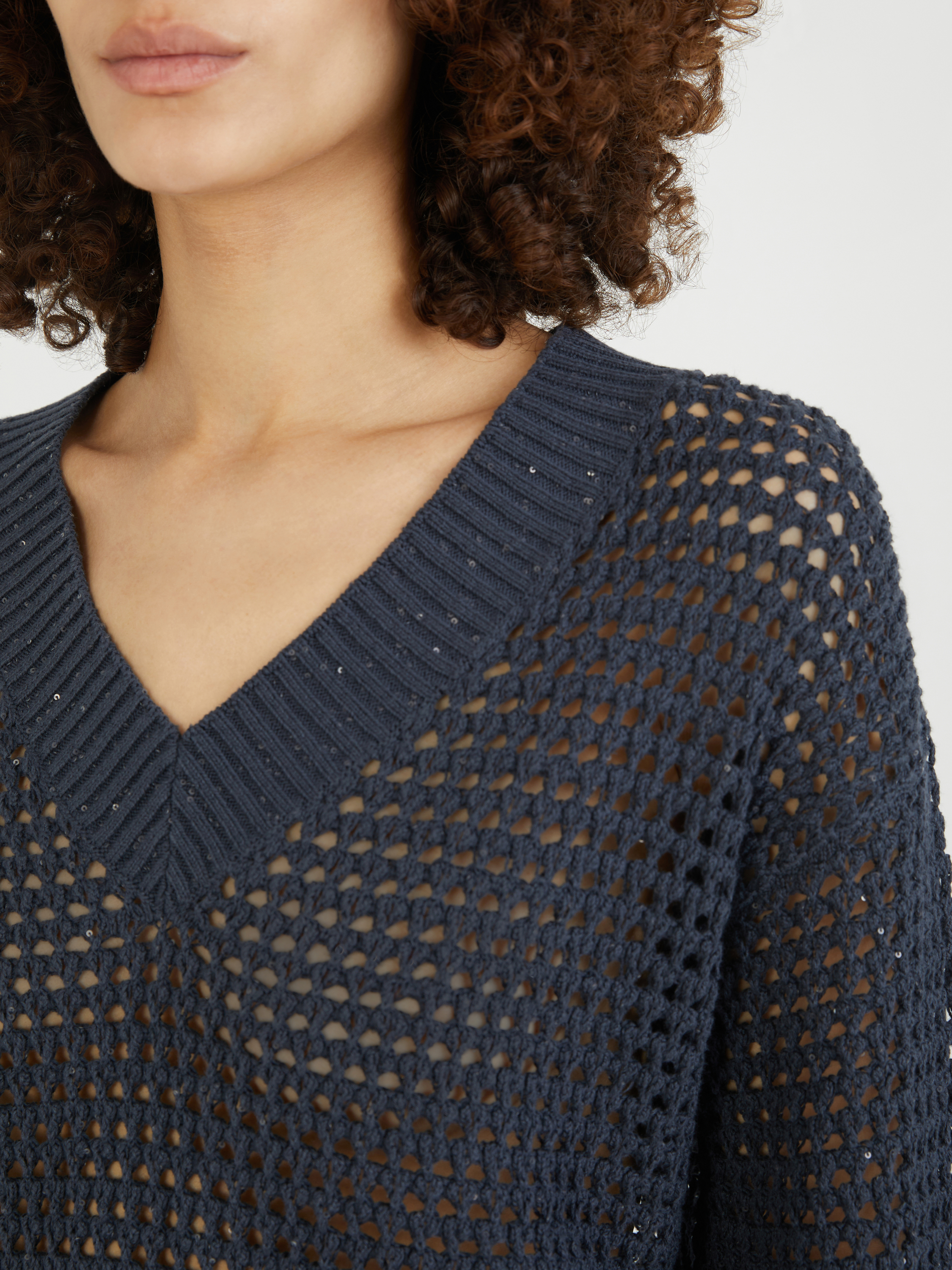 Dieser Pullover in Marineblau Brunello Cucinelli wurde aus einem Baumwollgemisch gefertigt und besticht durch ein Lochmuster. Dieses hochwertige Design überzeugt mit einer lässigen Passform und einem V-Ausschnitt. Der Rippstricksaum und die eingearbeiteten Pailletten vollenden dieses besondere Modell.