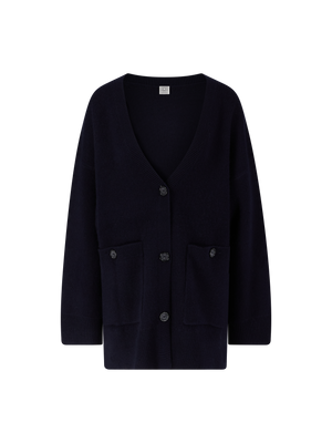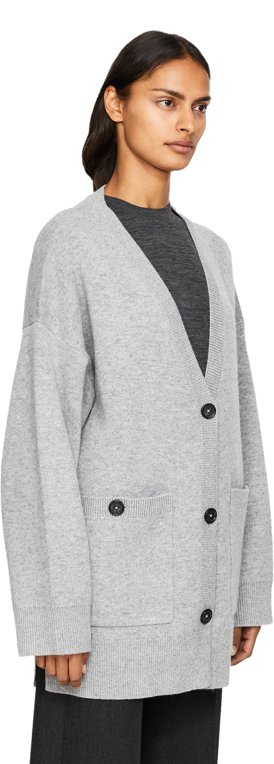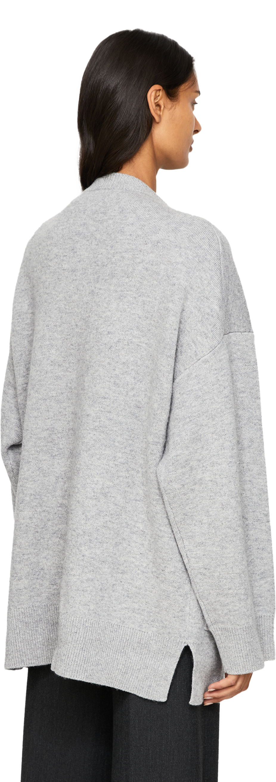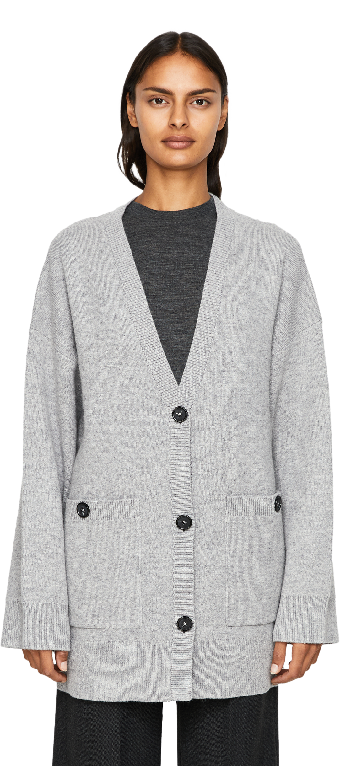 Diese Strickjacke in Grau von TOTEME wurde aus einer Woll-Cashmere-Mischung gefertigt und besticht durch die extralange, überschnittene Silhouette. Die Knopfleiste, die zwei aufgesetzten Taschen sowie die weiche Haptik zeichnen dieses hochwertige Modell aus.