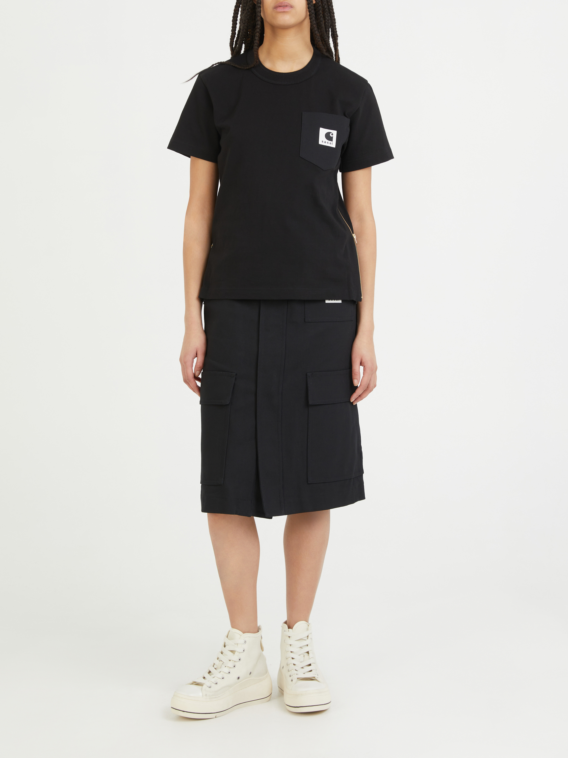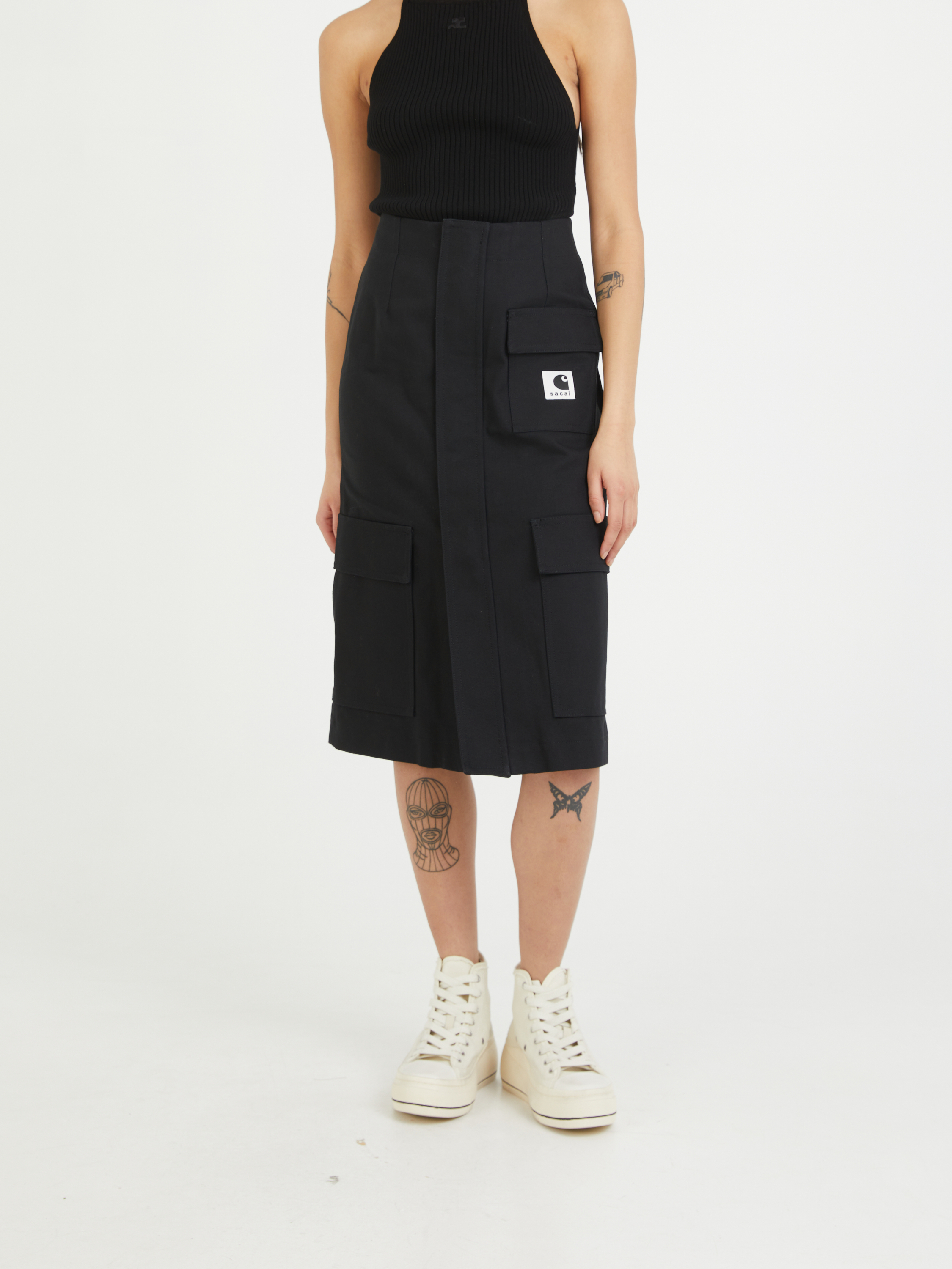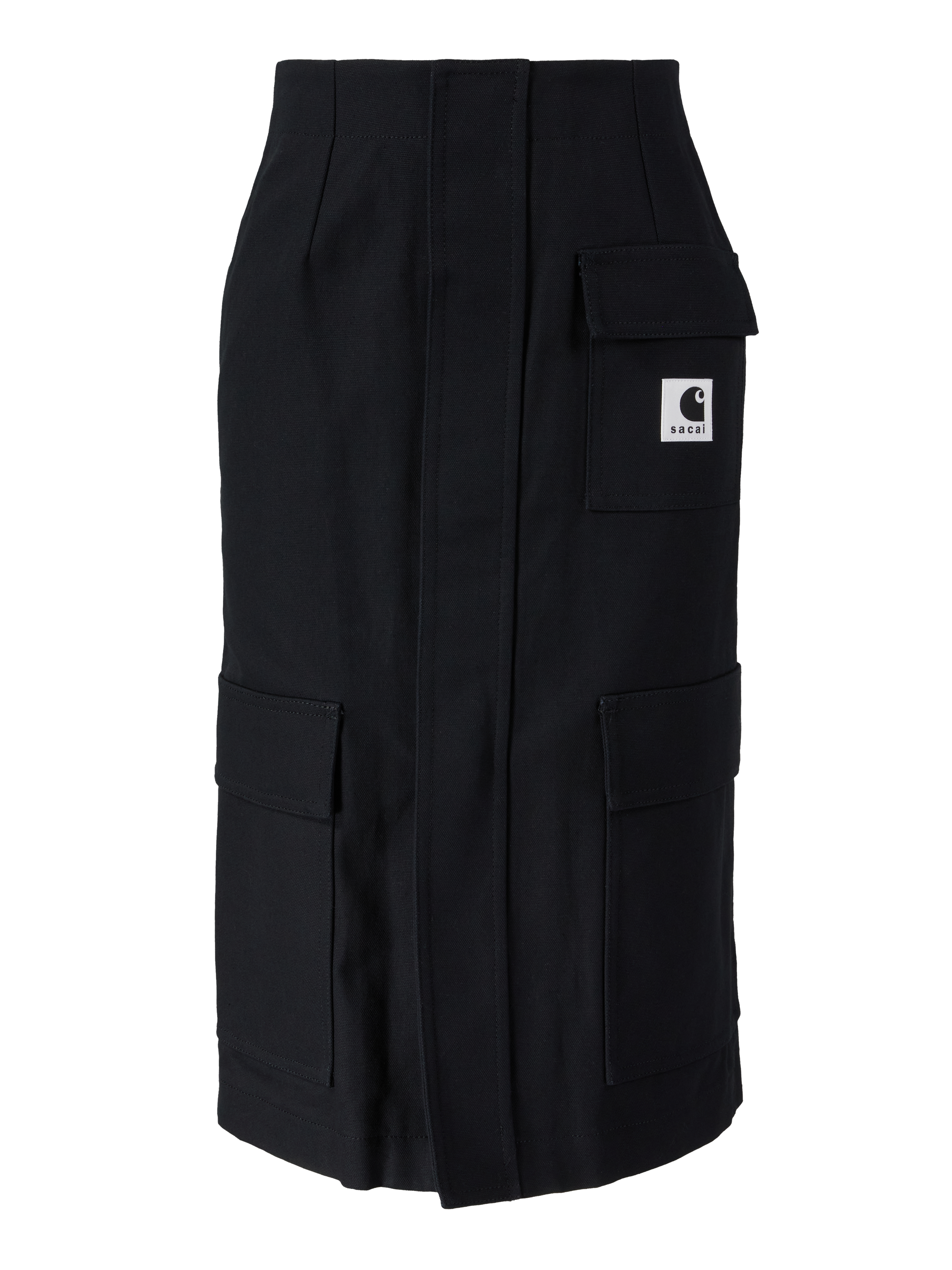 Dieser Rock in Schwarz von Sacai aus der Kollaboration mit Carhartt wurde aus fester Baumwolle gefertigt und besticht durch ein funktionales Design. Die aufgesetzten Taschen mit Logo-Patch, der goldfarbene Reißverschluss und die Midilänge zeichnen dieses Modell aus. Die rückseitigen Falten und die Klettverschlusstaschen machen dieses besondere Design zu einem absoluten Hingucker.
