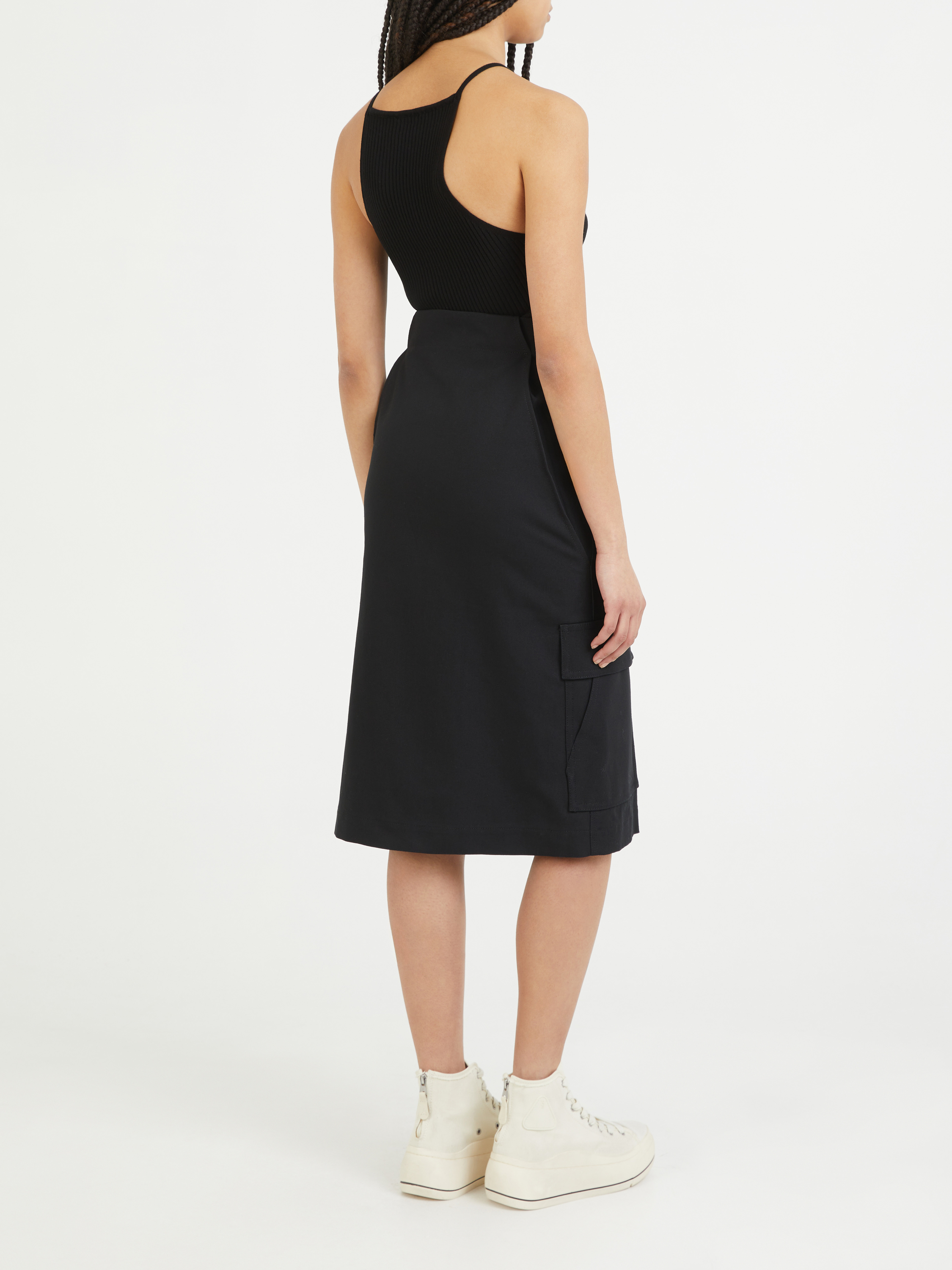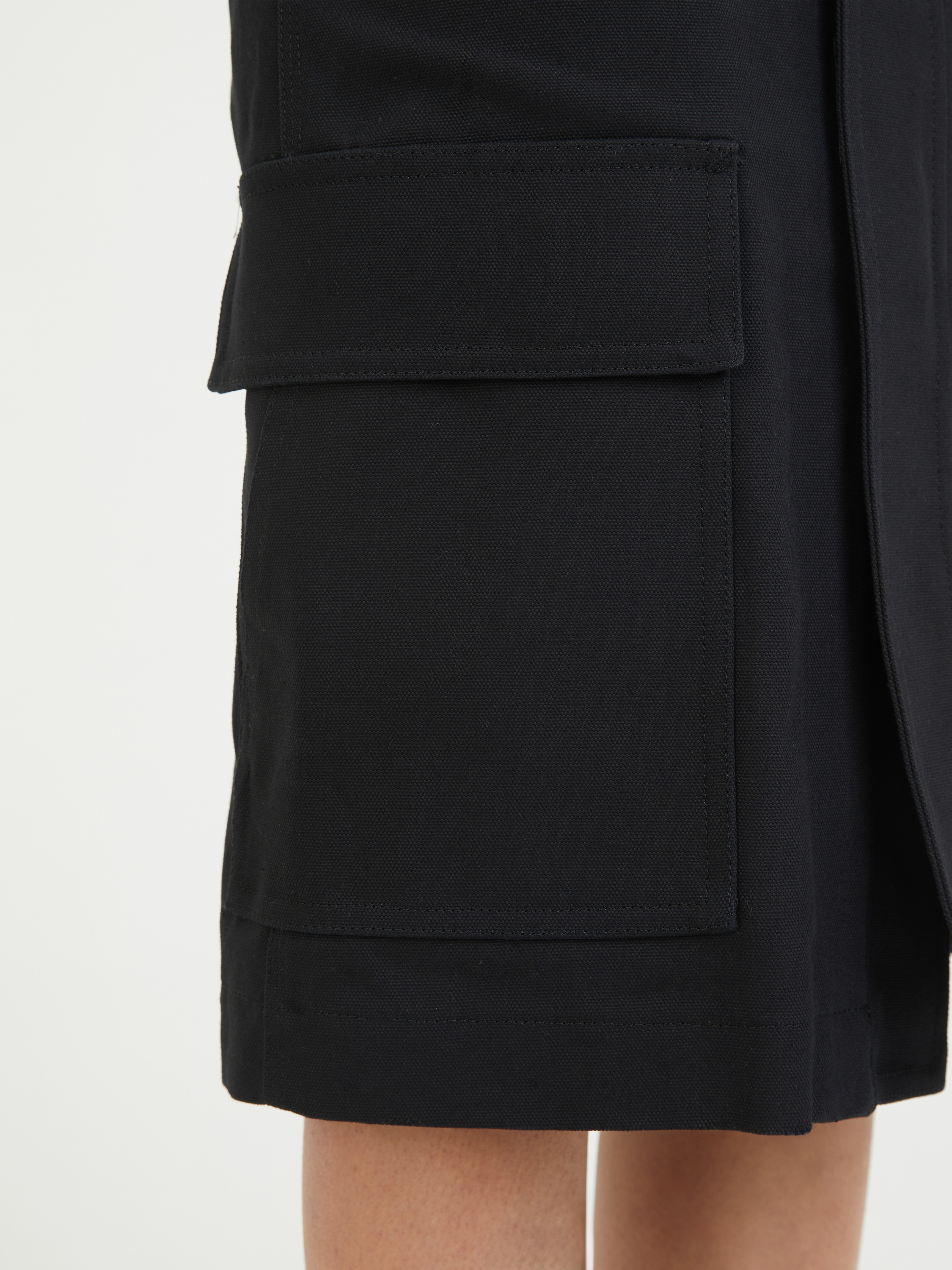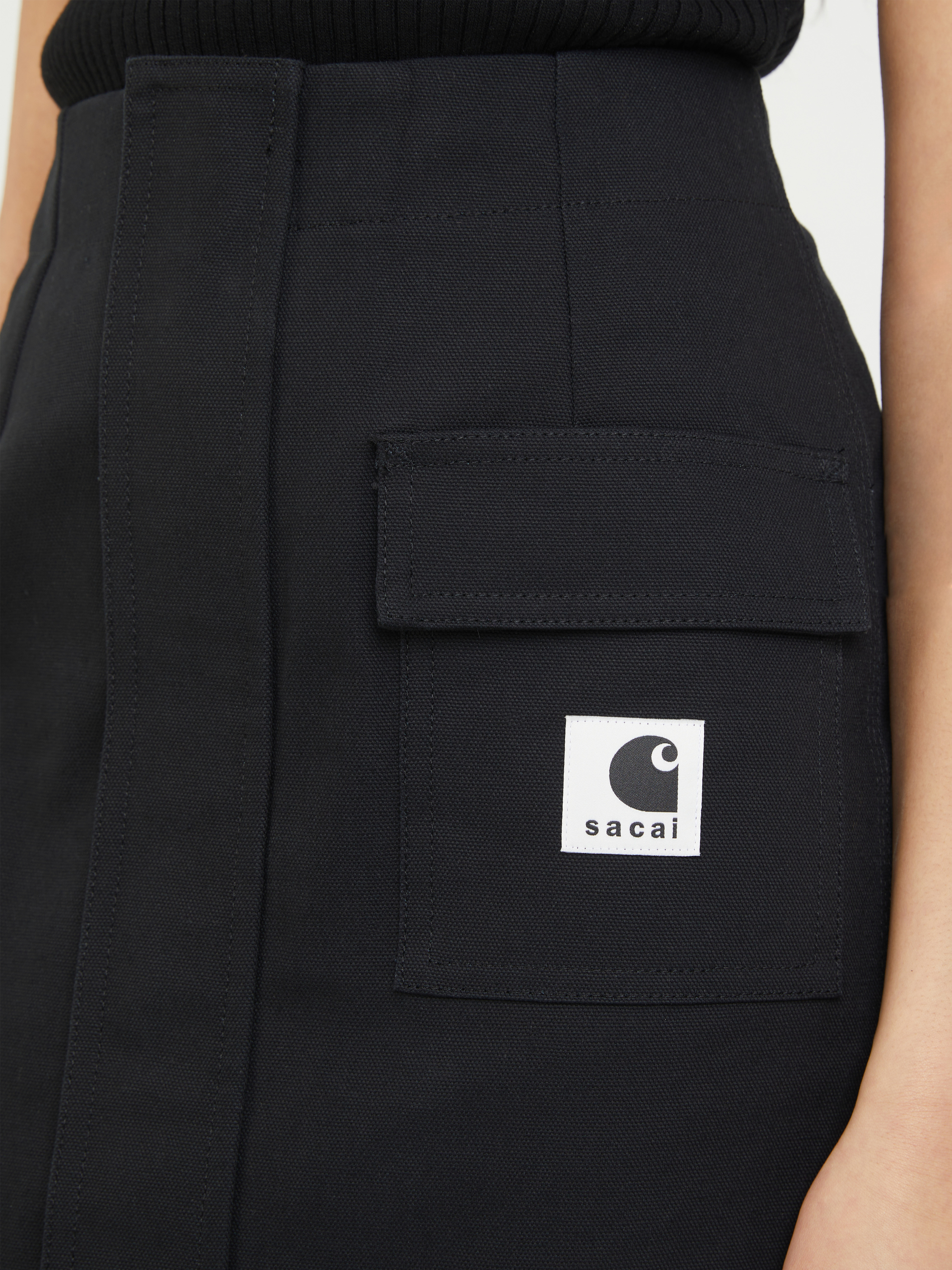 Dieser Rock in Schwarz von Sacai aus der Kollaboration mit Carhartt wurde aus fester Baumwolle gefertigt und besticht durch ein funktionales Design. Die aufgesetzten Taschen mit Logo-Patch, der goldfarbene Reißverschluss und die Midilänge zeichnen dieses Modell aus. Die rückseitigen Falten und die Klettverschlusstaschen machen dieses besondere Design zu einem absoluten Hingucker.