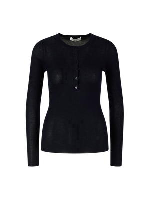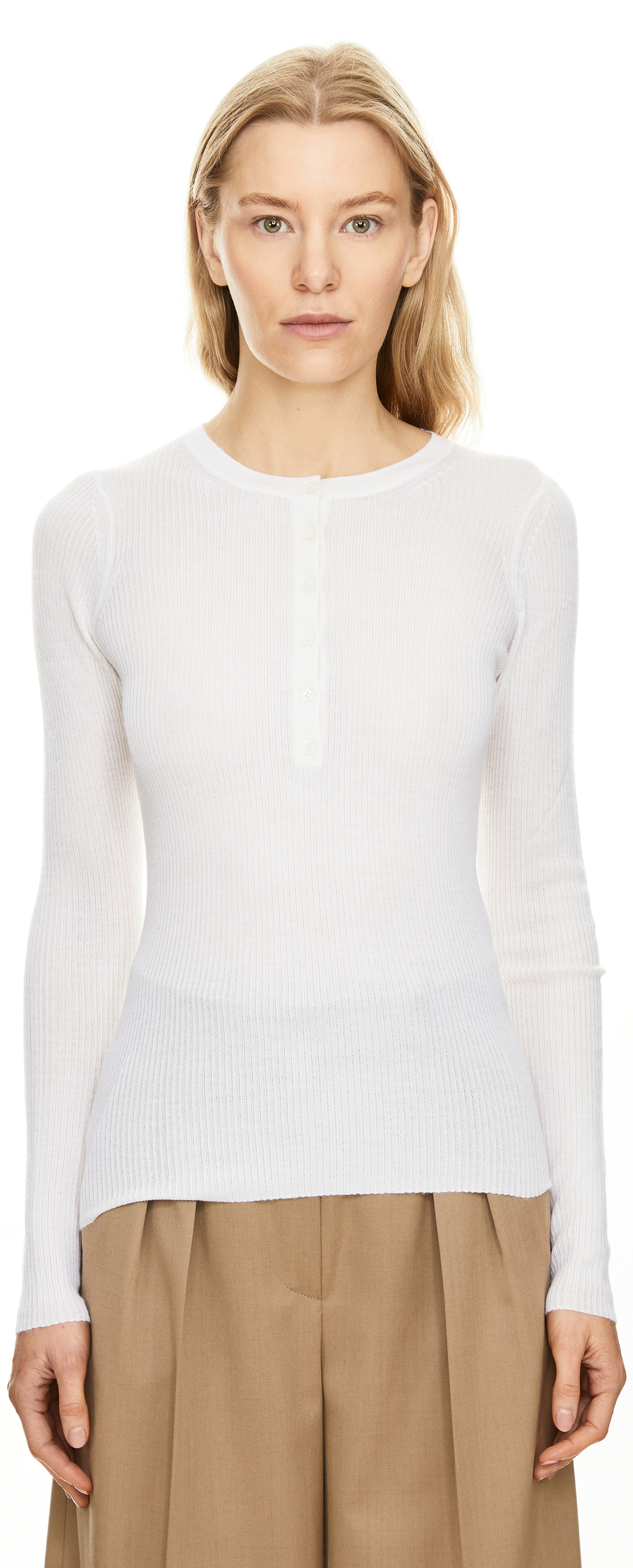 Das Shirt 'Julian Henley' in Weiß von Gabriela Hearst wurde aus einer weichen Cashmere-Seidenmischung gefertigt und besticht durch die feine Rippstruktur. Die figurbetonte Passform und der Rundhalsausschnitt mit halber Knopfleiste unterstreichen die puristische Linie des Modells.