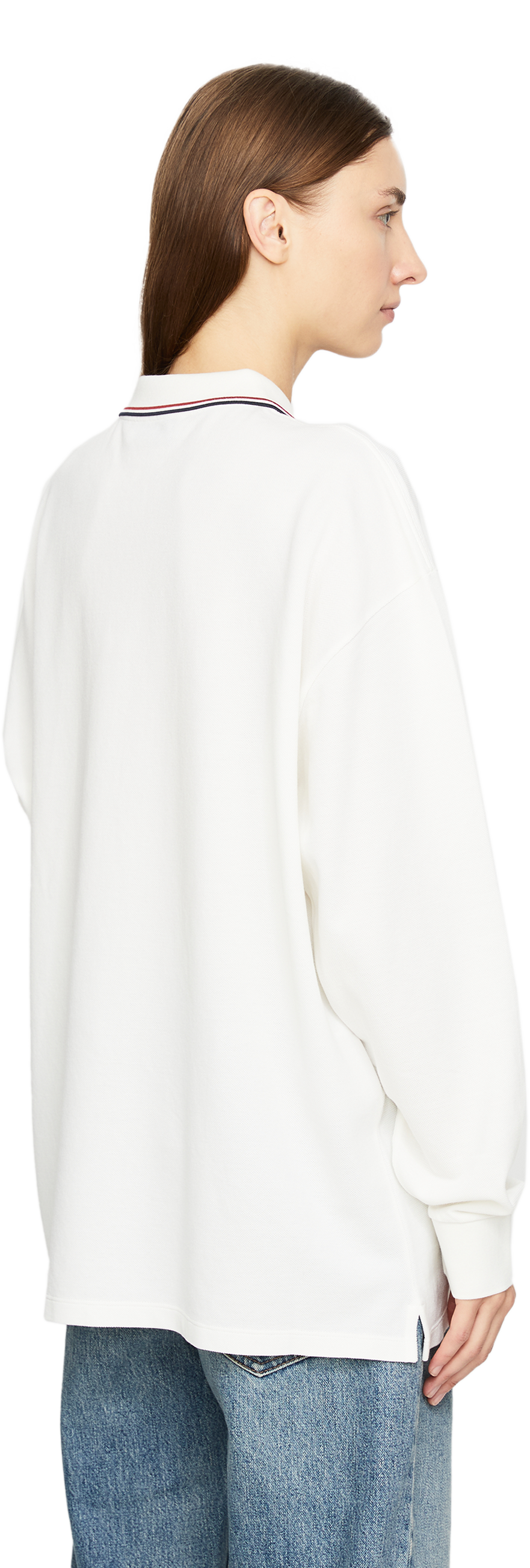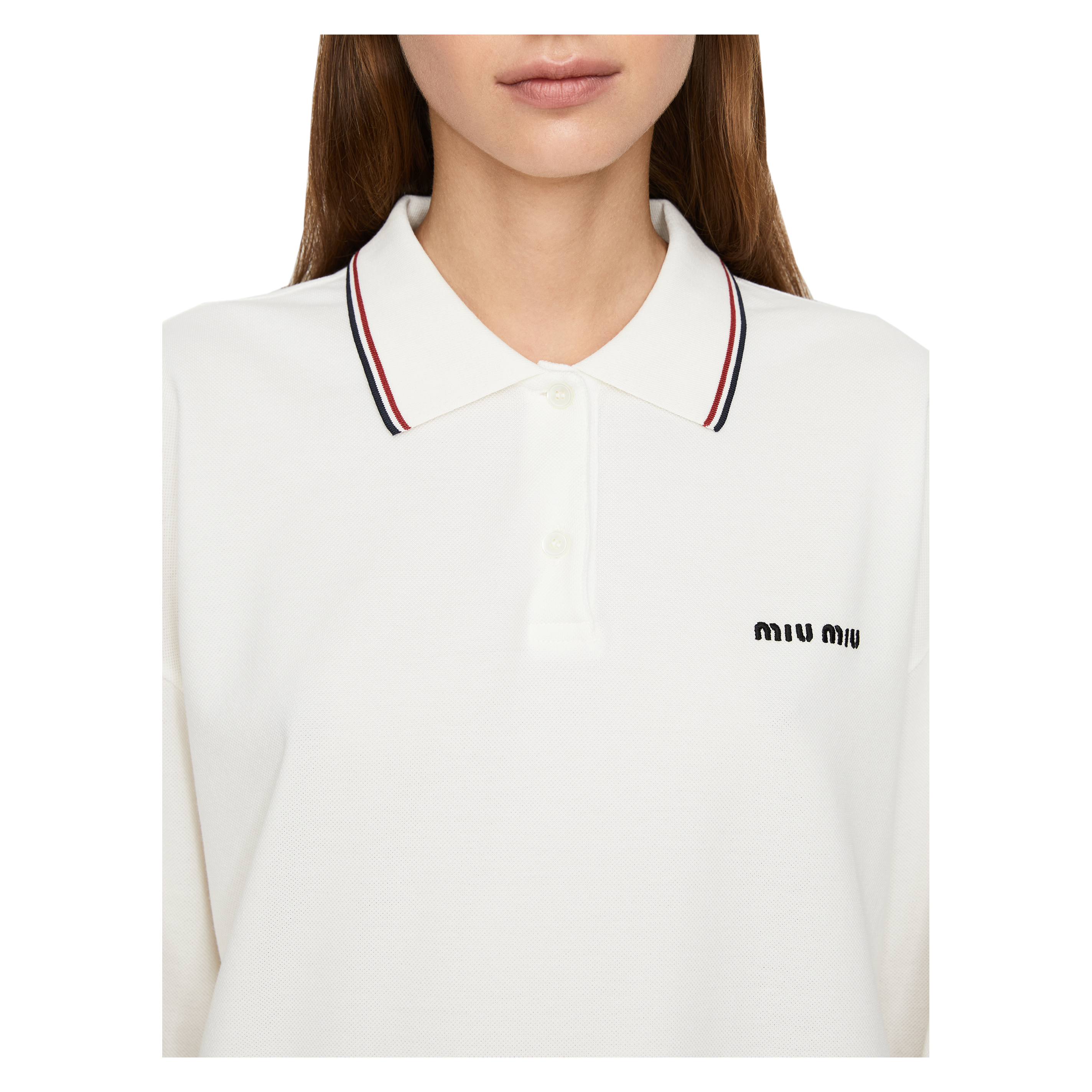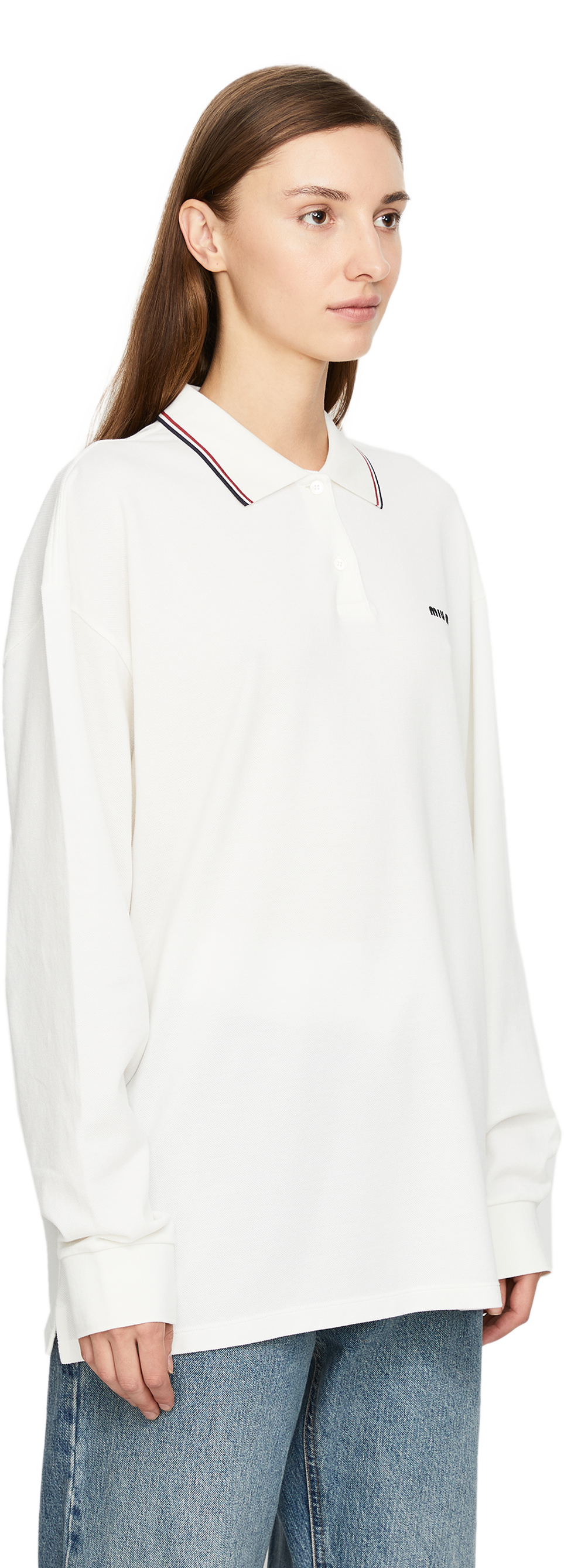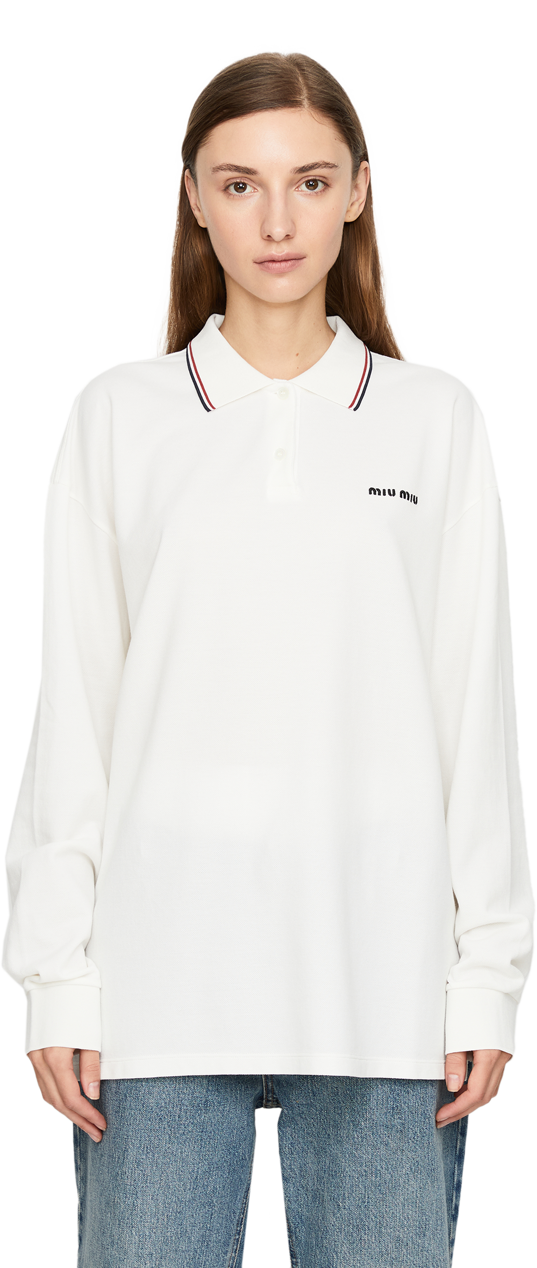 Dieses Poloshirt in Weiß von miu miu wurde aus hochwertiger Baumwolle gefertigt. Das Modell besticht durch die gerade Silhouette und die Knopfleiste. Der klassische Polokragen und die langen Ärmel vollenden dieses stilvolle Modell.