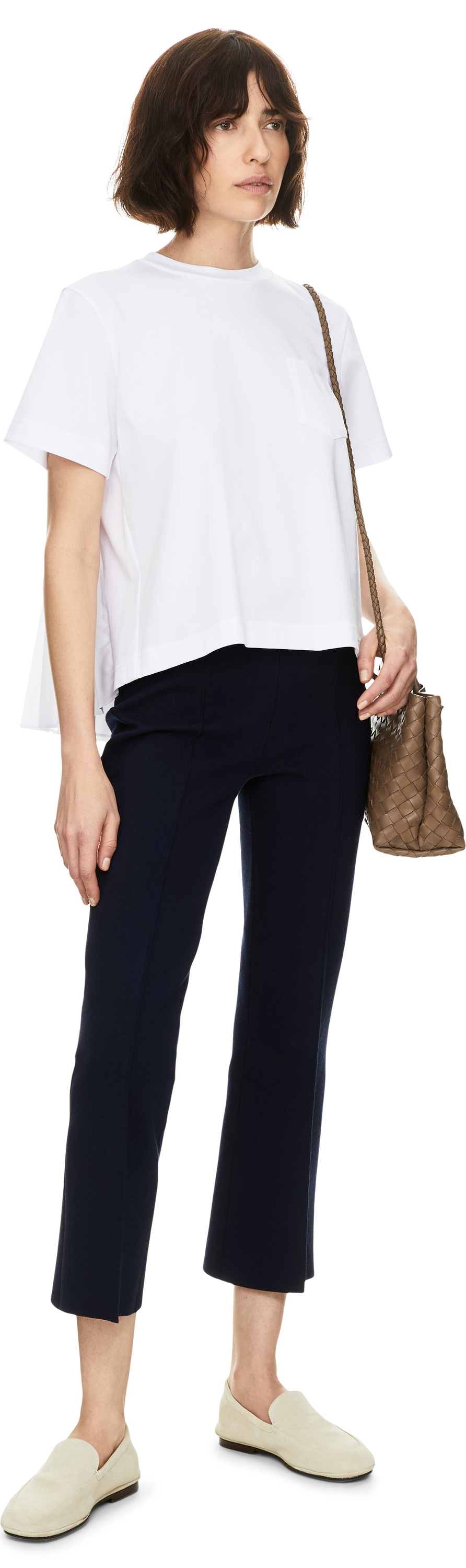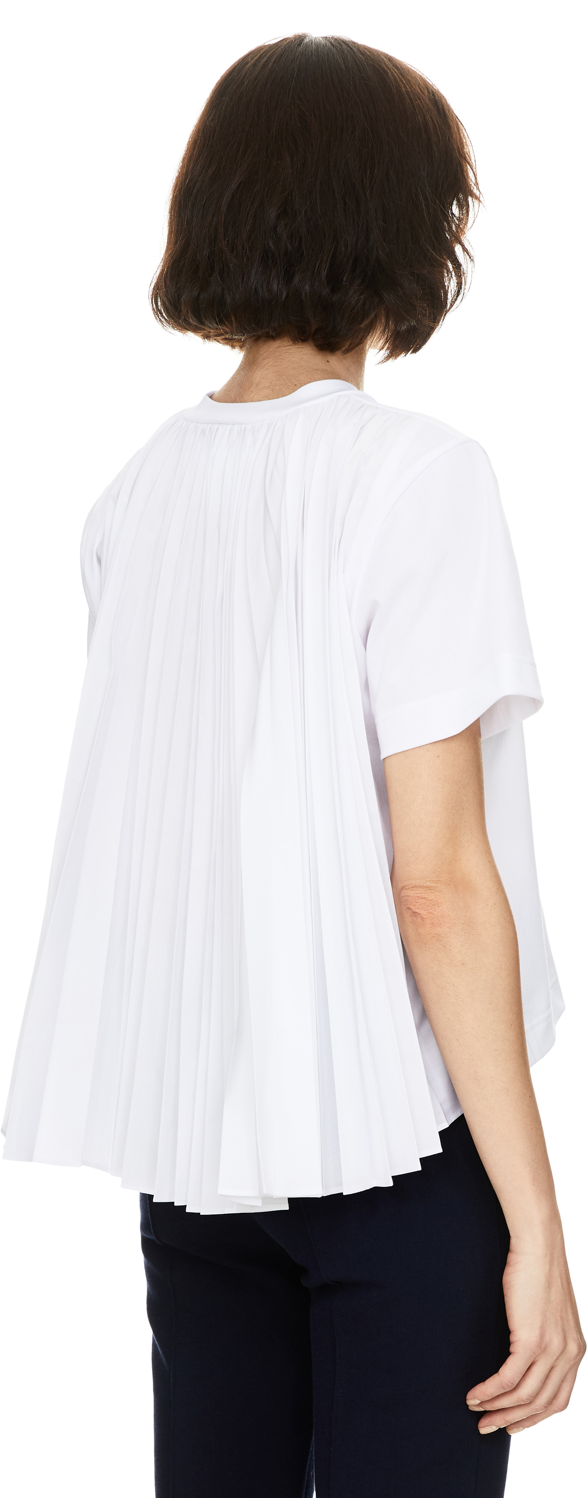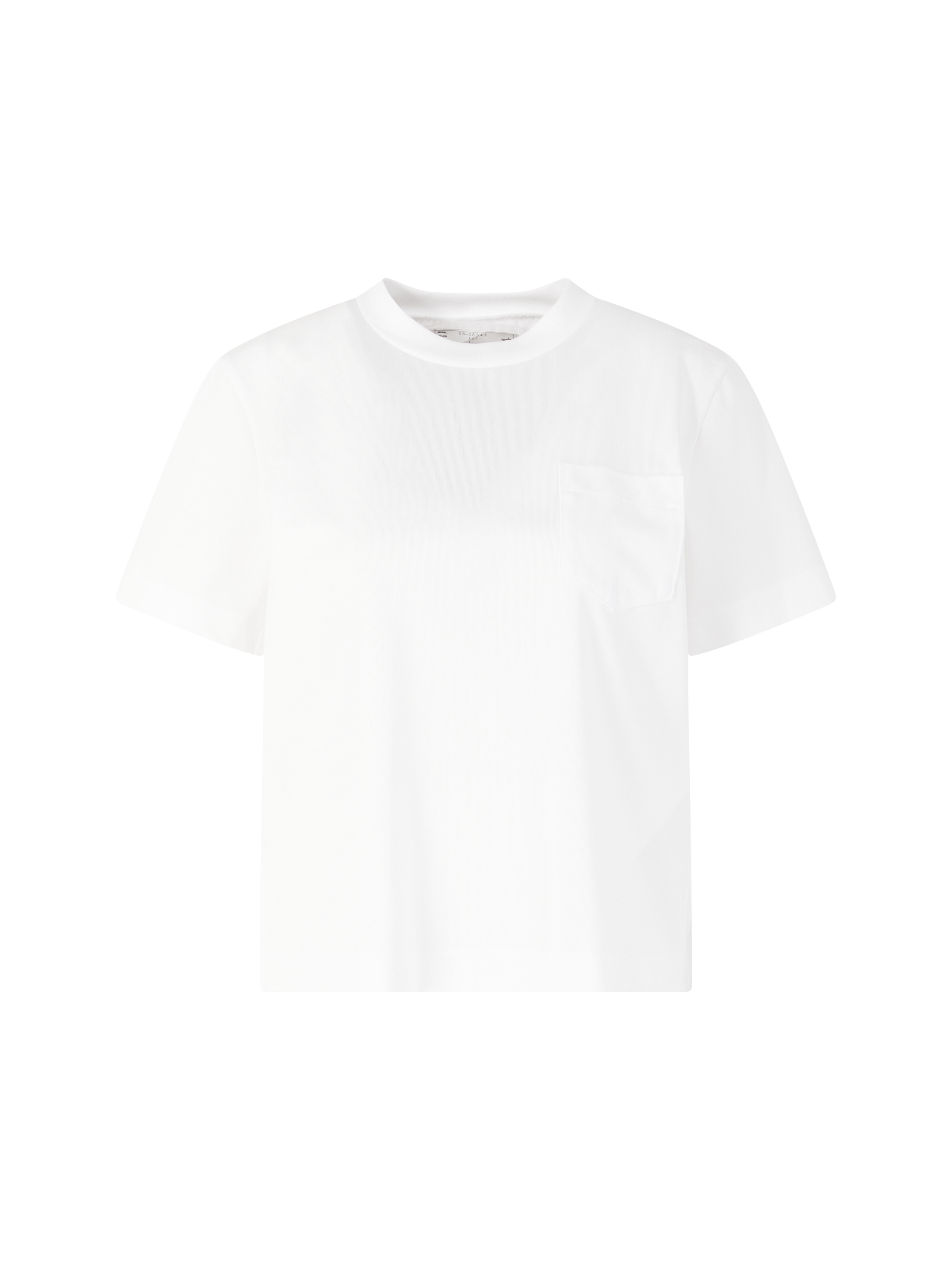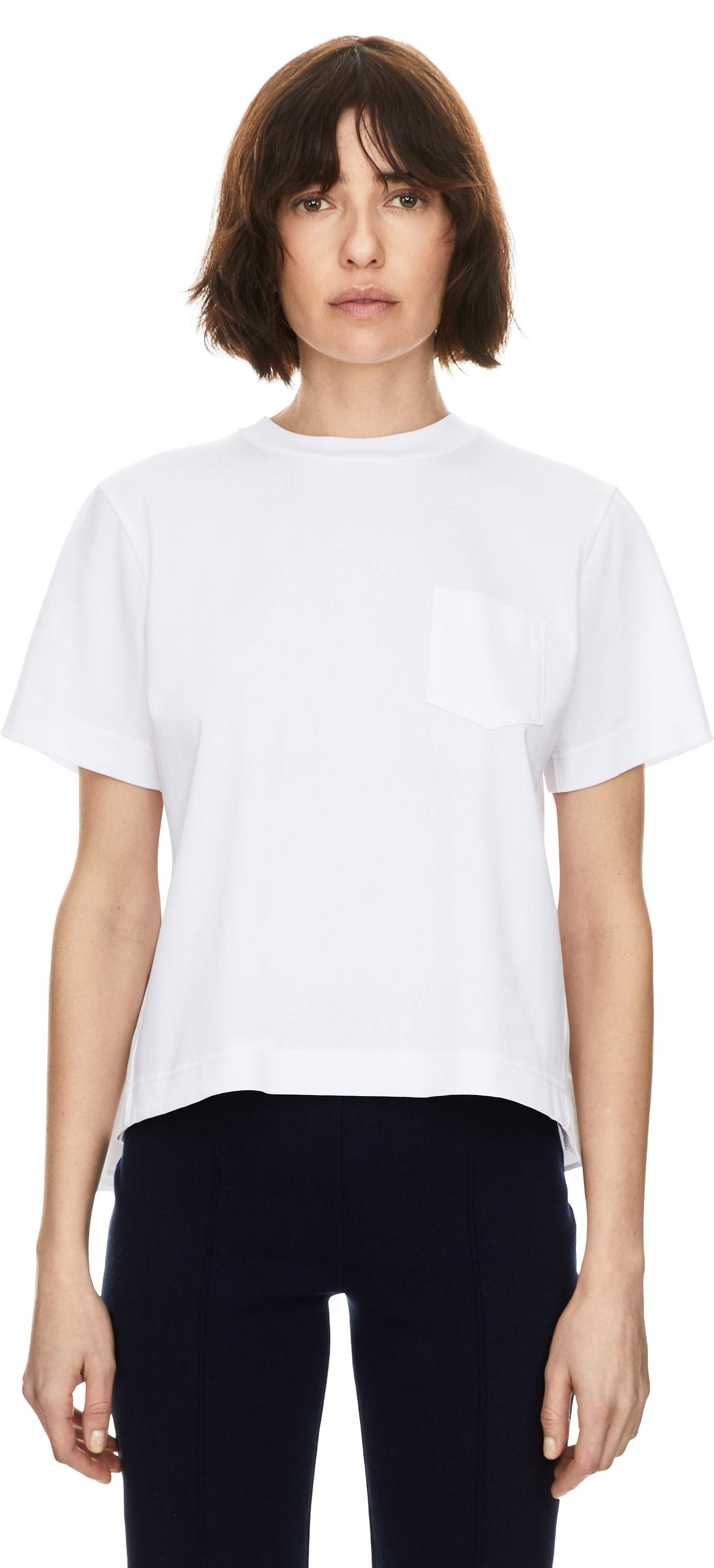 Dieses T-Shirt in Weiß von Sacai wurde aus hochwertiger Baumwollpopeline gefertigt und besticht durch die verlängerte Rückseite mit Falteneinsatz. Die aufgesetzte Brusttasche sowie der am Saum hervorstehende Netzeinsatz sorgen für stilvolle Akzente und runden das Design harmonisch ab.