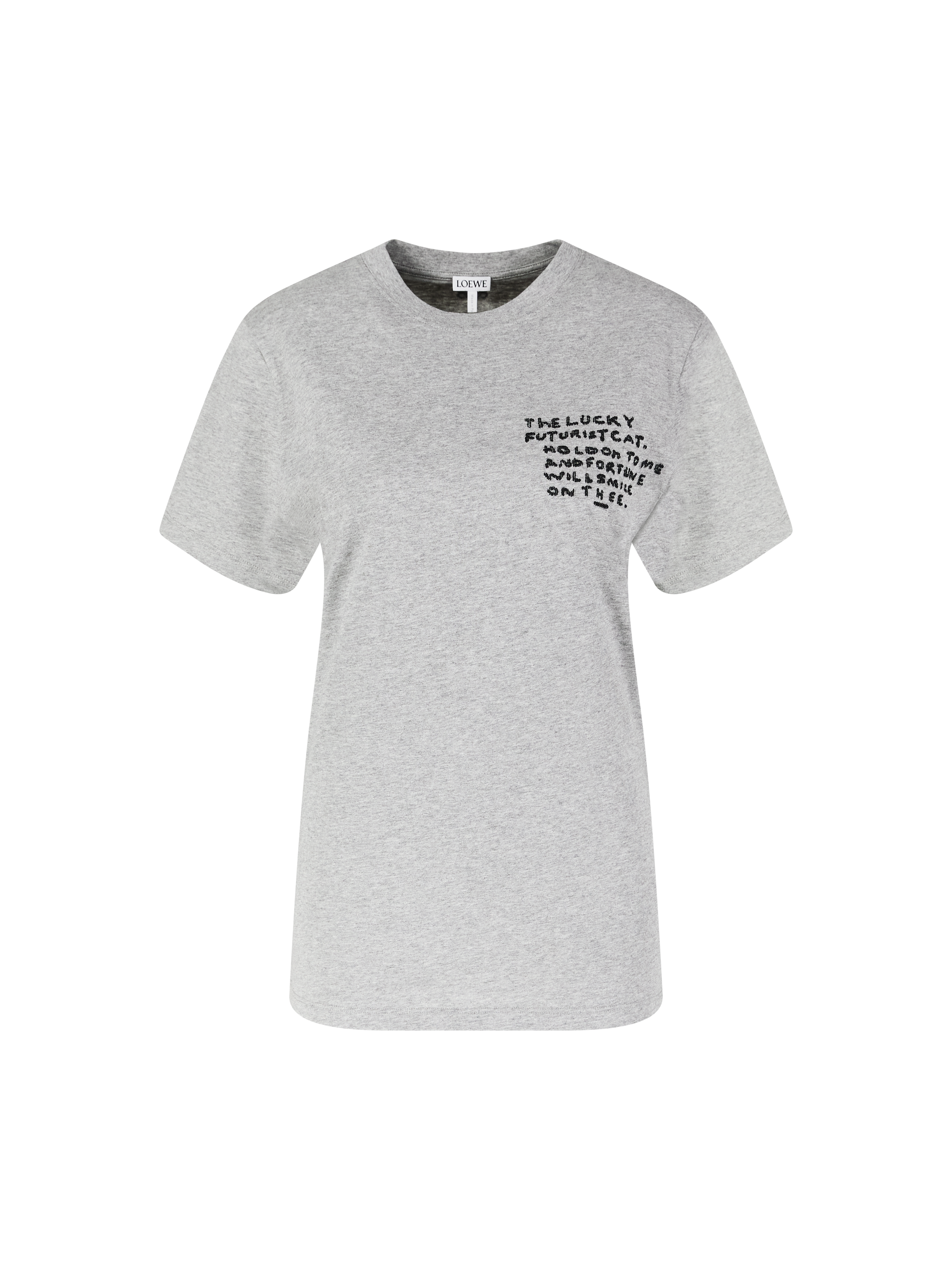 Dieses T-Shirt in Grau von LOEWE wurde aus leichter Baumwolle gefertigt und besticht durch den gestickten Schriftzug auf der Brust sowie eine futuristische Katzen-Kreuzstich-Stickerei auf dem Rücken. Die normale Passform, der Rundhalsausschnitt und die kurzen Ärmel verleihen dem Modell einen modernen Touch.