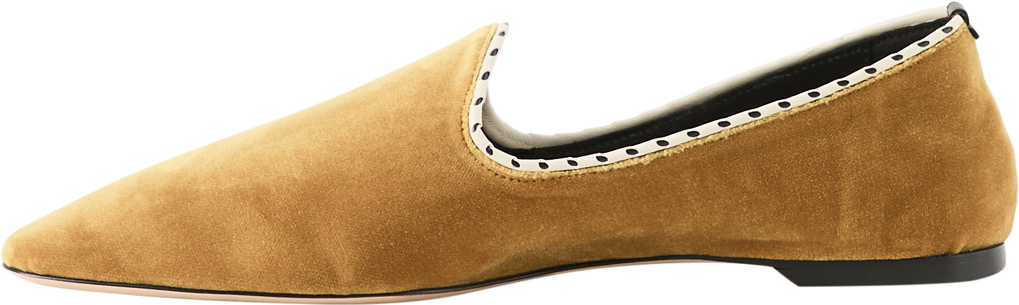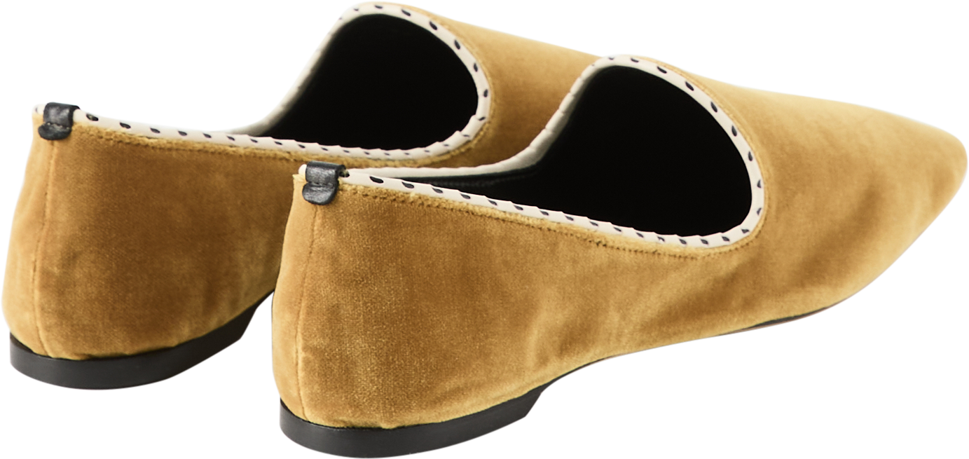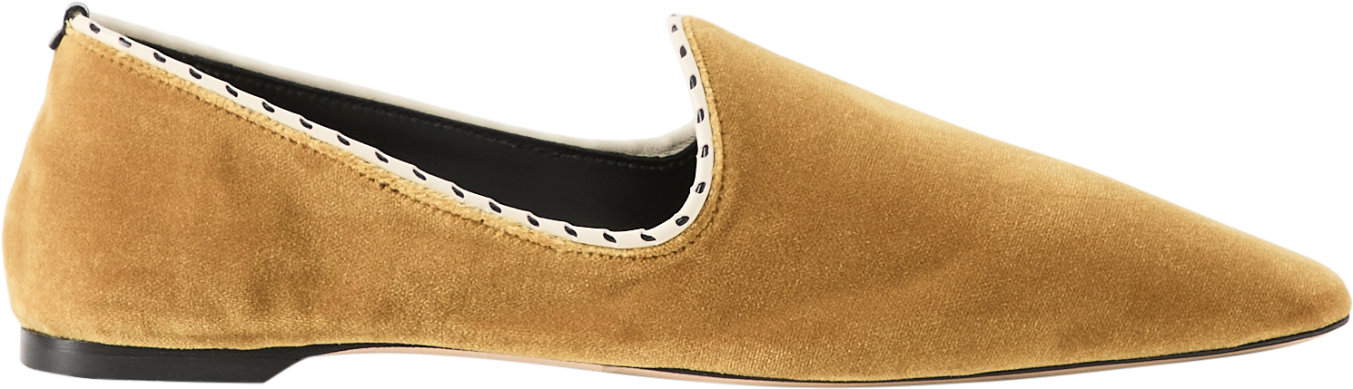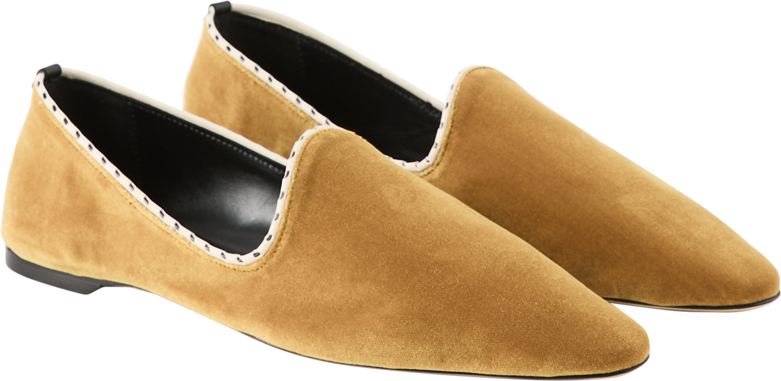 Die Flats 'Venetian' in Gelb von TOTEME wurden aus plüschigem Samt gefertigt und bestechen durch die kontrastierende weiße Paspelierung. Die schmale Spitze und das gebürstete Finish verleihen dem Schuh einen unverwechselbaren Look.