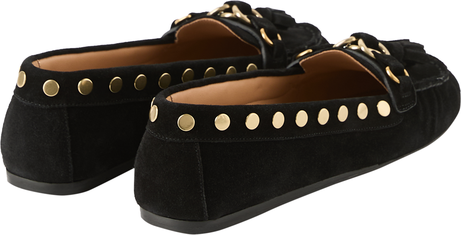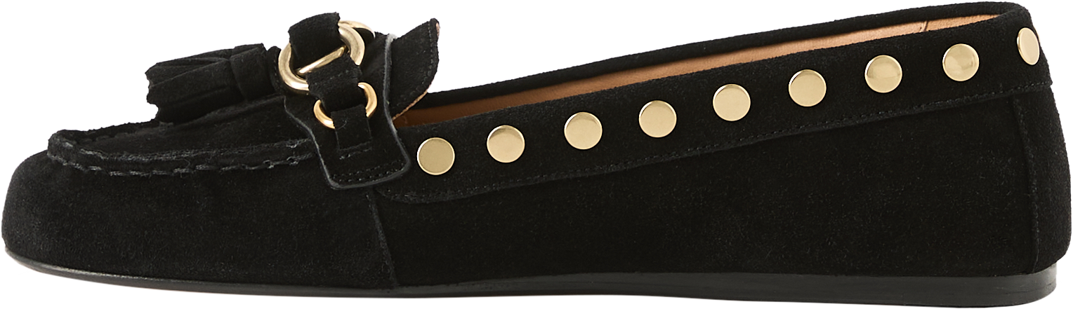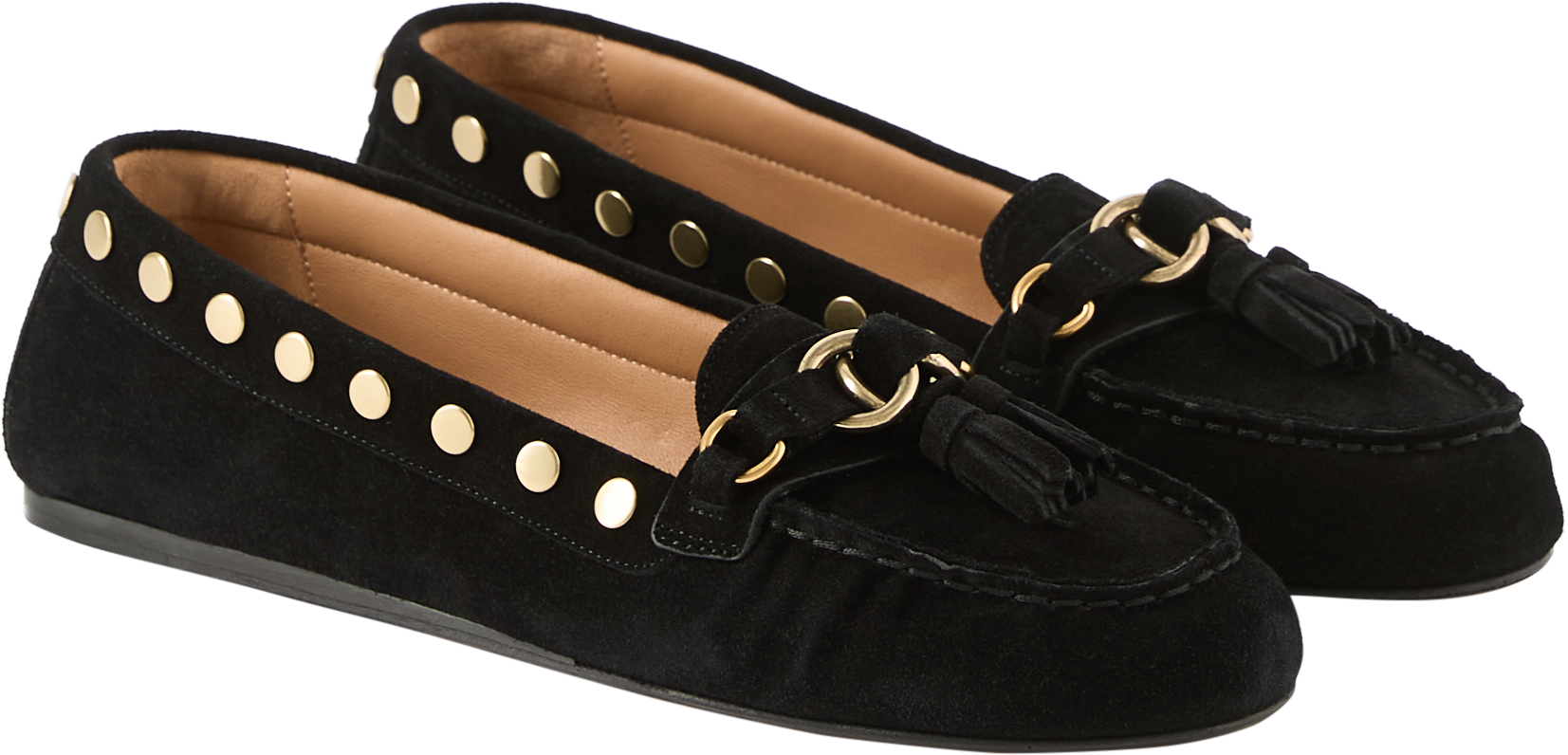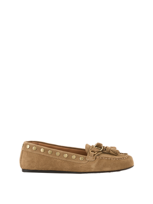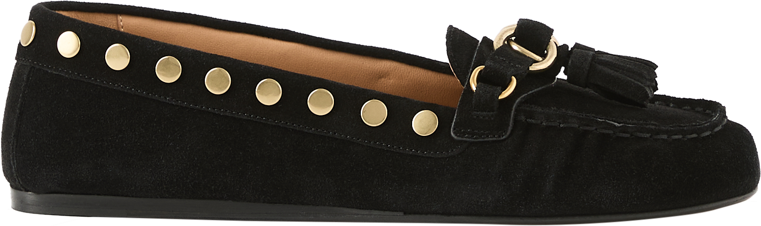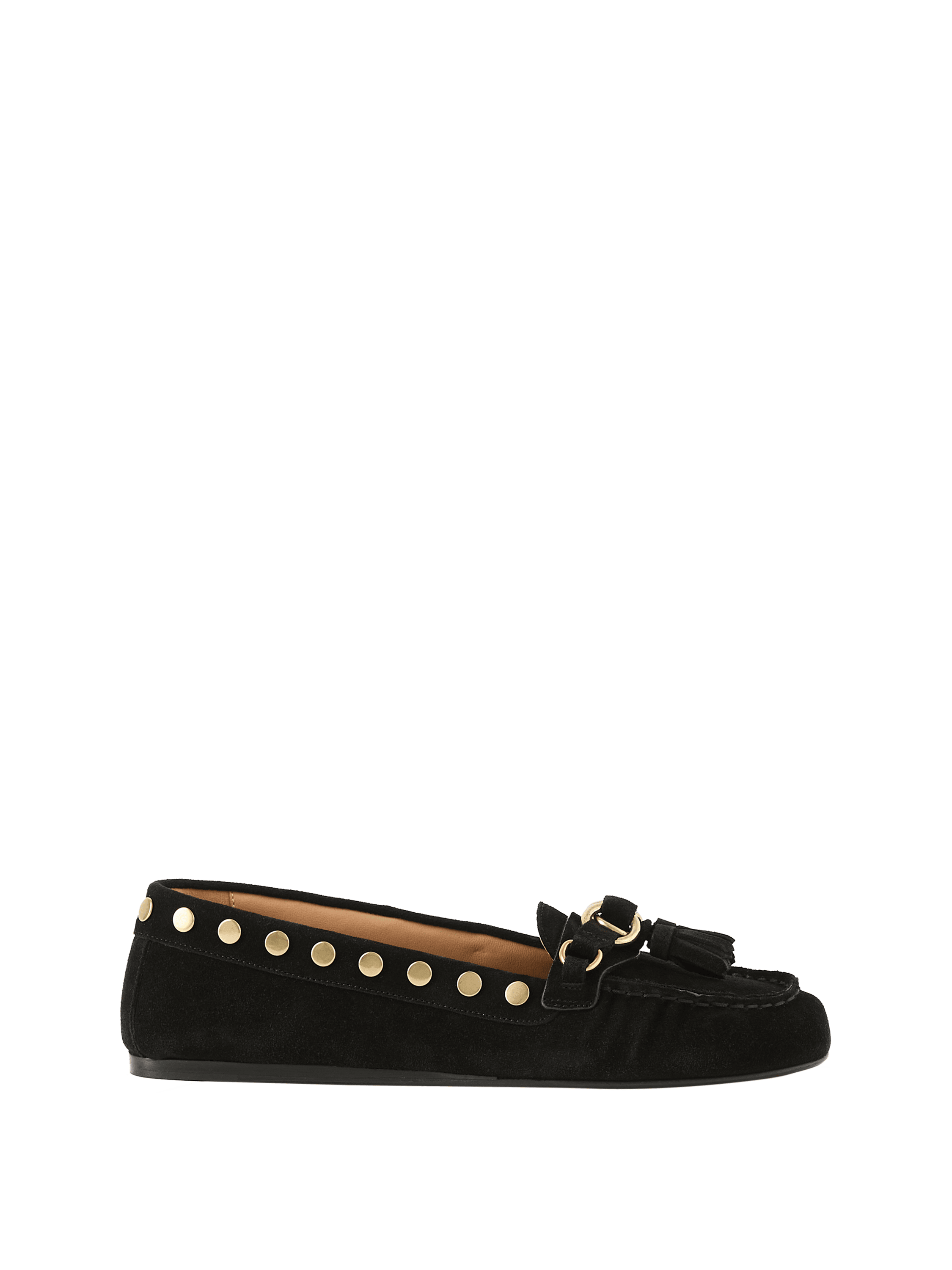 Der Mokassin 'Faxel' in Schwarz von Isabel Marant wurde aus hochwertigem Kalbsveloursleder gefertigt und besticht durch das Riemchen mit zwei dekorativen Quasten auf der Oberseite. Die runde Zehenkappe sorgt für angenehmen Tragekomfort, während die seitlichen Nietenreihen dem Design einen verspielten Akzent verleihen. Die Lauf- und Innensohle aus Leder unterstreichen die weiche Haptik und die hochwertige Verarbeitung des Modells.