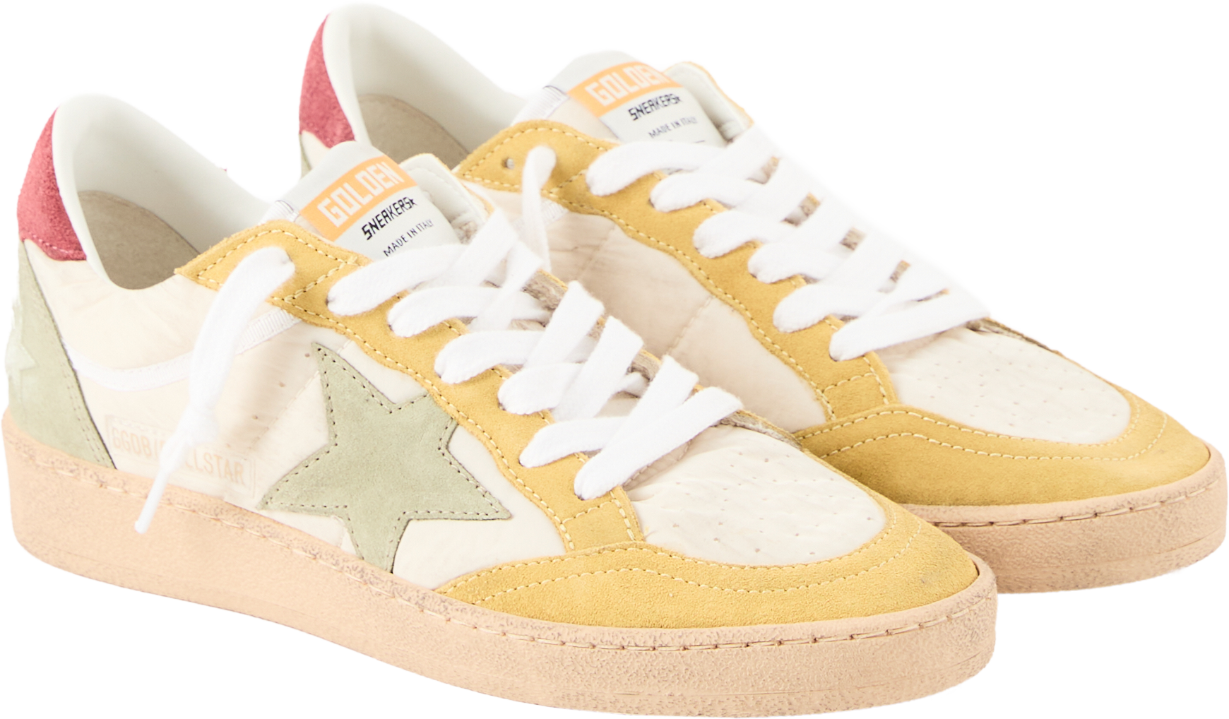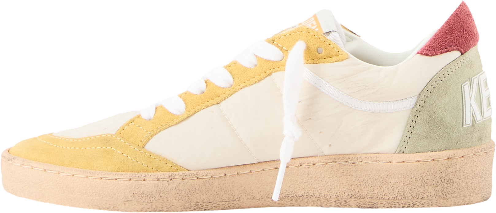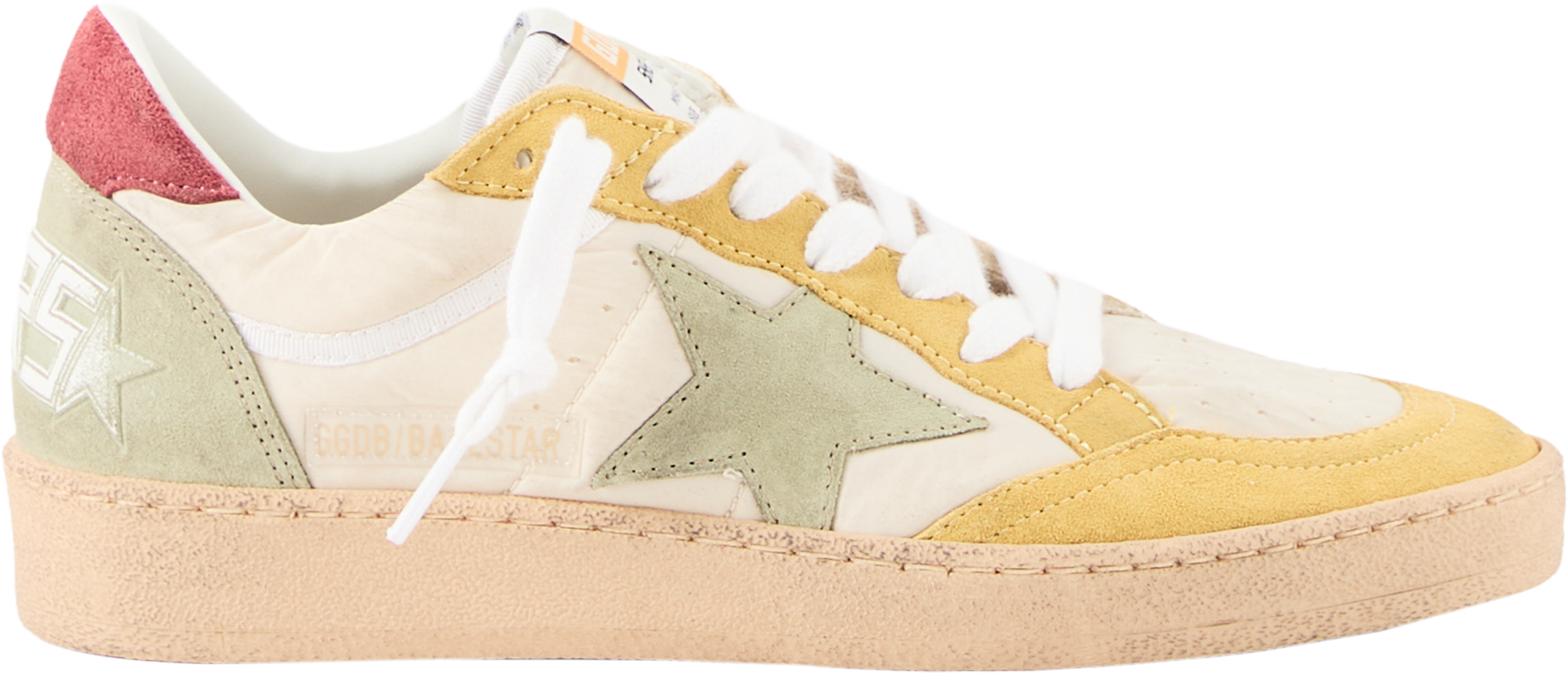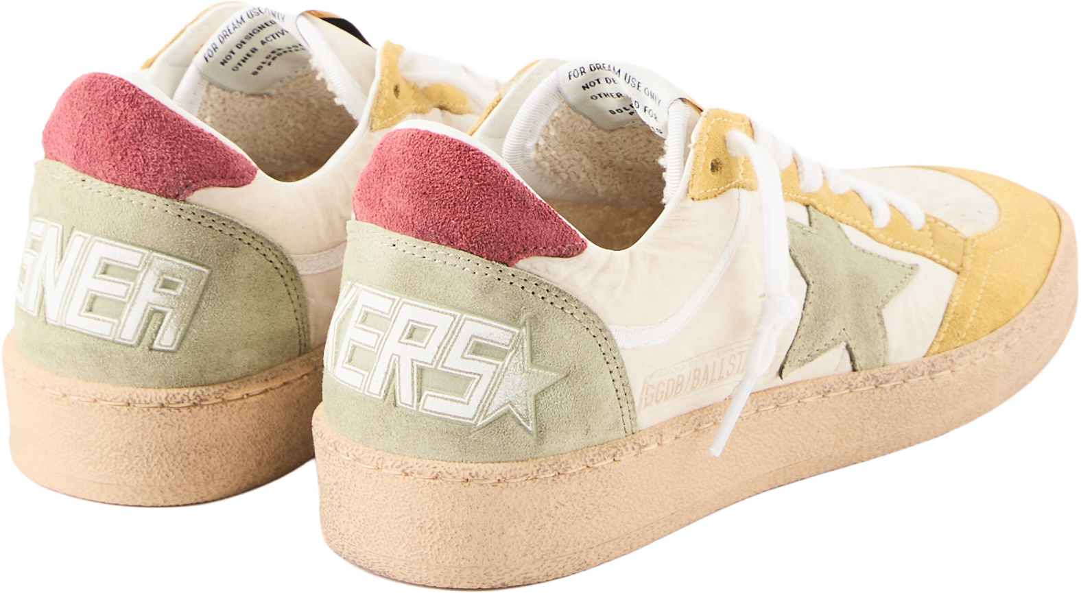 Der Sneaker 'Ballstar' in Multi von GOLDEN GOOSE wurde aus Nylon und Kalbsleder gefertigt und besticht durch den grünen Lederstern. Der gepolsterte Schaftrand, das weiße Logo an der Fersenzone sowie die gelb- und rotfarbenen Wildledereinsätze runden das Design harmonisch ab.