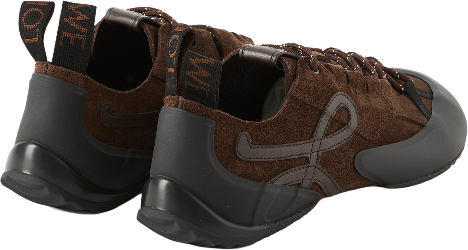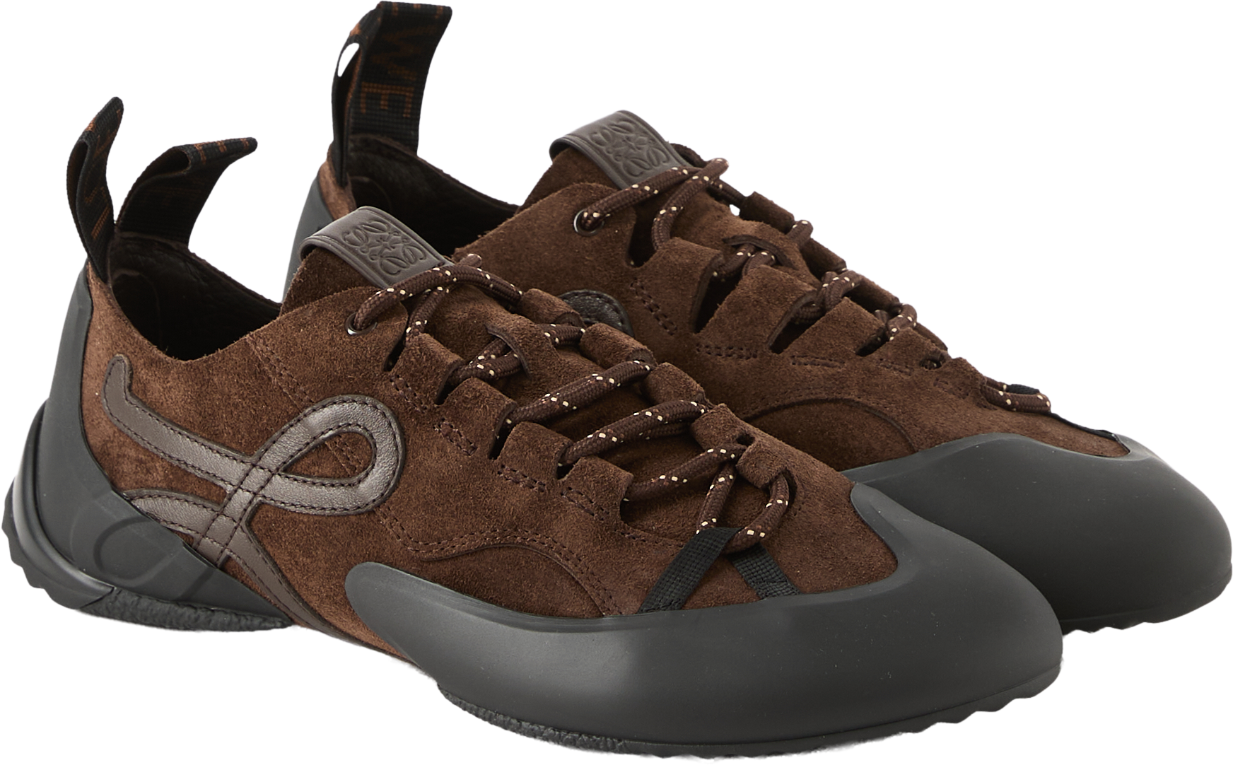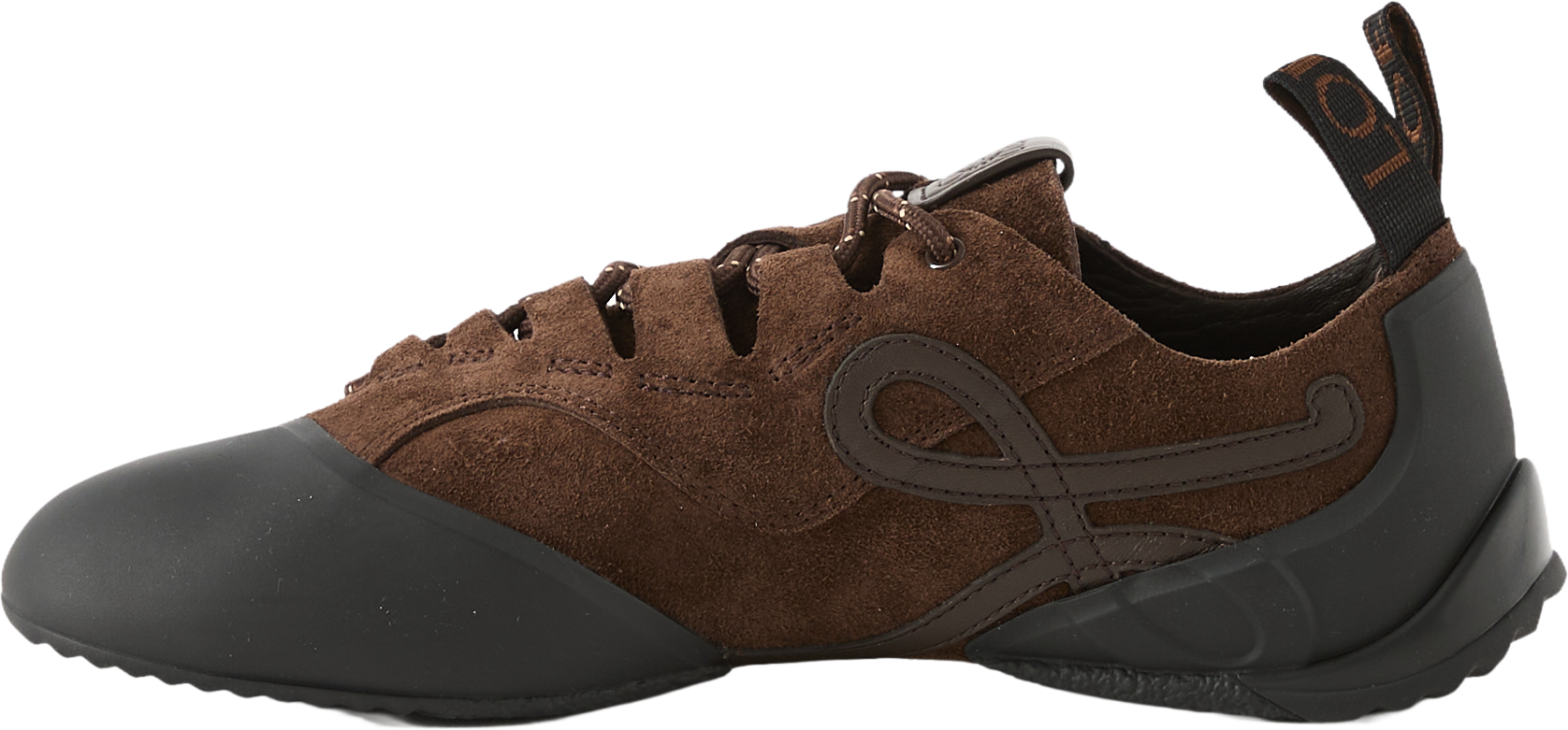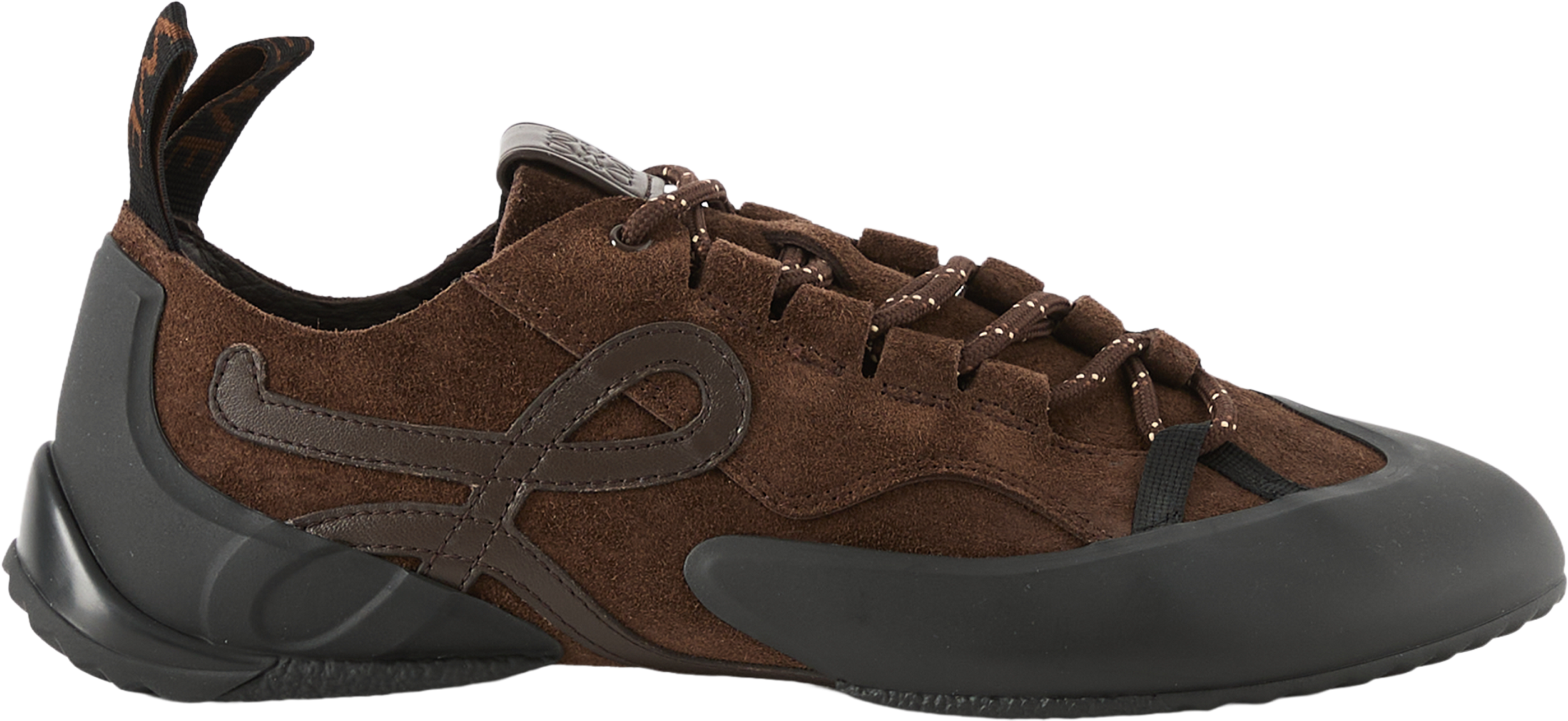 Die Sneaker 'Grip' in Braun von LOEWE wurden aus Kalbsveloursleder gefertigt und bestechen durch die markante, von Kletterschuhen inspirierte Silhouette. Die asymmetrische Zehenpartie, das Schnürsystem, das L-Monogramm an der Seite sowie die Anagram-Prägung auf der Zunge zeichnen dieses Modell aus.