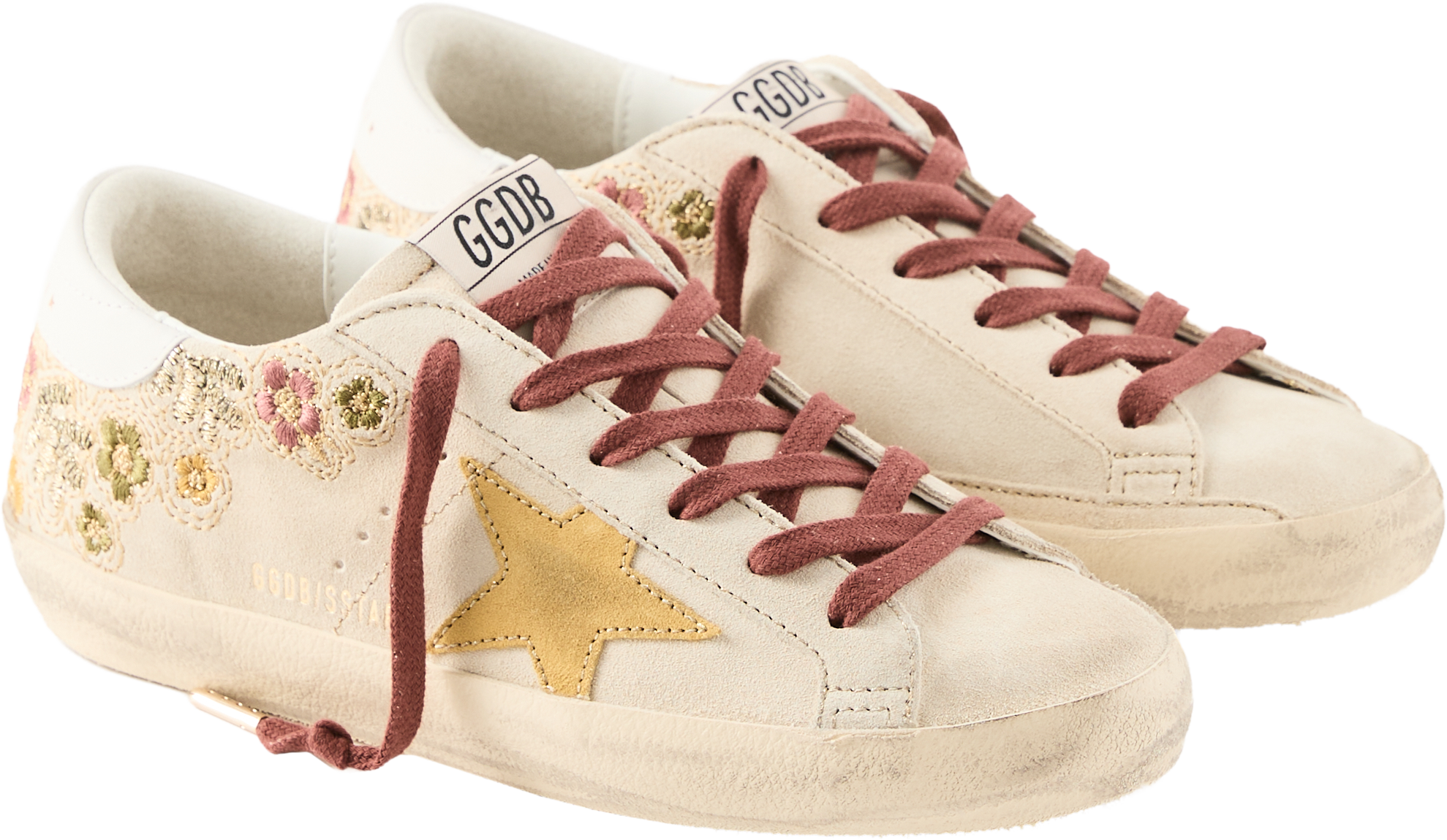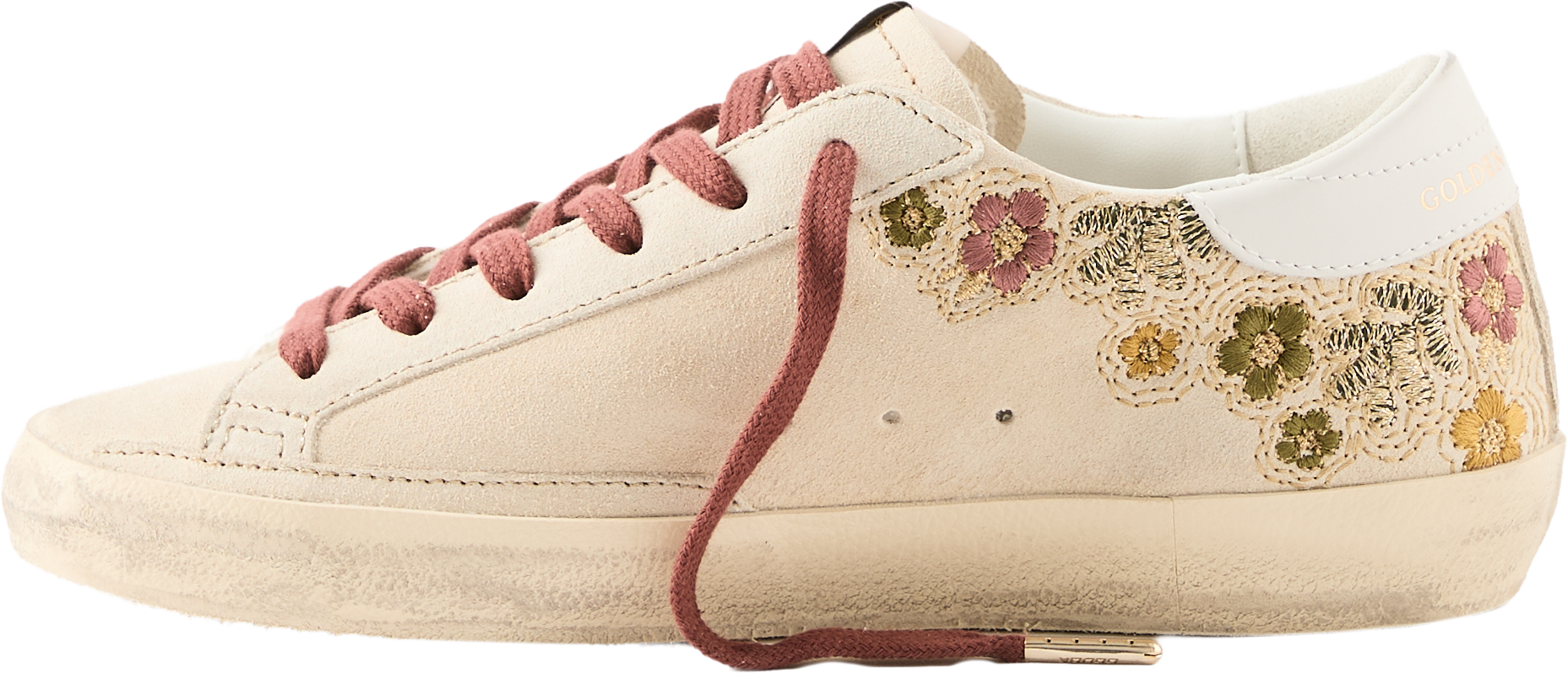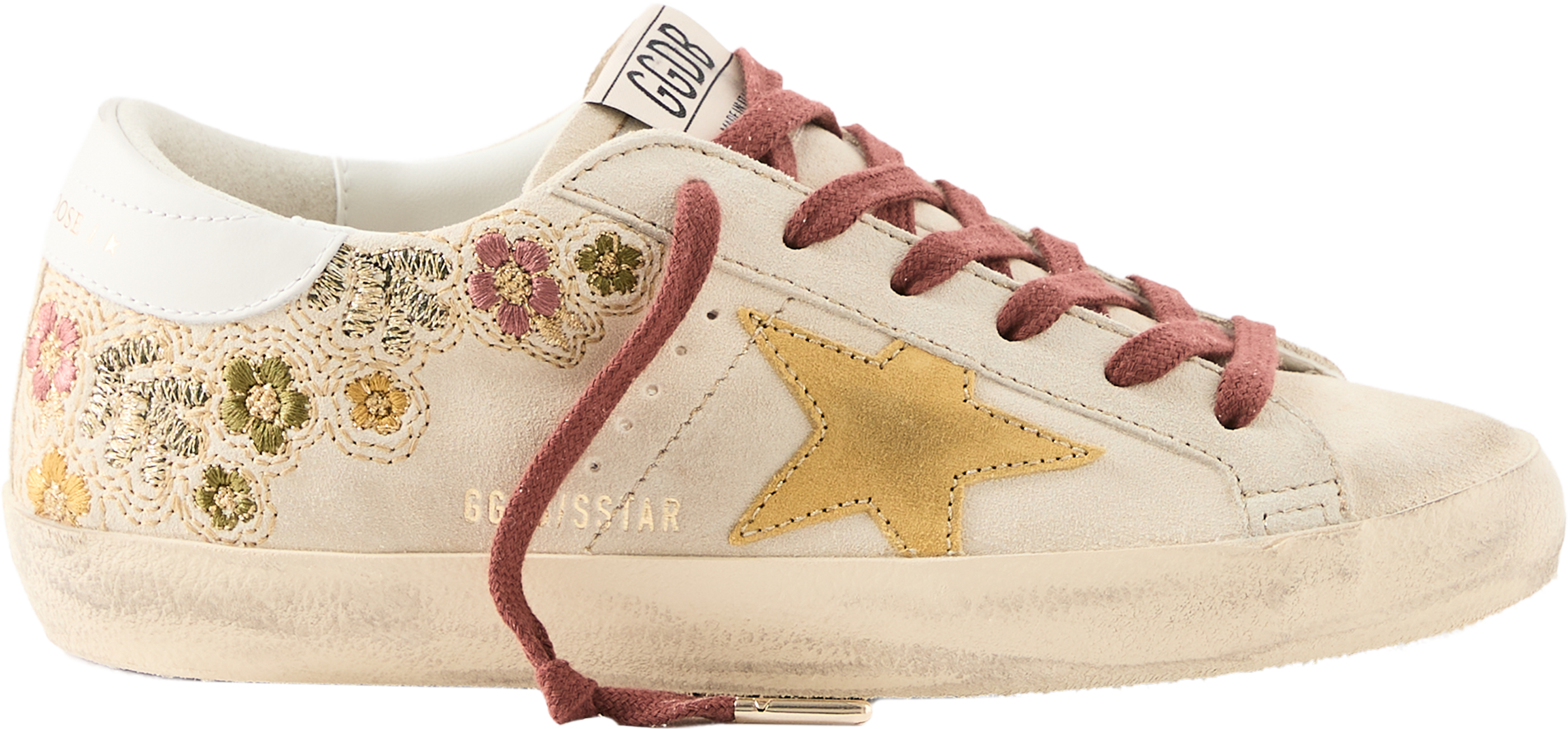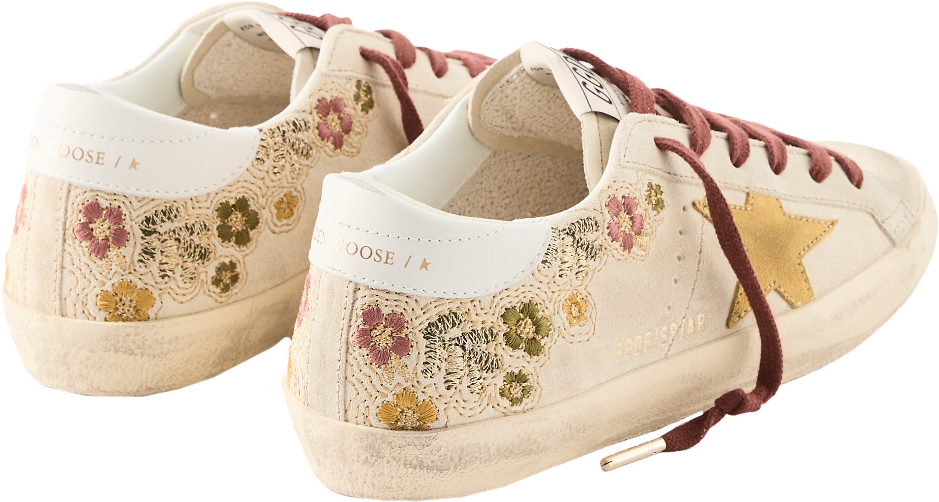 Der Sneaker 'Super-Star' in Beige von Golden Goose wurde aus Kalbsleder gefertigt und besticht durch die florale Stickerei. Der Stern aus beschichtetem, gelbfarbenem Rauleder, die bordeauxfarbenen Schnürsenkel sowie das goldfarbene Logo an der Seite runden das Design harmonisch ab.