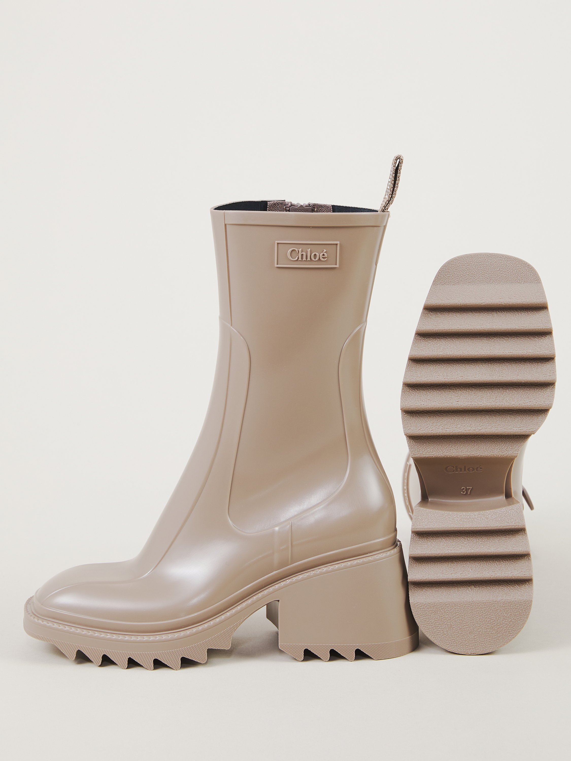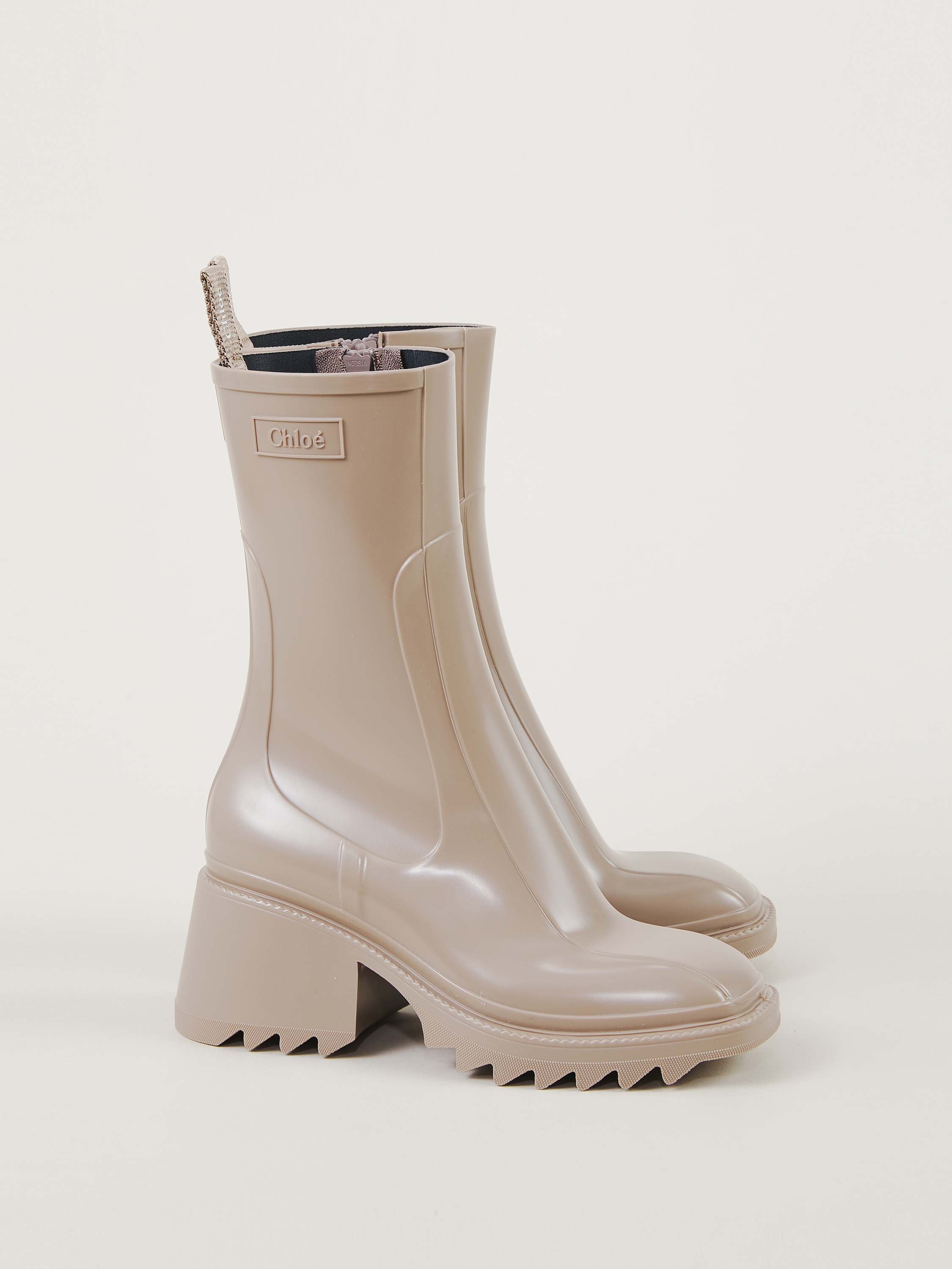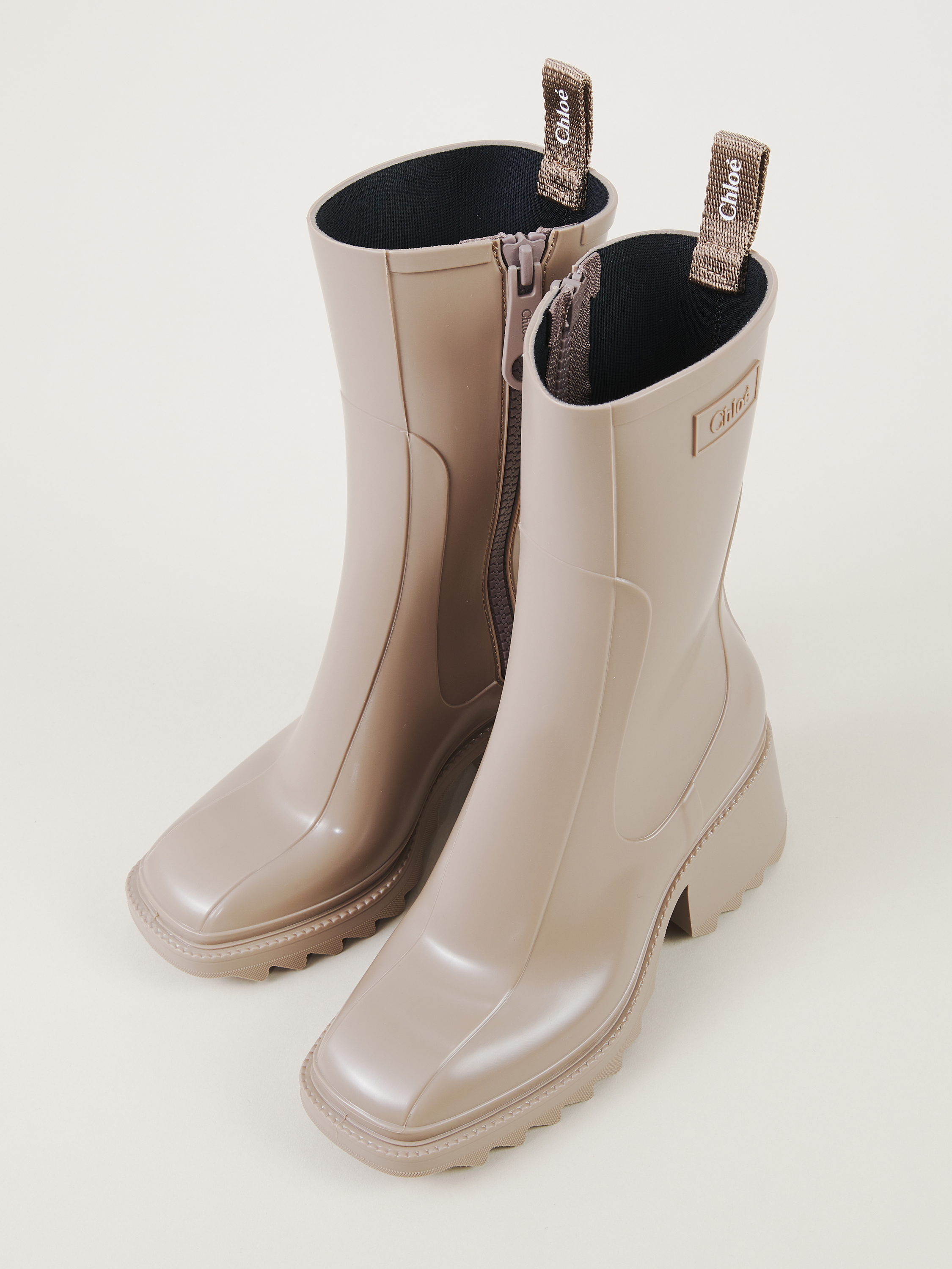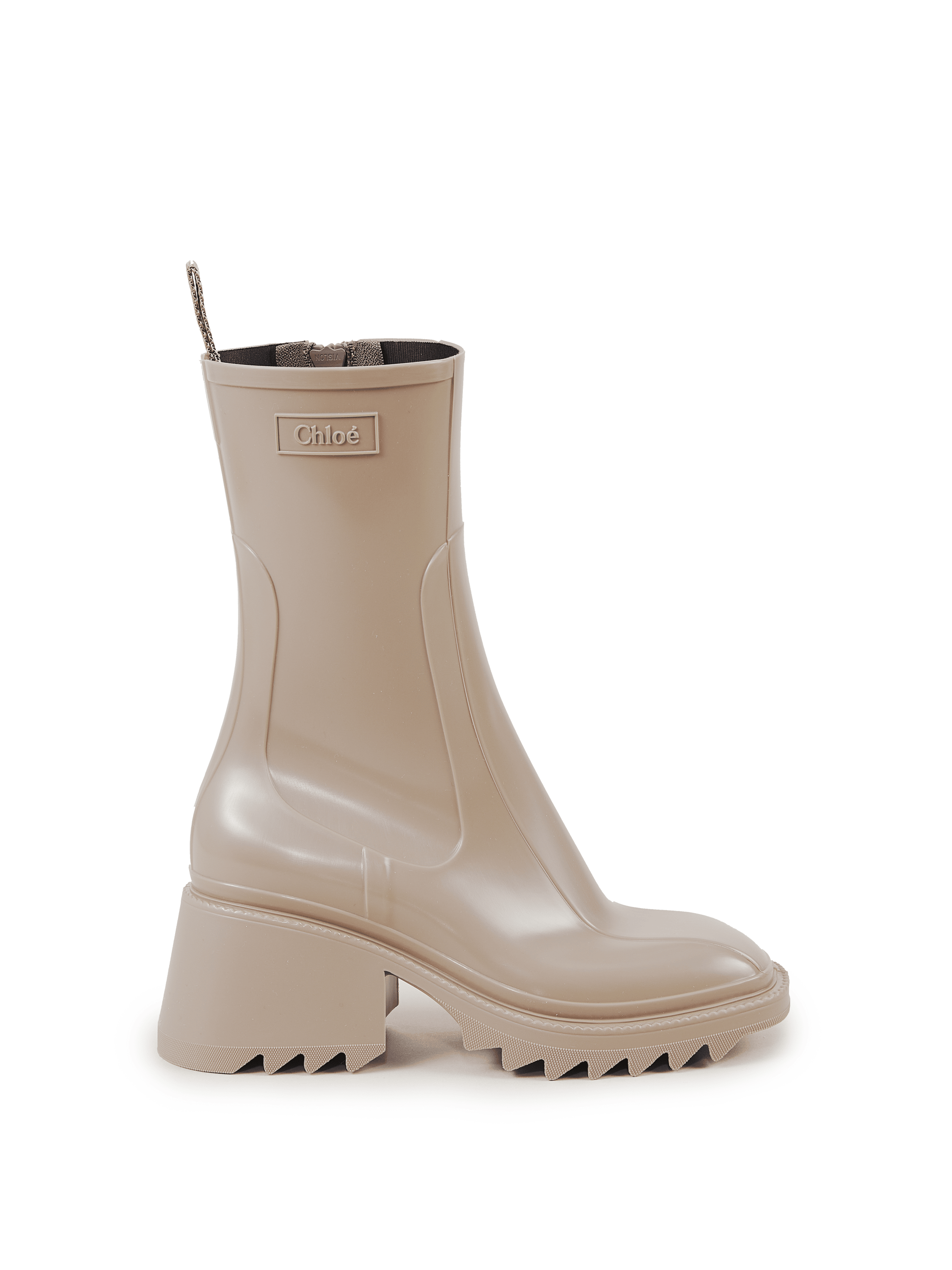 Der Regenstiefel 'Betty' von Chloé in Dark Greige wurde aus PVC gefertigt. Die eckige Zehenkappe, der Reißverschluss auf der Innenseite und der bequeme Absatz zeichnen das Design aus.