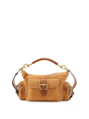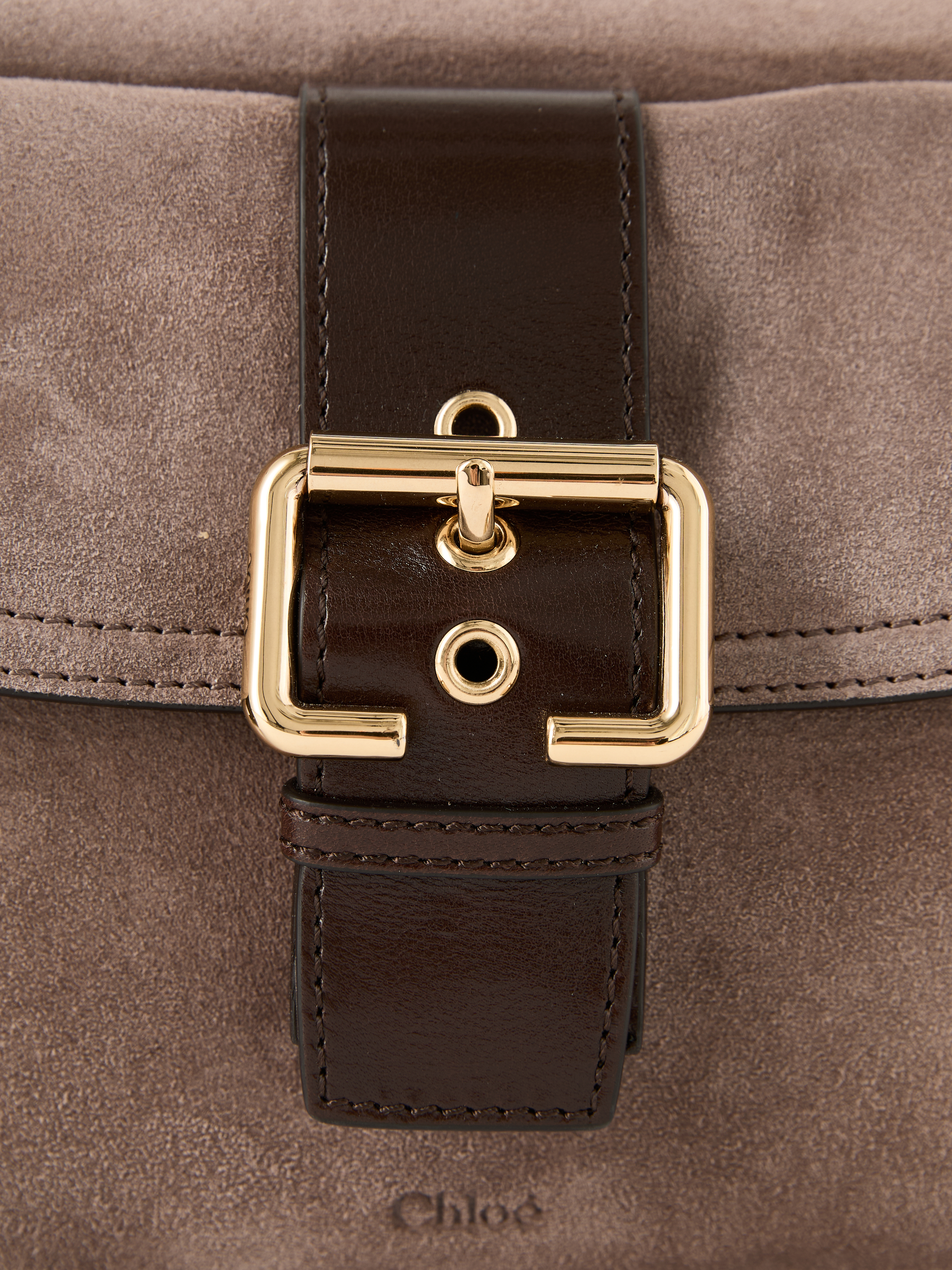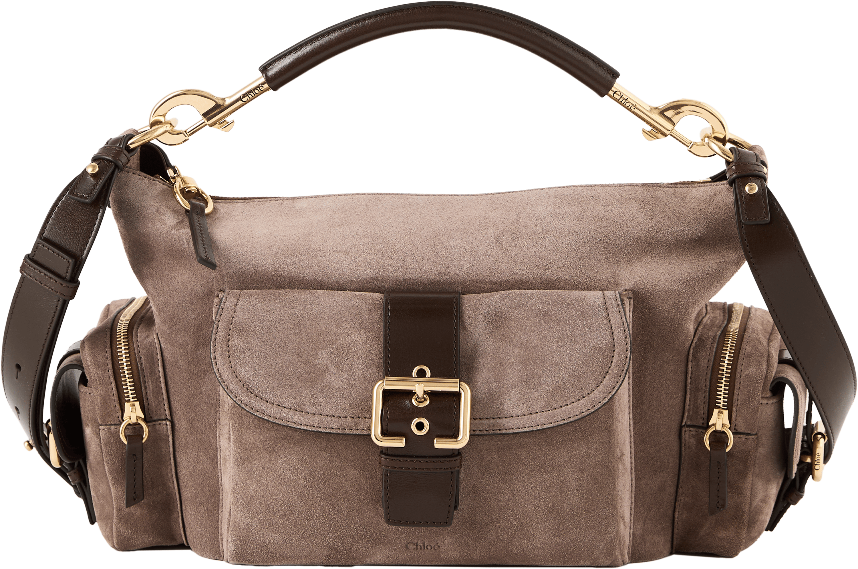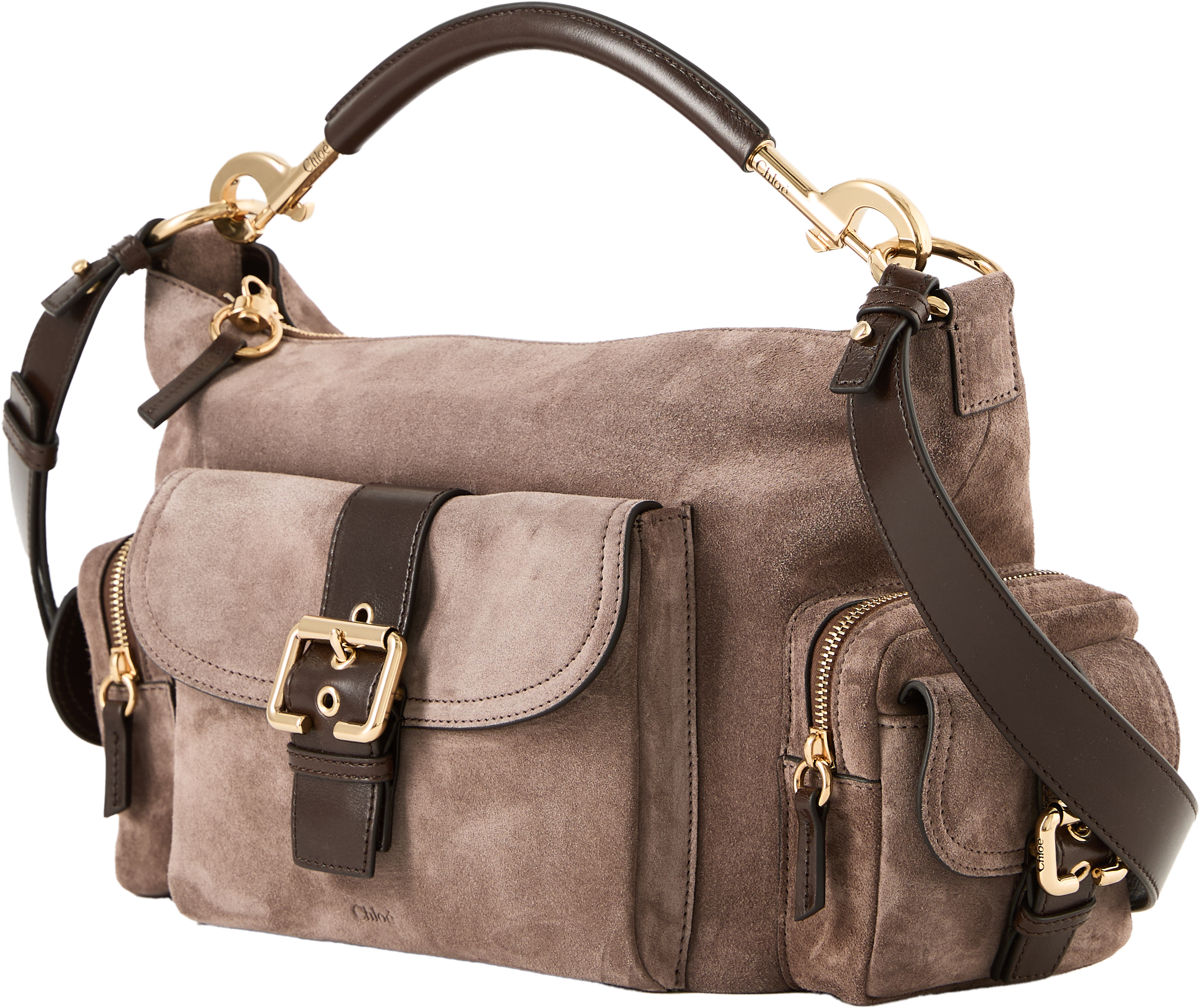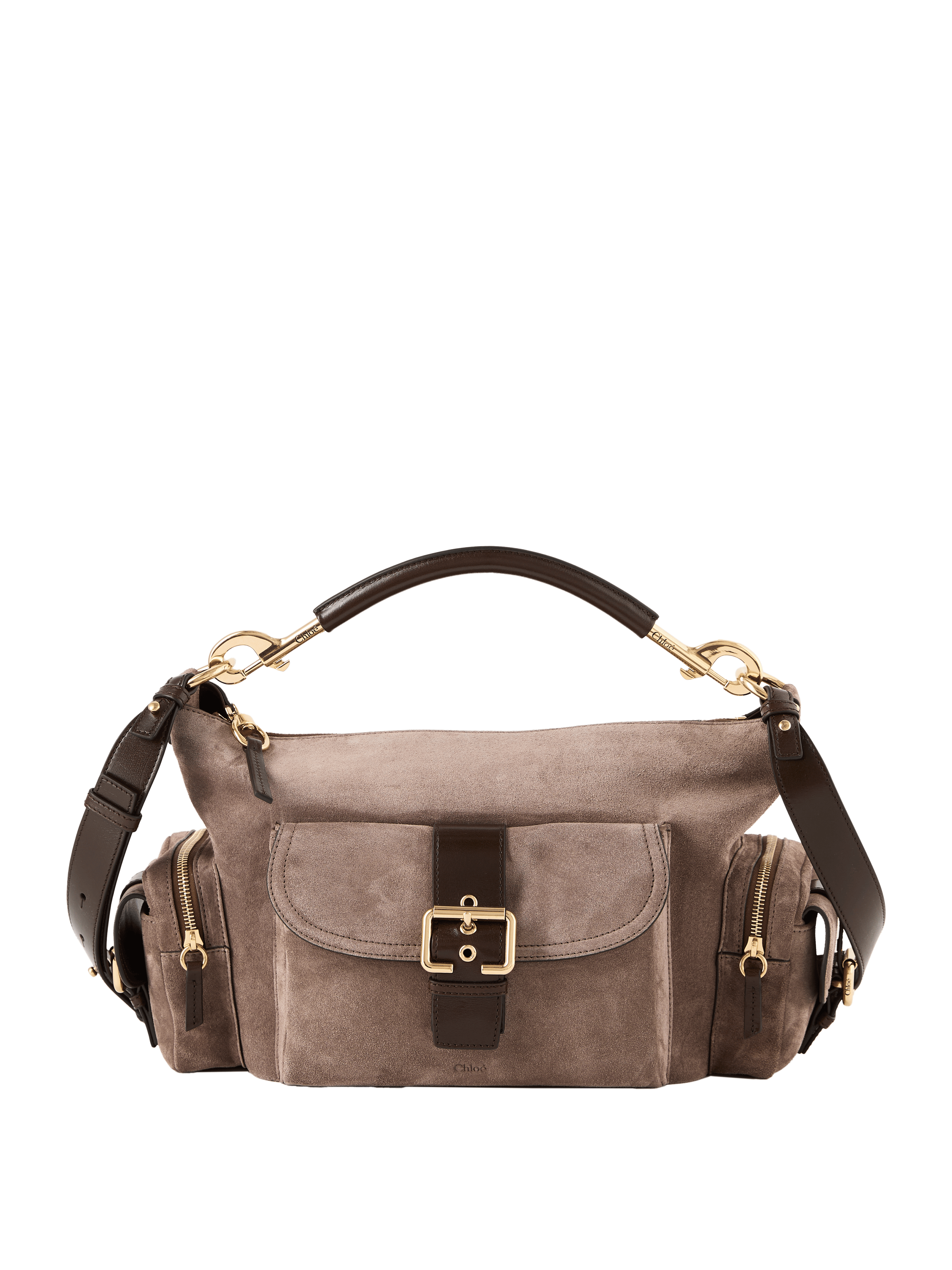 Die Handtasche 'Camera Medium' in Dark Taupe von Chloé wurde aus weichem Kalbs-Veloursleder gefertigt und mit goldener Hardware abgerundet. Der Griff bietet die Tragevariante in der Hand oder über der Schulter. Das geräumige Fach sowie zahlreiche Innenfächer bieten Stauraum für alles, was man im Alltag braucht. Die aufgesetzten Taschen mit den Schnallen runden das Design ab.