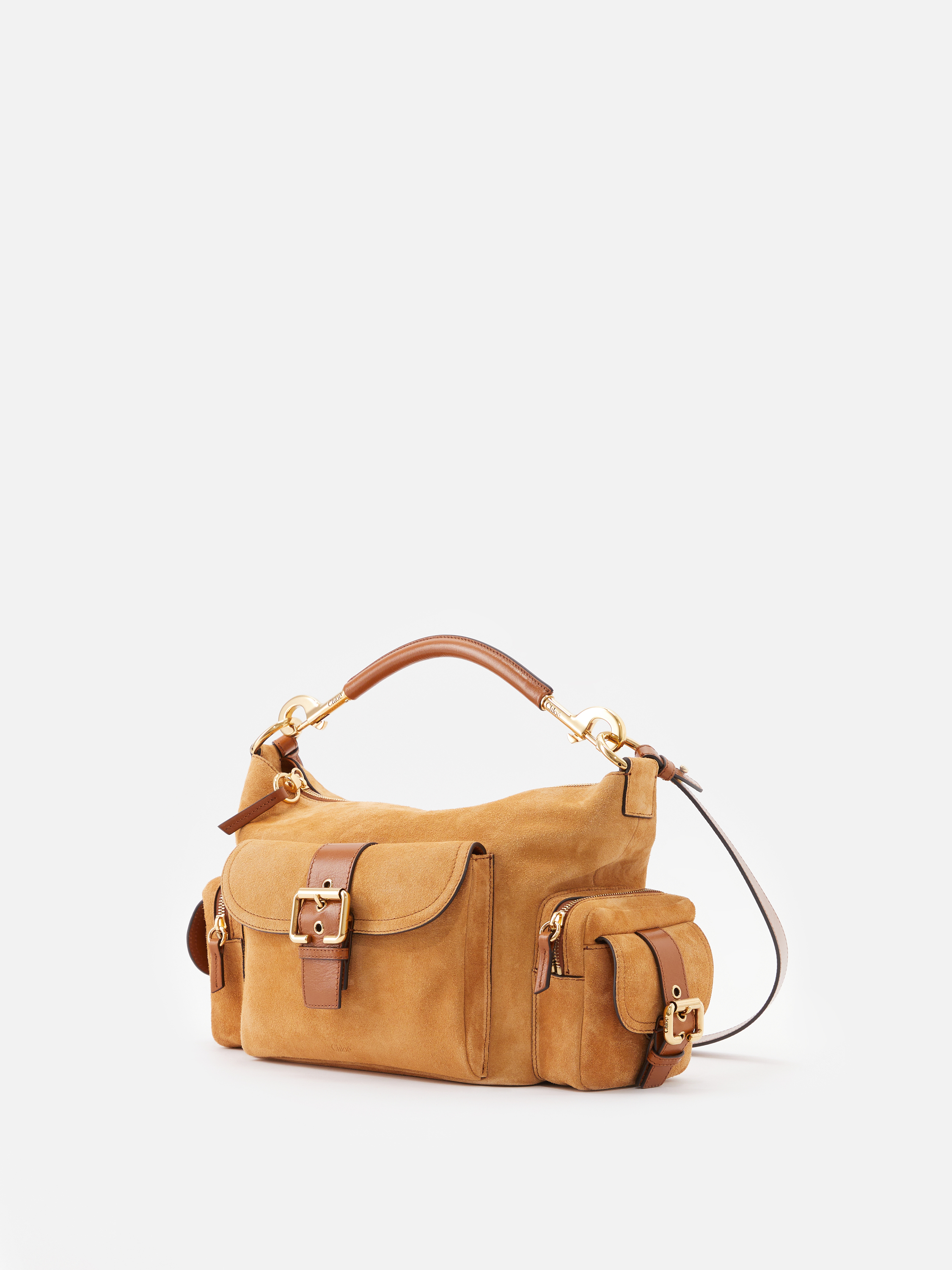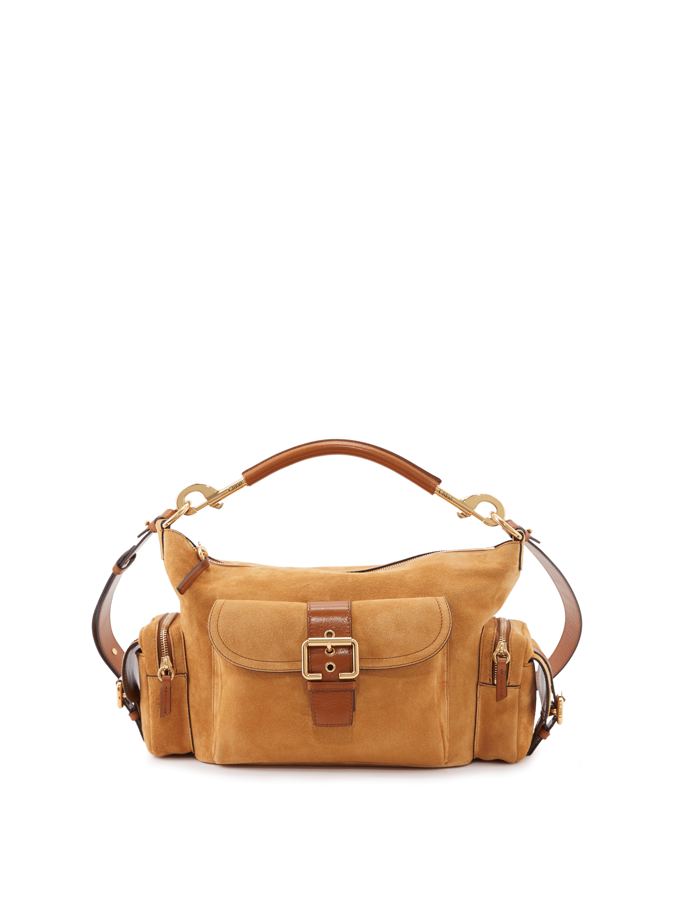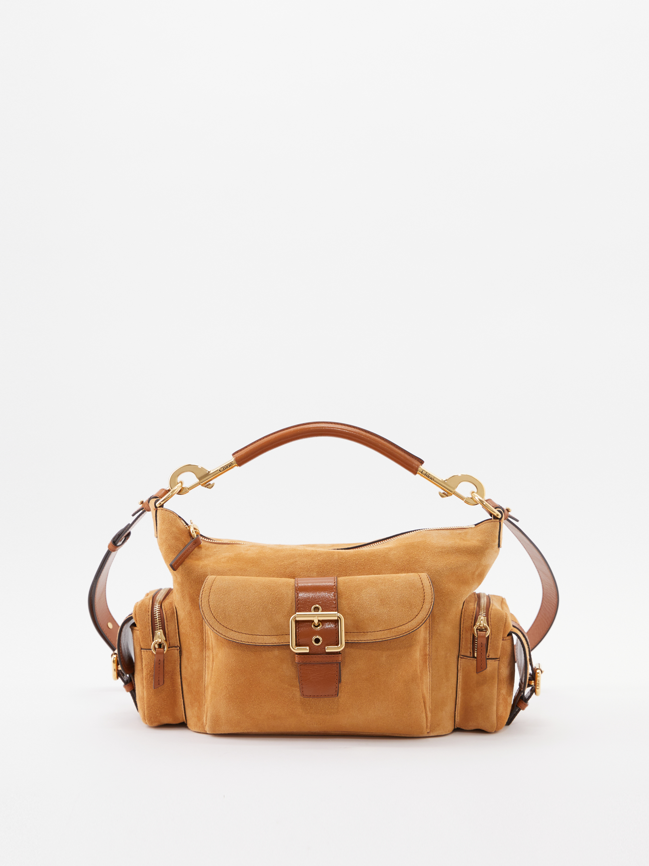 Die Handtasche 'Camera Medium' von Chloé in Tan wurde aus genarbtem Büffelleder gefertigt und mit goldener Hardware abgerundet. Der Griff bietet die Tragevariante in der Hand oder über der Schulter. Das geräumige Fach sowie zahlreiche Innenfächer bieten Stauraum für alles, was man im Alltag braucht. Die aufgesetzen Taschen mit den Schnallen runden das Design ab.
